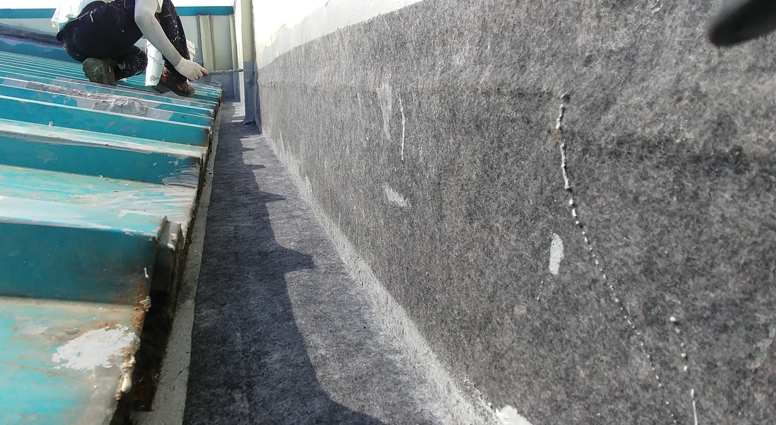 샌드위치판넬 지붕에도 방수시트 작업과 함침 작업을 이어서 진행합니다. 작업에는 질긴 섬유 재질의 방수시트를 사용합니다.