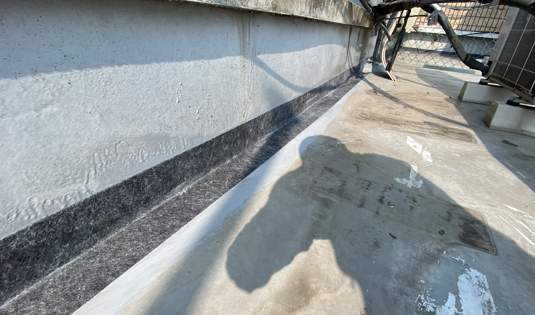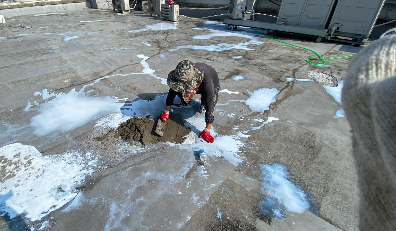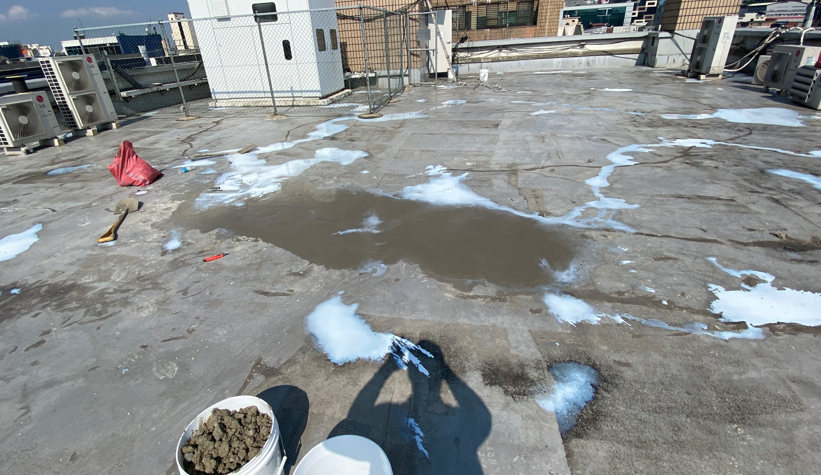 침투 방수액을 잘 말린 후 미장 작업을 진행합니다. 옥상을 살펴보면 단차가 있는 부분이 있습니다. 이 단차를 없애야 방수시트를 완벽하게 부착할 수 있습니다. 미장은 침투 방수액과 몰탈을 적절하게 혼합한 것으로 작업을 진행합니다.