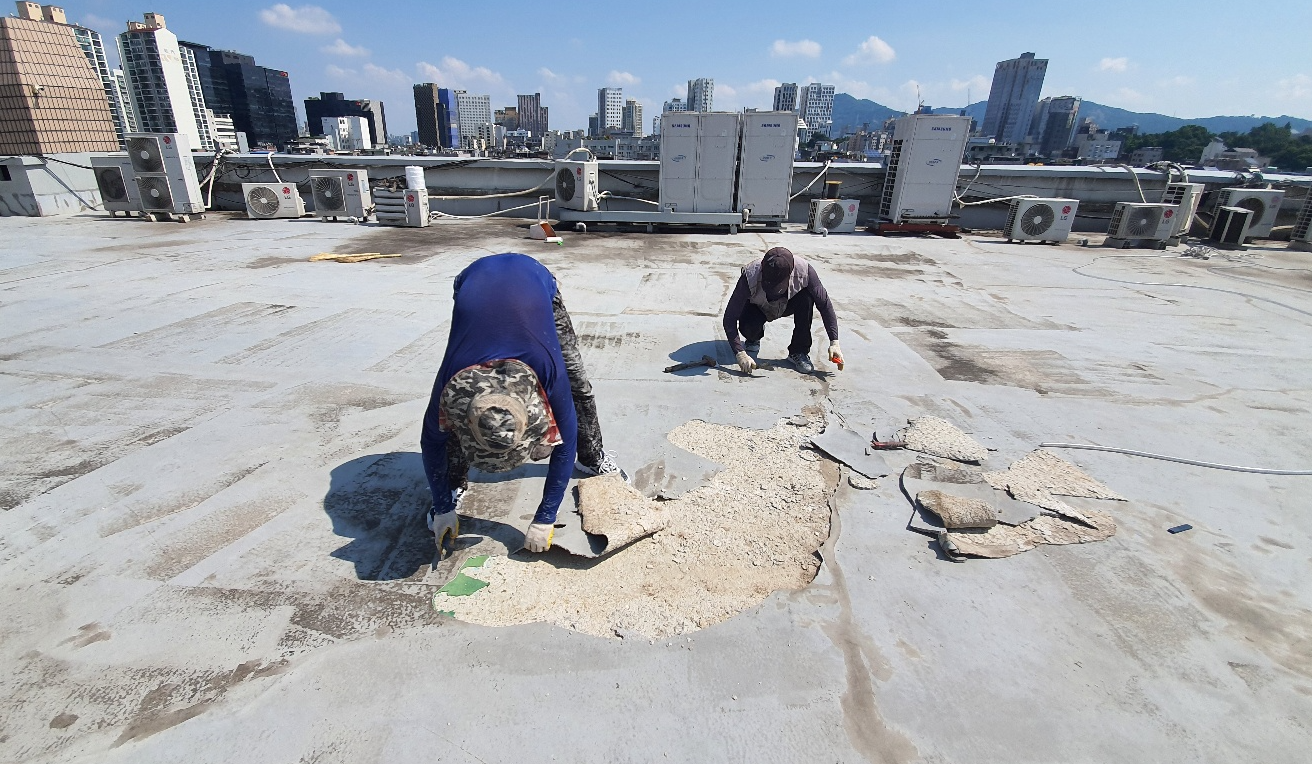 우선 바닥을 정리합니다. 원활한 시공을 위해 옥상을 정리하는 작업입니다. 하자가 심한 부분은 모두 들어내고 계속해서 사용할 수 있을 만한 부분만 남겨둡니다.