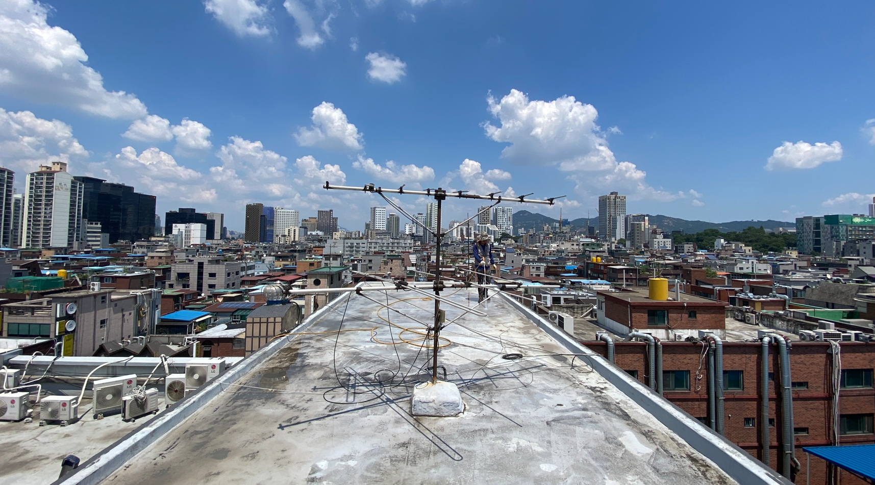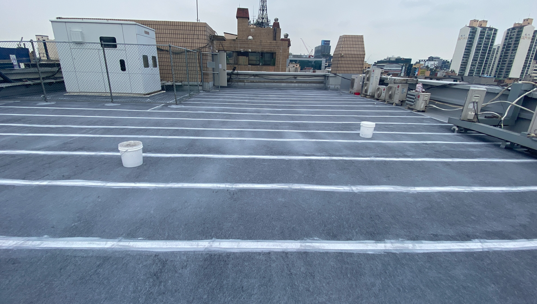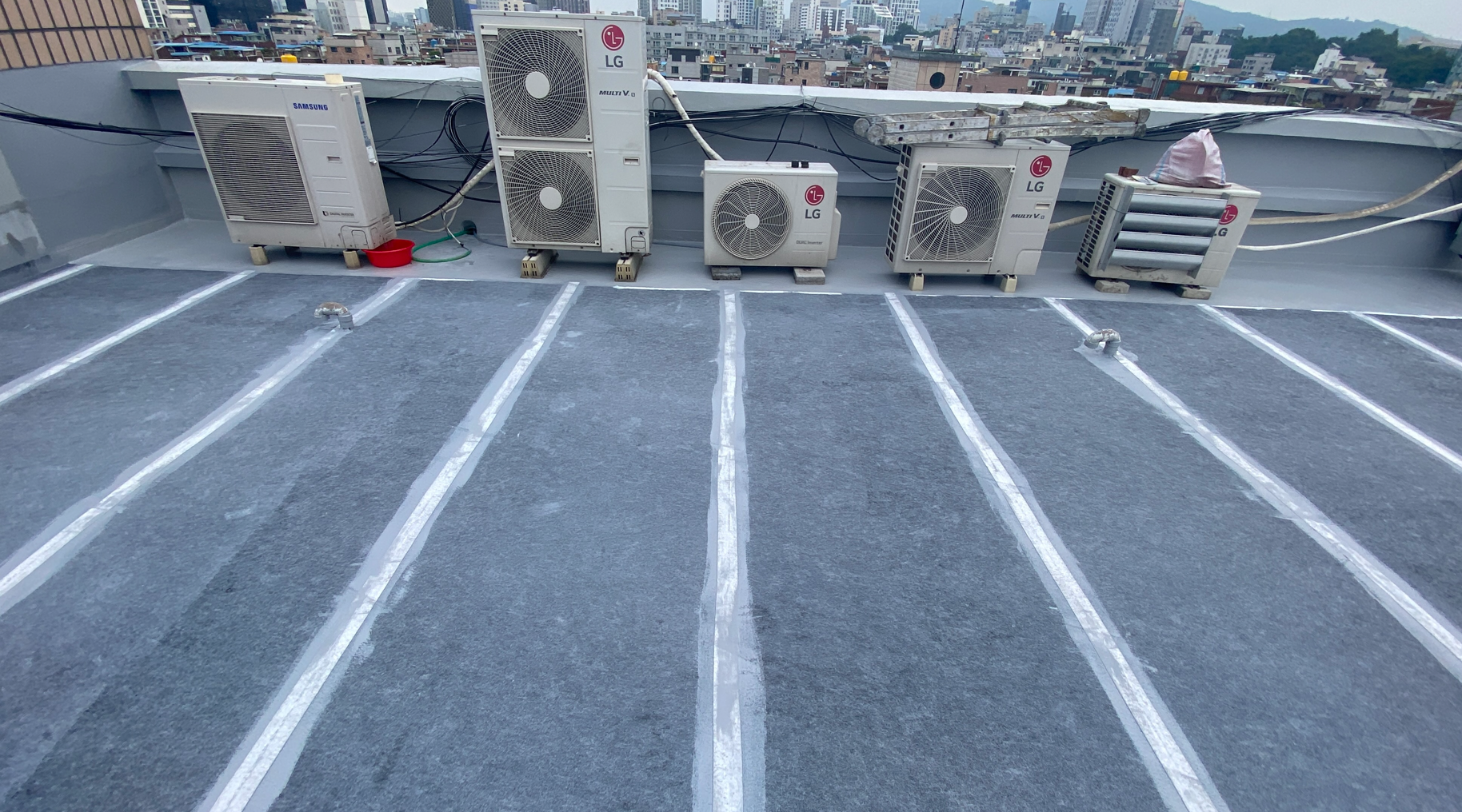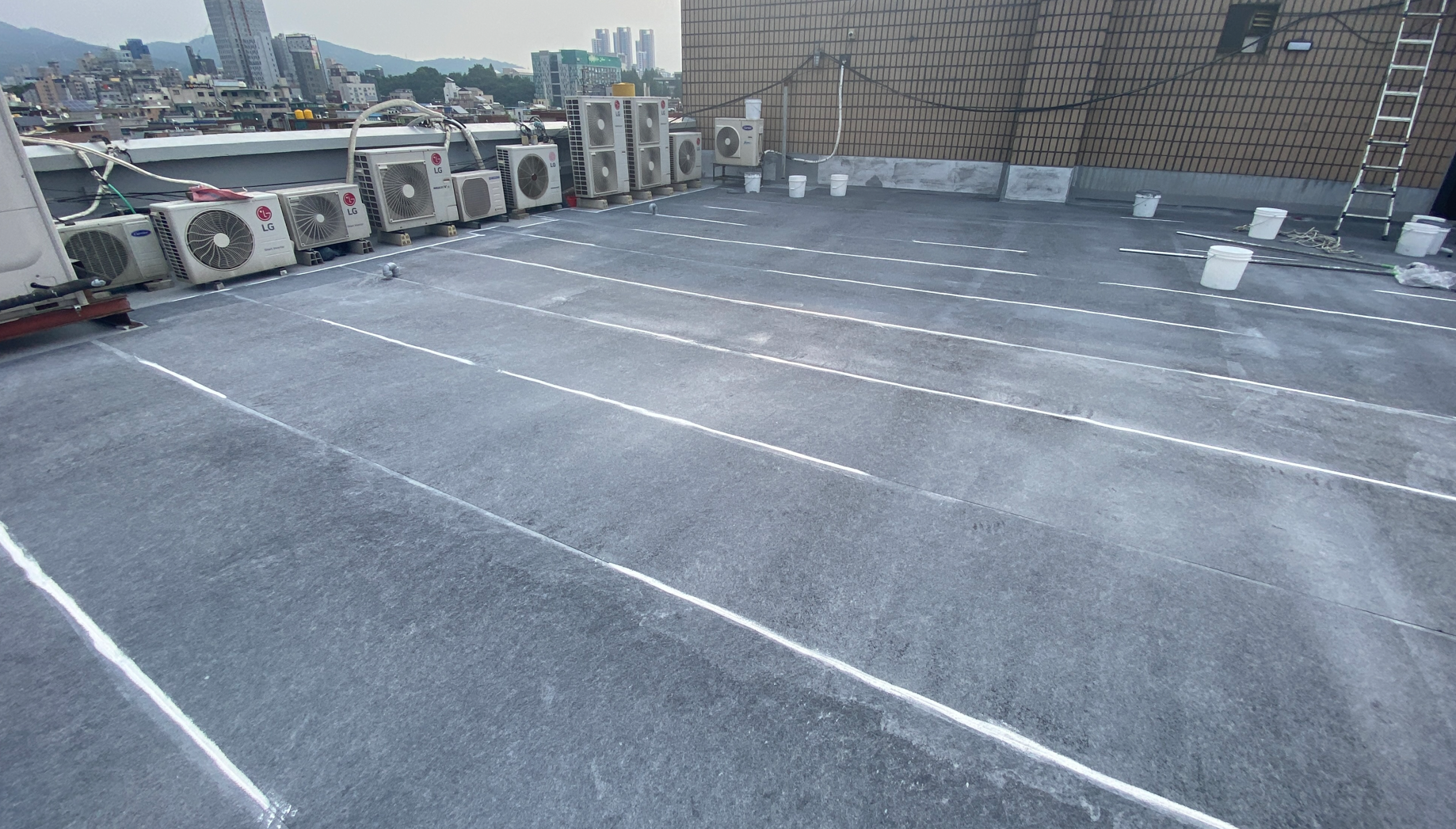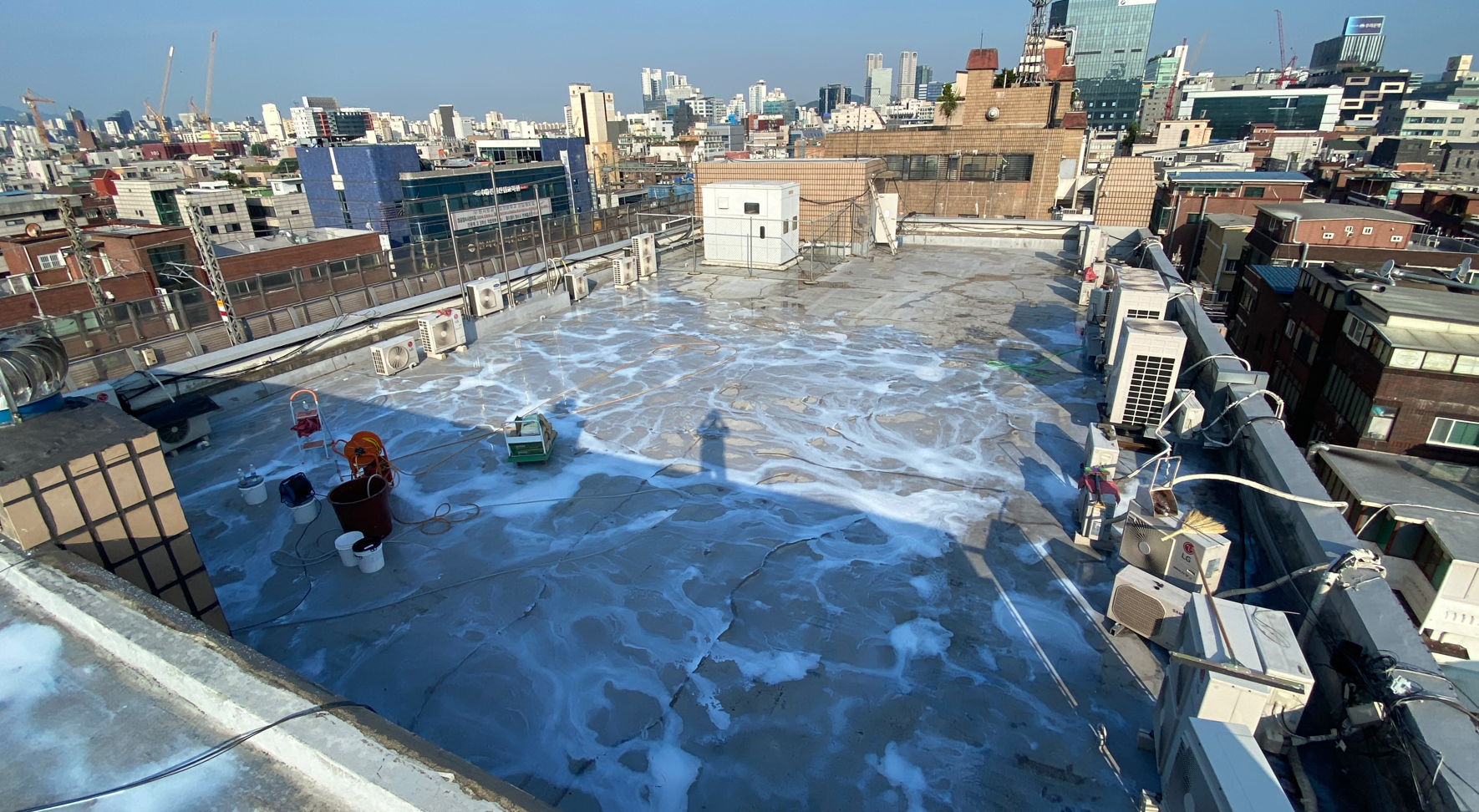 이어서 물청소 작업을 진행합니다. 고압 세척기로 옥상을 깨끗하게 청소하는 작업입니다. 바탕 정리 작업과 물청소 작업을 마치면 본격적으로 방수 시공에 들어갈 준비가 완료됩니다.