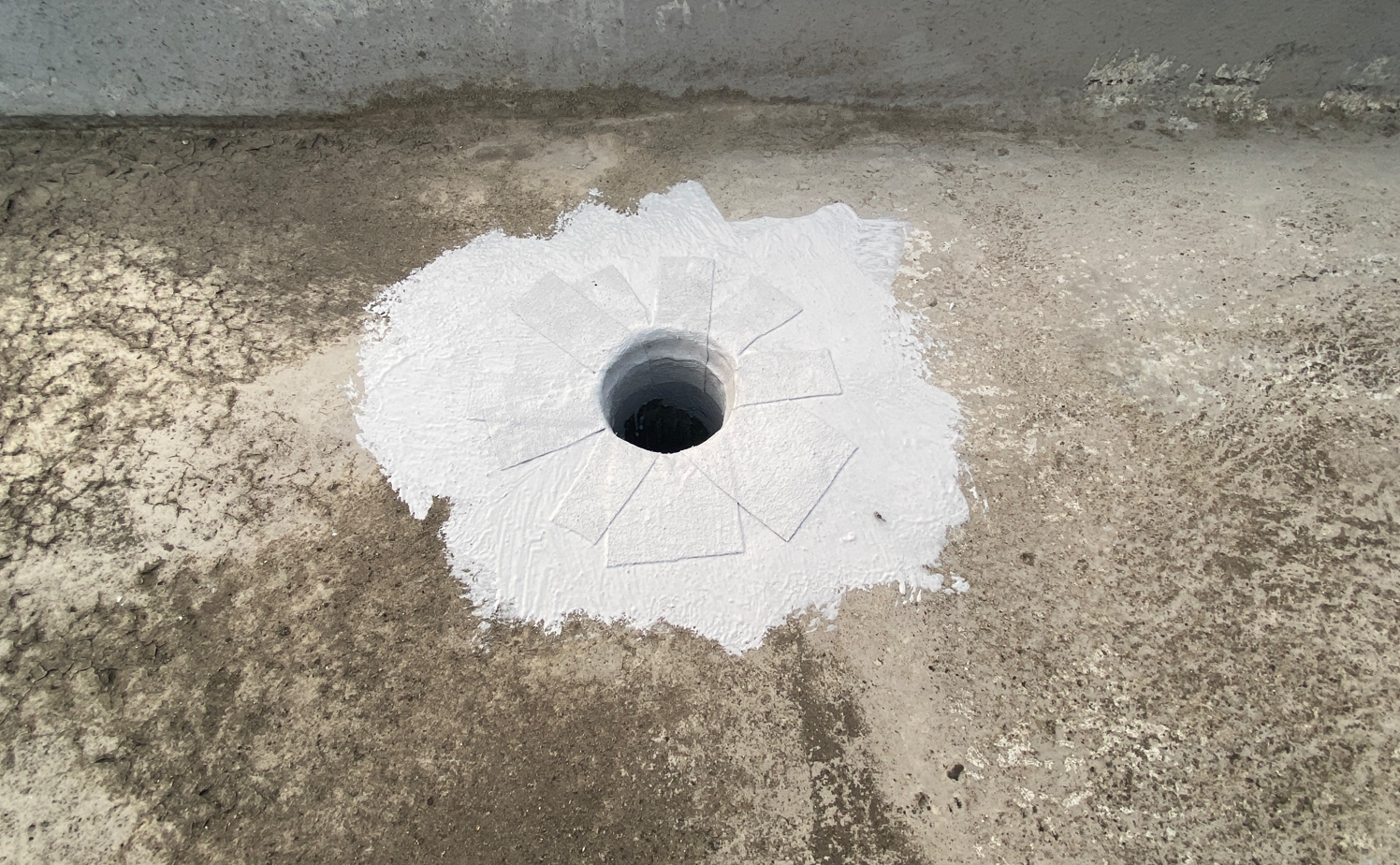 다음으로 기초 시트 작업을 진행합니다. 기초 시트 작업은 방수액과 방수시트를 사용하여 누수에 취약한 부분을 보강하는 작업입니다. 시공 부위에 방수액을 먼저 칠한 후 방수시트를 알맞은 크기로 잘라 붙인 후 다시 방수액을 칠해줍니다.