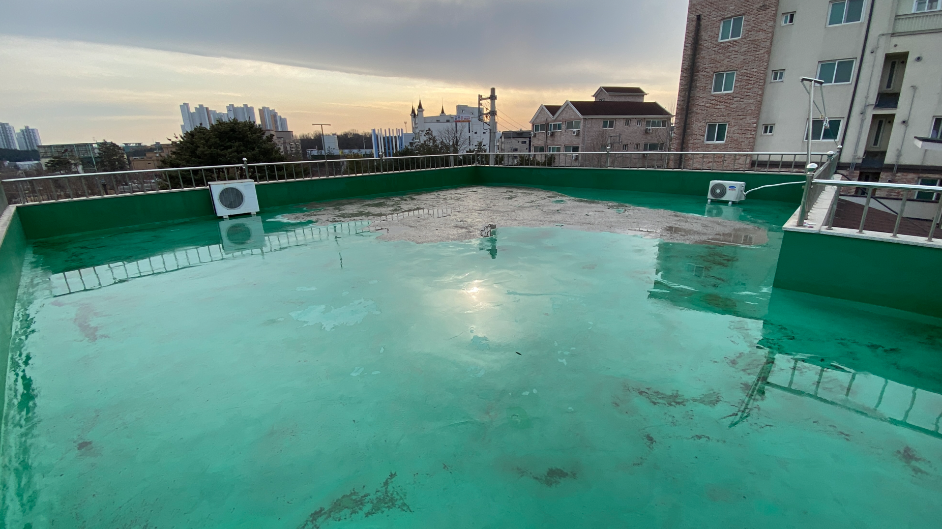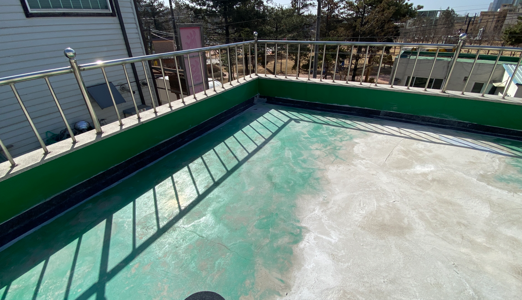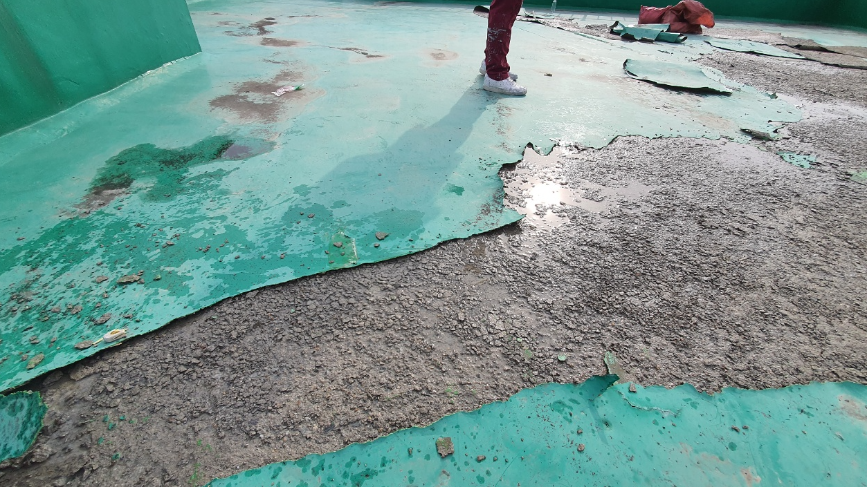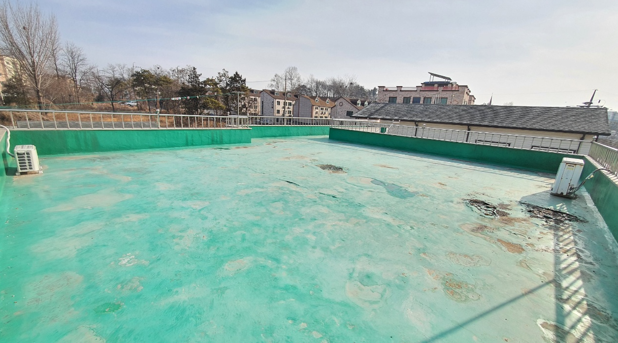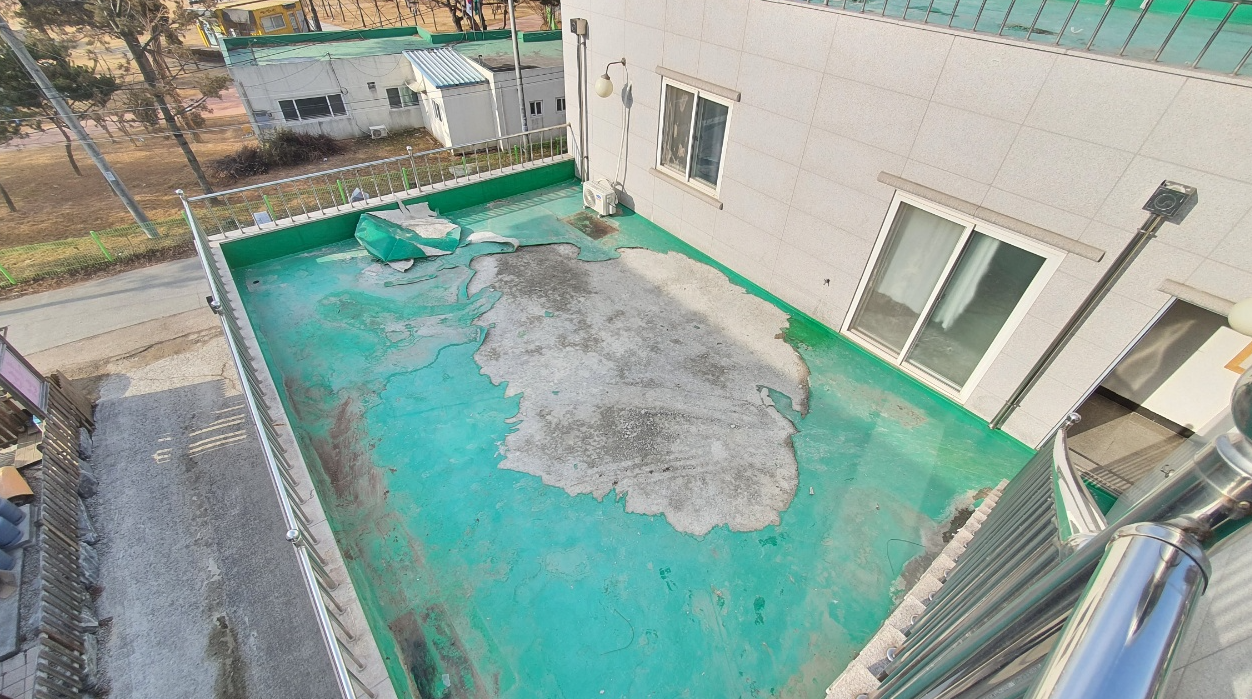 옥상 방수를 시공하기 전 현장의 모습입니다. 기존에 시공한 초록색의 우레탄이 벗겨지고 하자가 발생한 것을 볼 수 있습니다. 이대로 두고 옥상 방수를 이 위에 시공하면 하자가 발생한 곳을 통해 다시 문제가 생길 수 있습니다.