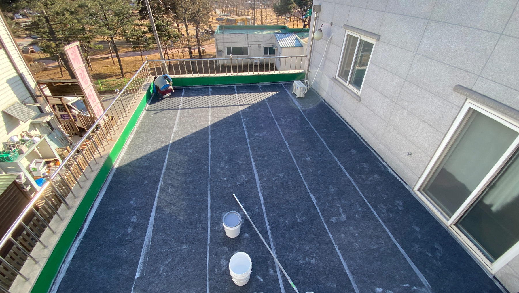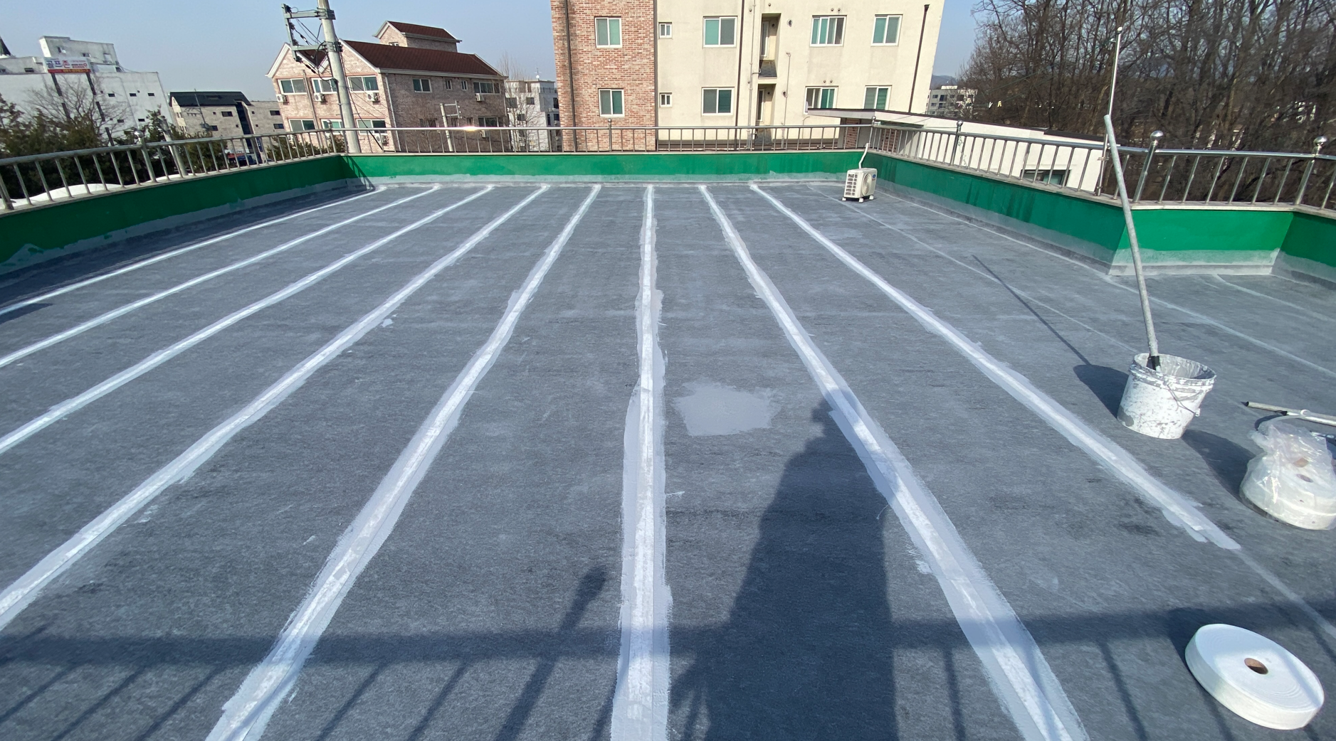 방수시트를 모두 부착한 후 함침 작업에 들어갑니다. 함침 작업은 침투 방수액을 방수시트 위에 도포하는 작업입니다. 침투 방수액은 그대로 방수시트에 스며들어 옥상 바닥과 서로 일체화시키는 역할을 합니다.