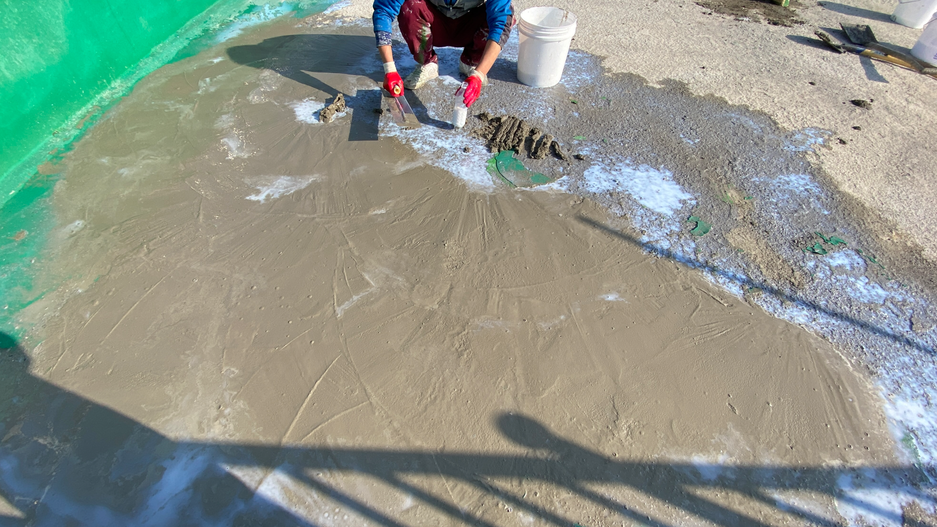 앞서 바닥을 정리할 때나 하자로 인해 생긴 단차에는 미장 작업을 진행합니다. 바닥에 단차가 있으면 크랙을 잡기 위해 방수시트를 부착할 때 작업에 어려움이 있기 때문입니다. 미장은 침투 방수액과 몰탈을 적절한 비율로 혼합하여 작업을 진행합니다.