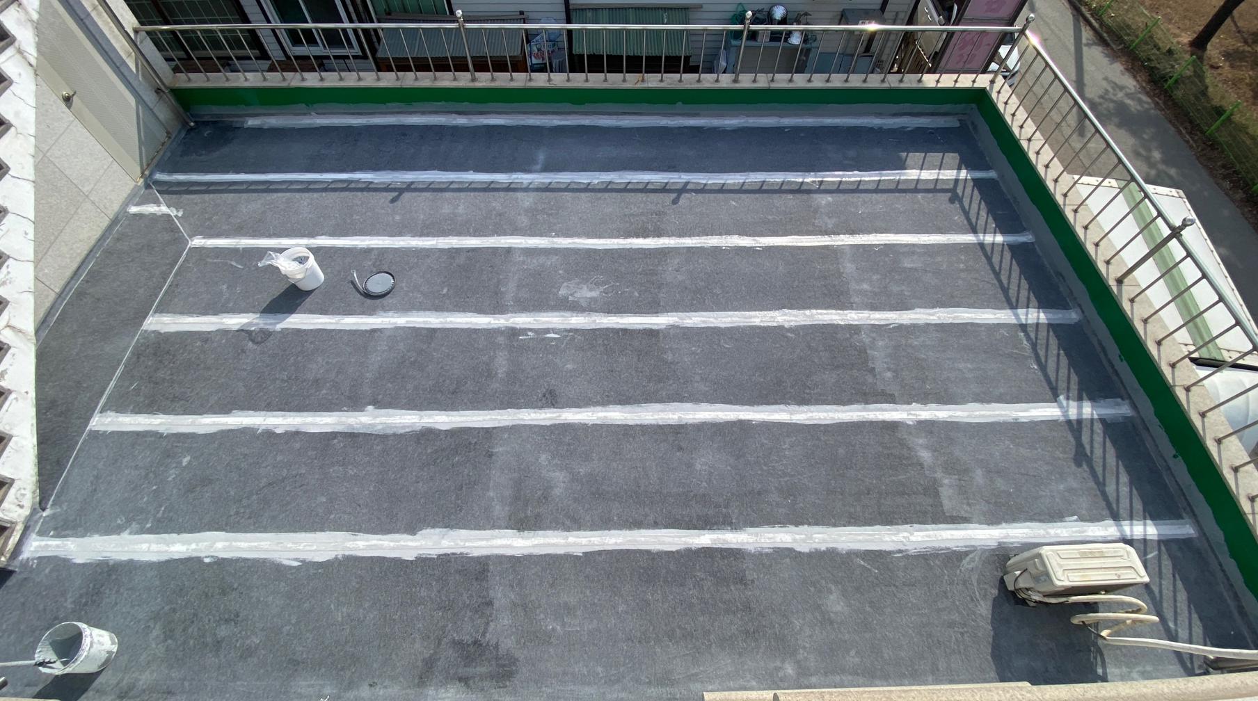 다음은 방수액 도포 작업입니다. 방수시트로 크랙을 확실하게 잡은 후 방수액을 칠해 방수층을 만들기 위한 과정입니다. 이처럼 방수시트와 방수액을 함께 사용하여 옥상 방수를 시공하는 것을 복합 시트 방수라고 합니다. 복합 시트 방수는 기존의 우레탄 방수보다 훨씬 튼튼한 옥상을 만들 수 있다는 장점이 있습니다.