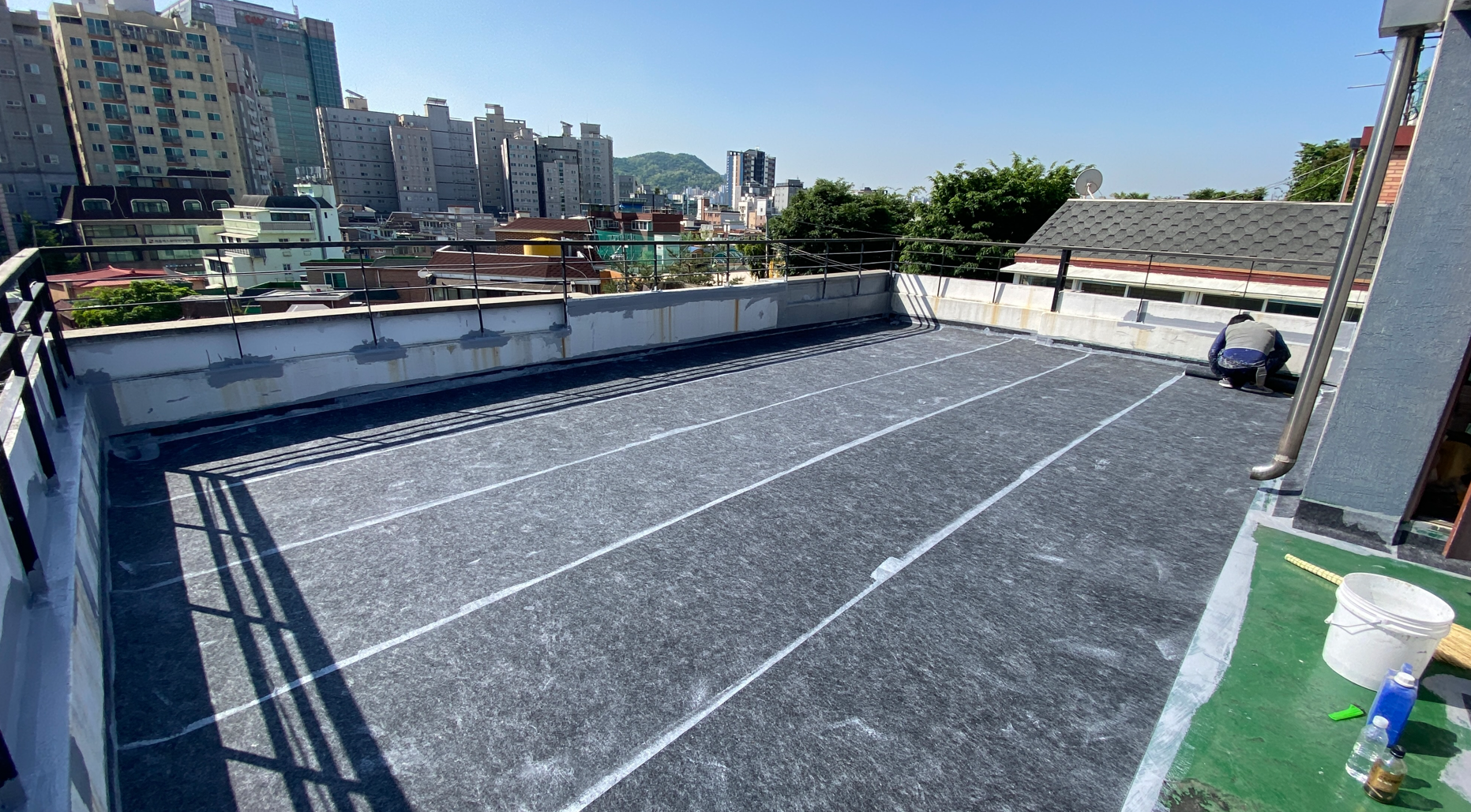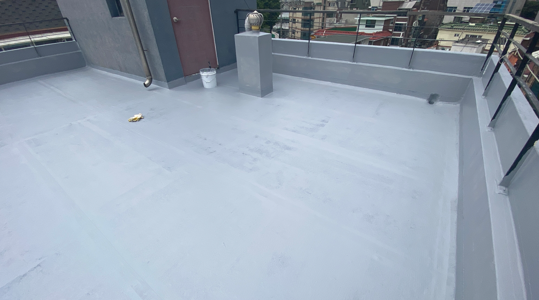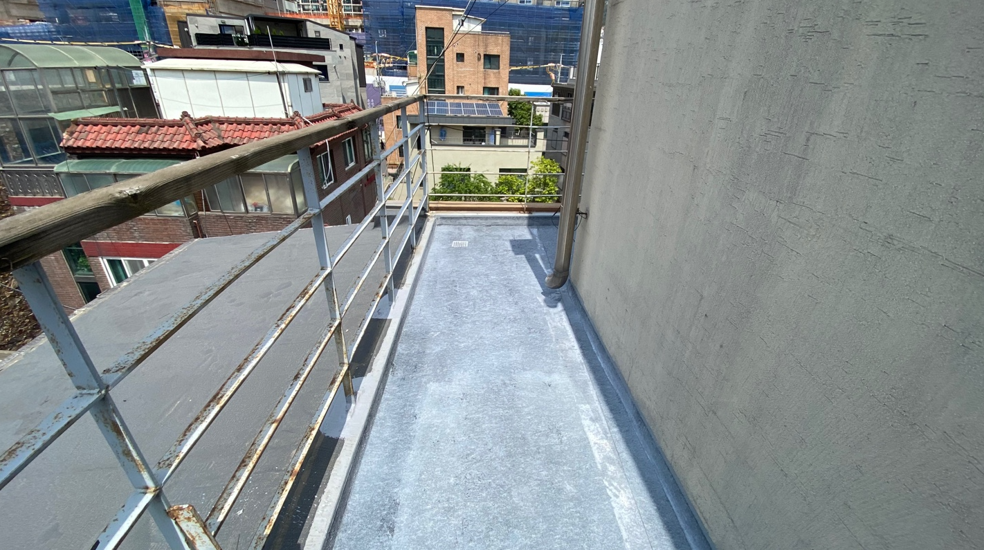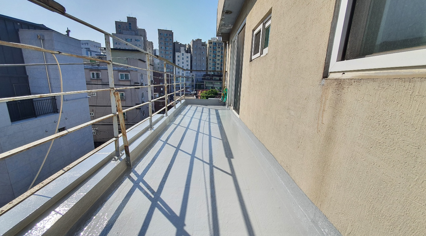 마지막으로 자외선을 차단하기 위한 상도 작업을 마치면 모든 작업이 마무리됩니다. 이처럼 우레탄 방수의 하자를 해결하기 위한 다른 방법으로 방수액과 방수시트를 함께 사용하는 복합 시트 방수를 시공한다면 하자 없이 튼튼하고 오래가는 옥상을 만들 수 있습니다. 완성된 옥상은 반영구적인 방수 수명을 갖게 되고 추후에 옥상에 상처가 나더라도 그 부분만 고쳐 계속해서 사용할 수 있습니다.