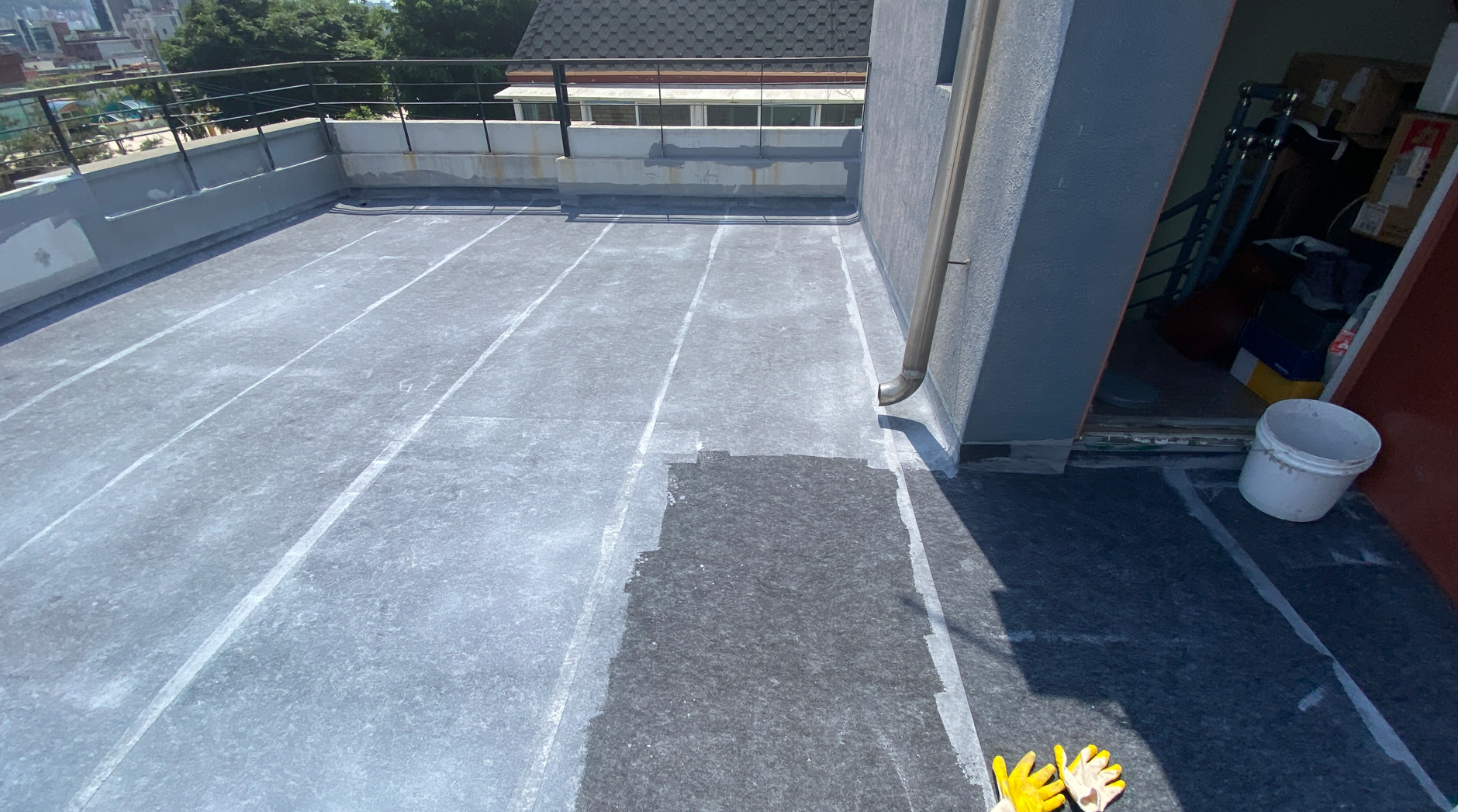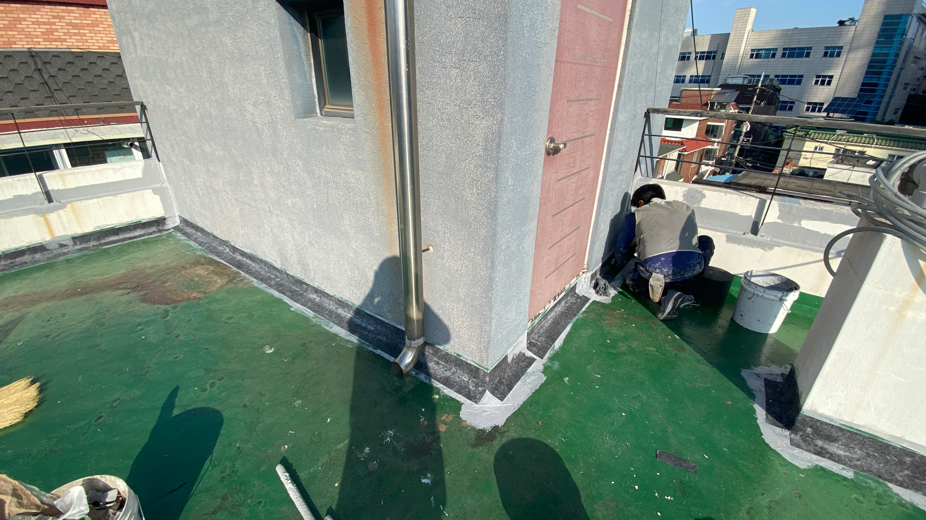미장에 이어 프라이머 작업까지 마친 후 기초 시트 작업을 진행합니다. 기초 시트 작업은 크랙이 자주 발생하는 우수관과 조인트 부분을 보강하기 위한 작업으로 방수액과 방수시트를 함께 사용하여 작업합니다.