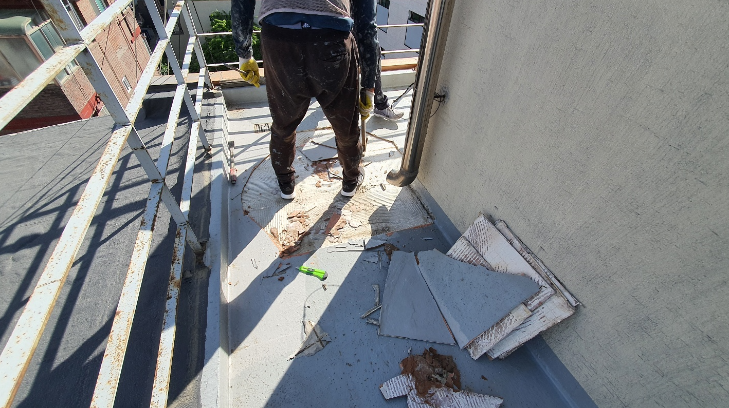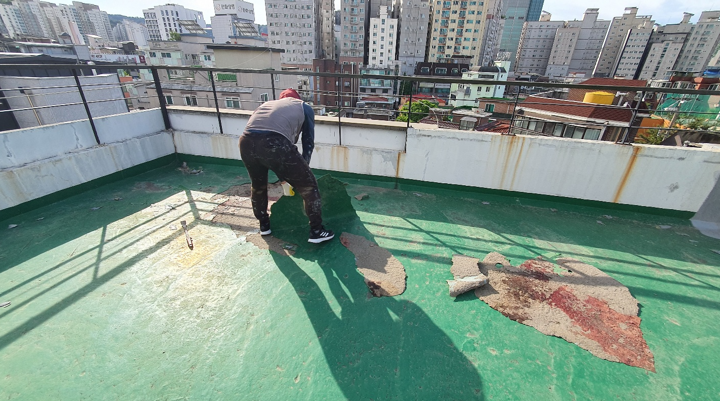 옥상의 크랙을 해결하기 위해서는 방수시트를 부착하는 것이 좋습니다. 방수시트가 크랙을 확실하게 고정하여 다시 갈라지지 않도록 하는 역할을 하기 때문인데요. 그전에 우선 옥상 바닥을 정리합니다. 간단하게 옥상을 쓸어내고 하자가 심한 부분은 제거하고 계속해서 쓸 수 있는 부분은 남겨두는 작업입니다.