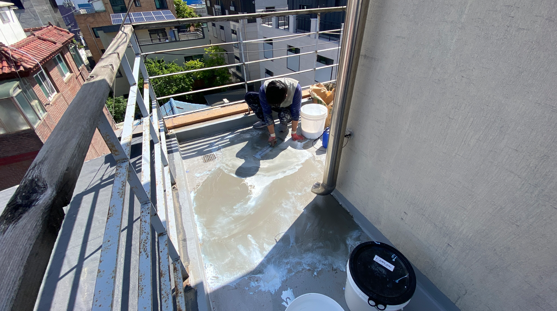 바닥을 정리하고 물청소까지 마친 후 미장 작업에 들어갑니다. 미장 작업은 단차가 심한 부분을 평평하게 만들어 방수시트를 부착할 때 보다 원활한 작업을 하기 위한 과정입니다. 미장은 침투 방수액과 몰탈을 적절한 비율로 혼합하여 작업을 진행합니다.