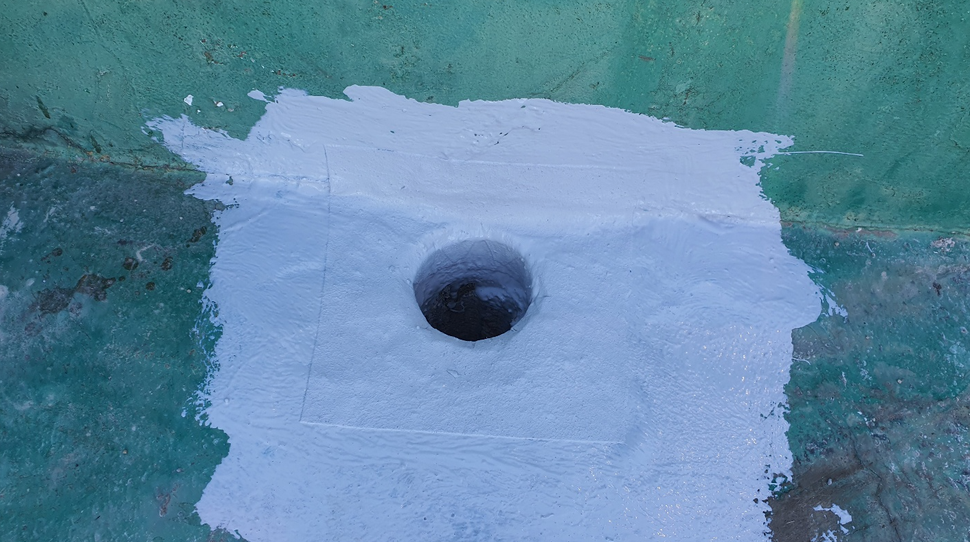 누수가 자주 발생하는 조인트 부분과 우수관에도 기초 시트 작업을 진행합니다. 벽체와 작업한 것과 같이 방수액과 방수시트로 작업합니다. 방수액을 먼저 칠한 후 방수시트를 부착하고 방수액을 다시 칠해 마무리합니다.