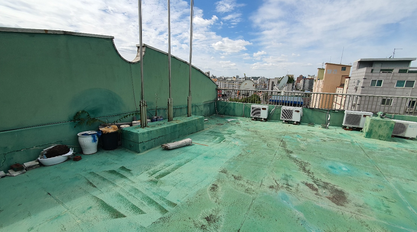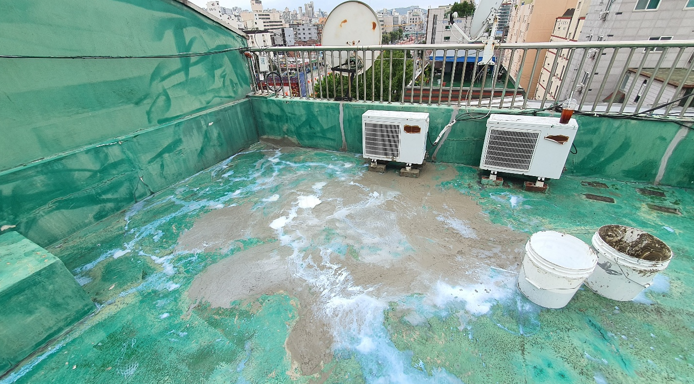 벽체나 바닥 등에 생긴 크랙에 우레탄으로 덧칠을 하거나 실리콘을 사용해 보수에도 얼마 못 가 하자가 재발하게 됩니다. 우선 본격적인 시공 전에 계속해서 쓸 수 있는 부분만 남기고 하자가 심한 부분을 모두 제거합니다. 다음으로 물청소를 진행하여 옥상을 깨끗하게 만들어줍니다.