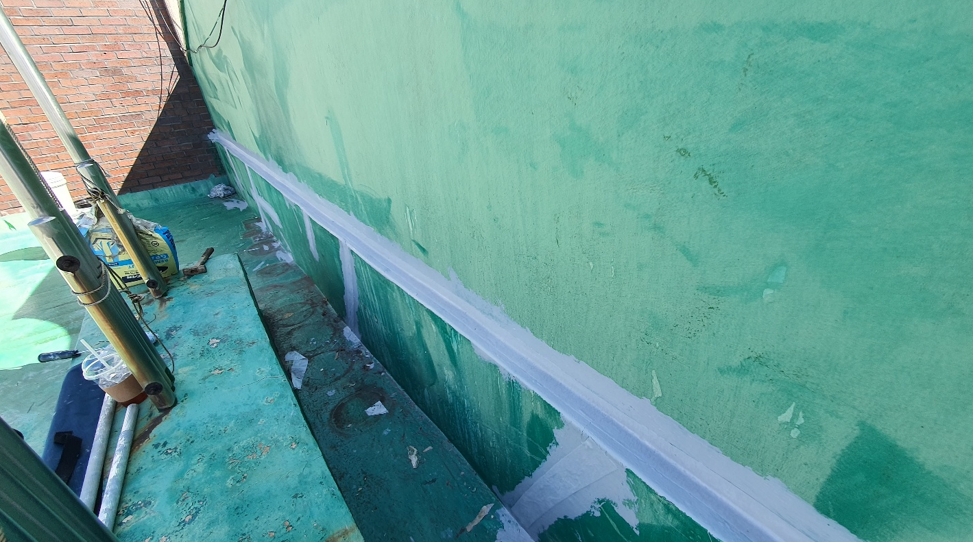 이제 방수시트 작업은 모두 마쳤으니 방수액을 도포할 차례입니다. 작업에는 친환경 무기질 방수액을 사용하기 때문에 인체에 무해하고 자극적인 냄새가 없습니다. 방수액은 총 3차례 도포하여 방수층을 만들어 줍니다.