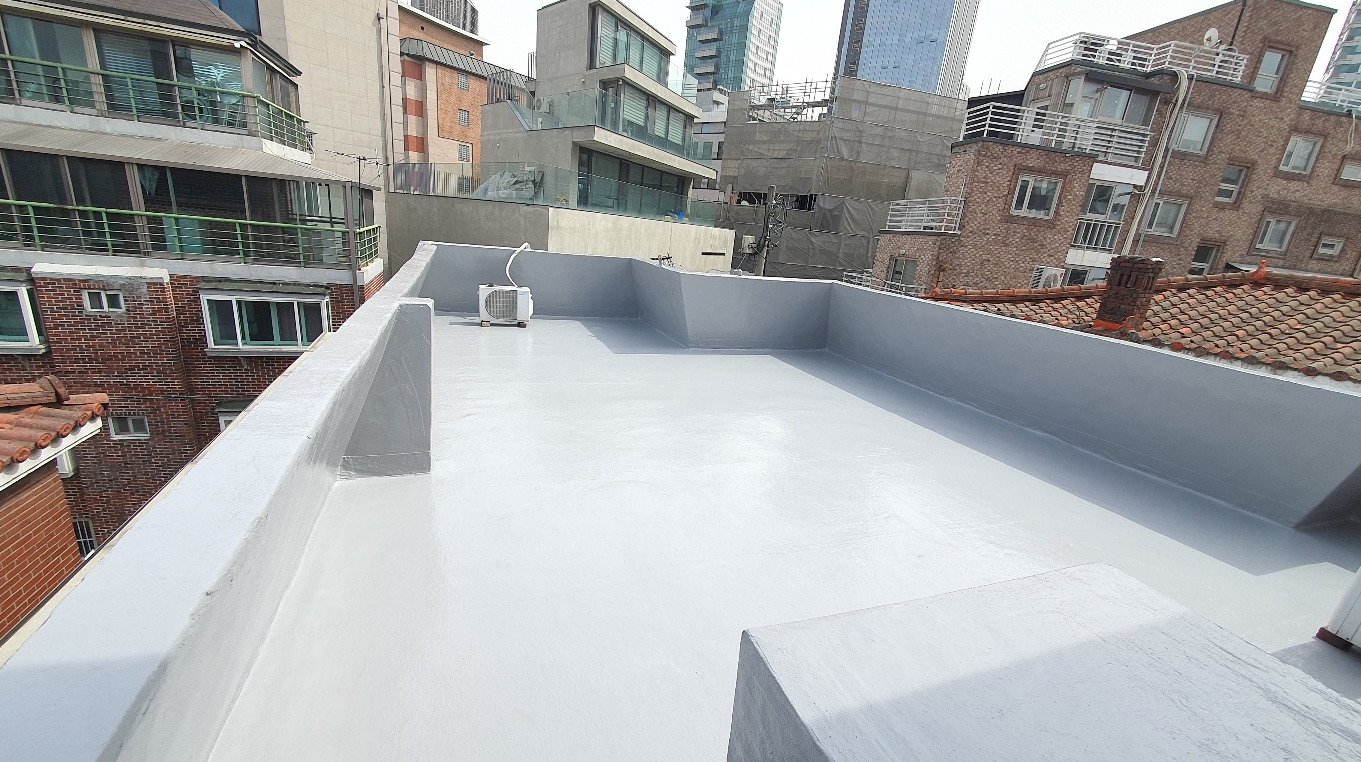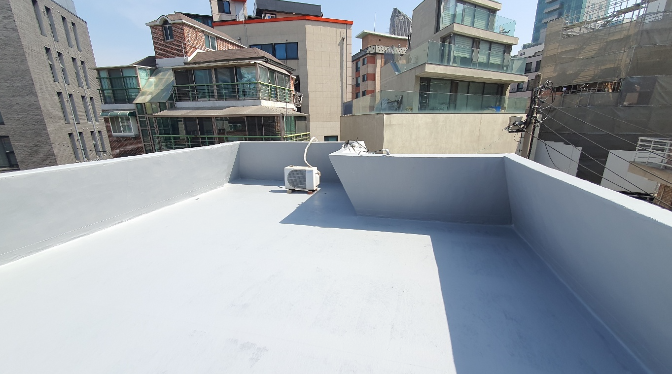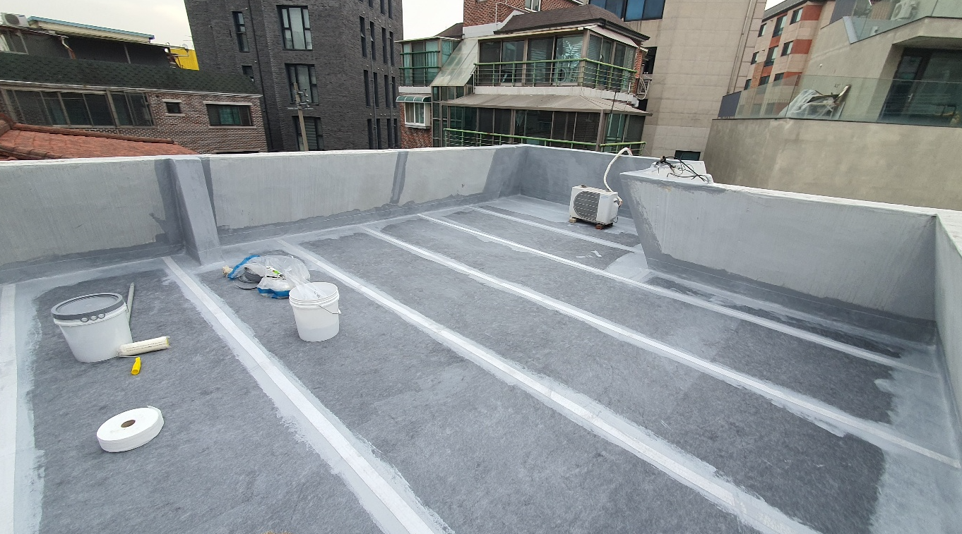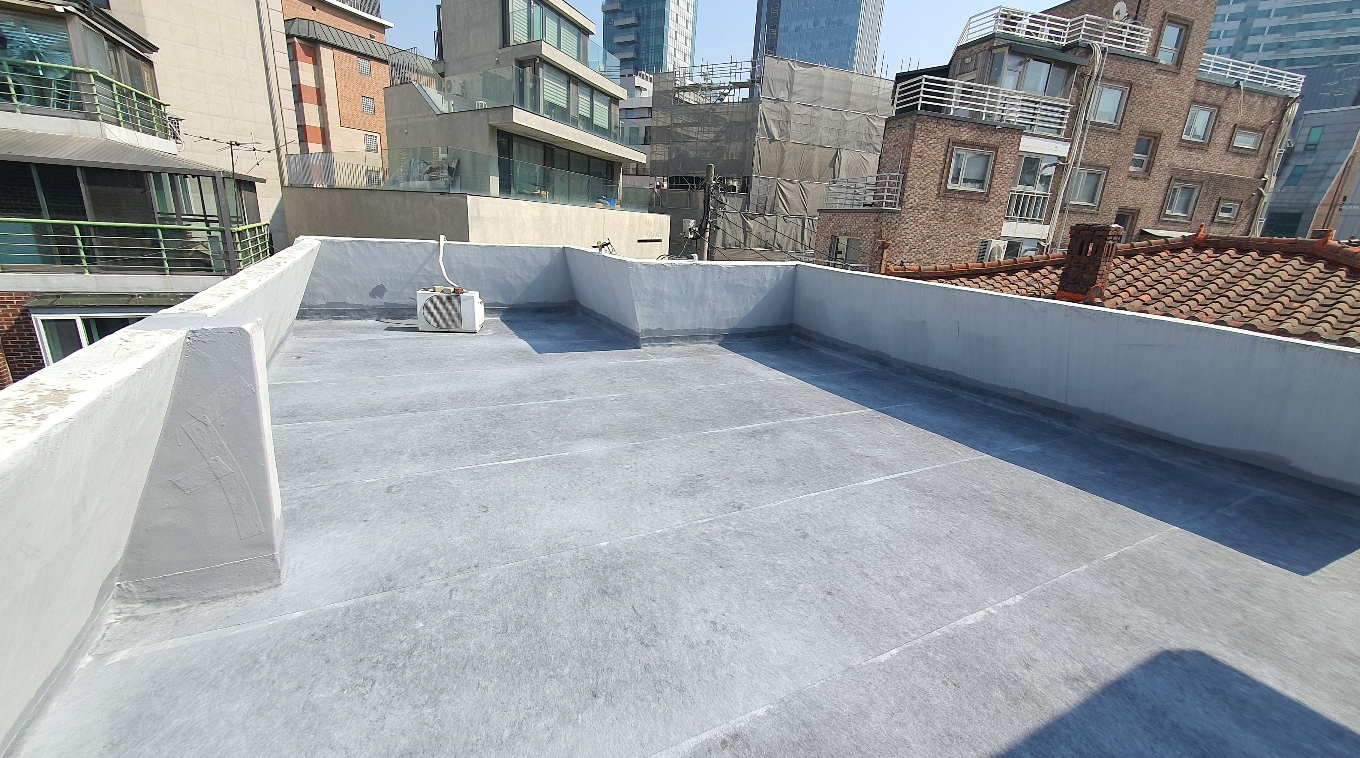 마지막으로 자외선을 차단하고 방수층을 보호하기 위해 상도 작업을 진행합니다. 상도는 물이 고이는 곳에 필히 칠하는 것이 좋습니다. 도막방수의 단점을 보완하기 위해 방수 시트를 사용하여 크랙을 잡으면 옥상의 방수력을 확실하게 올릴 수 있습니다. 완성한 옥상은 상처가 나더라도 그 부분만 고쳐 계속해서 사용할 수 있습니다.
