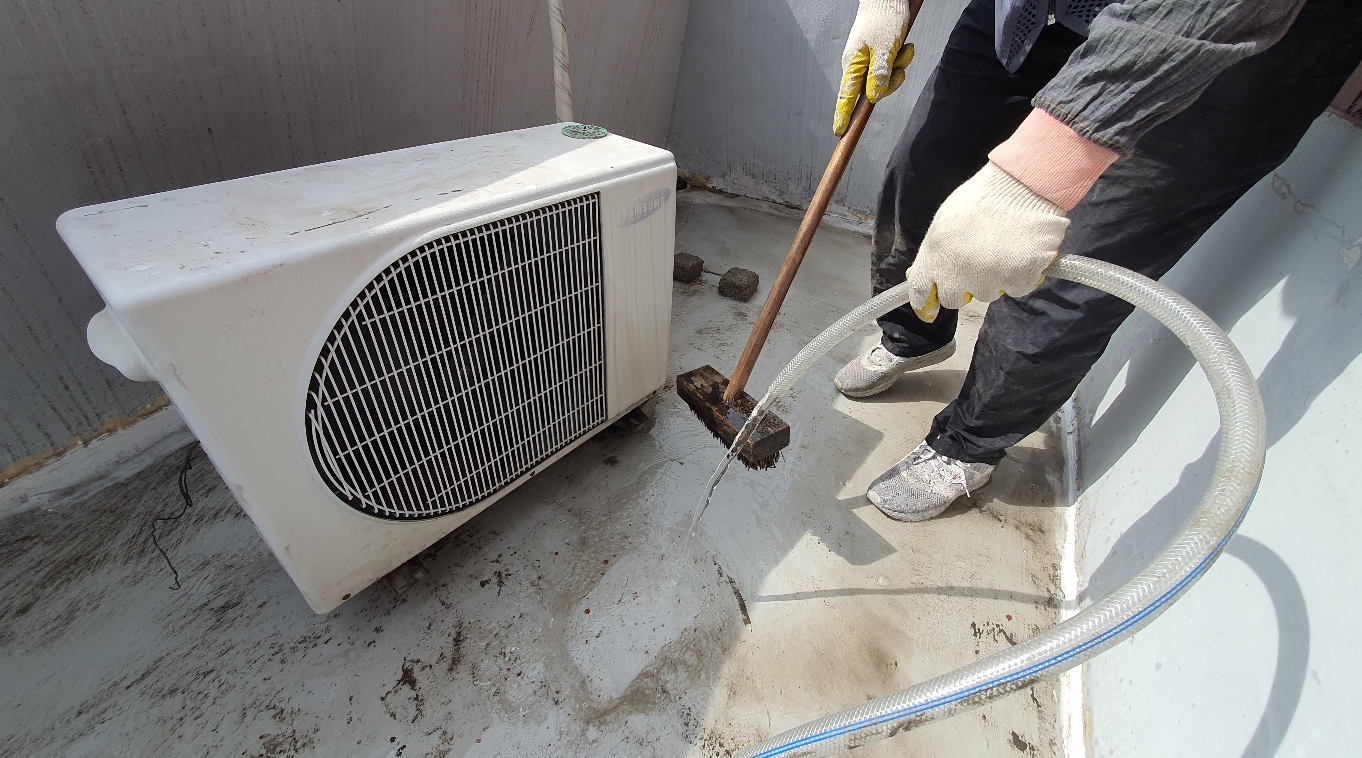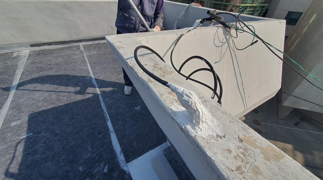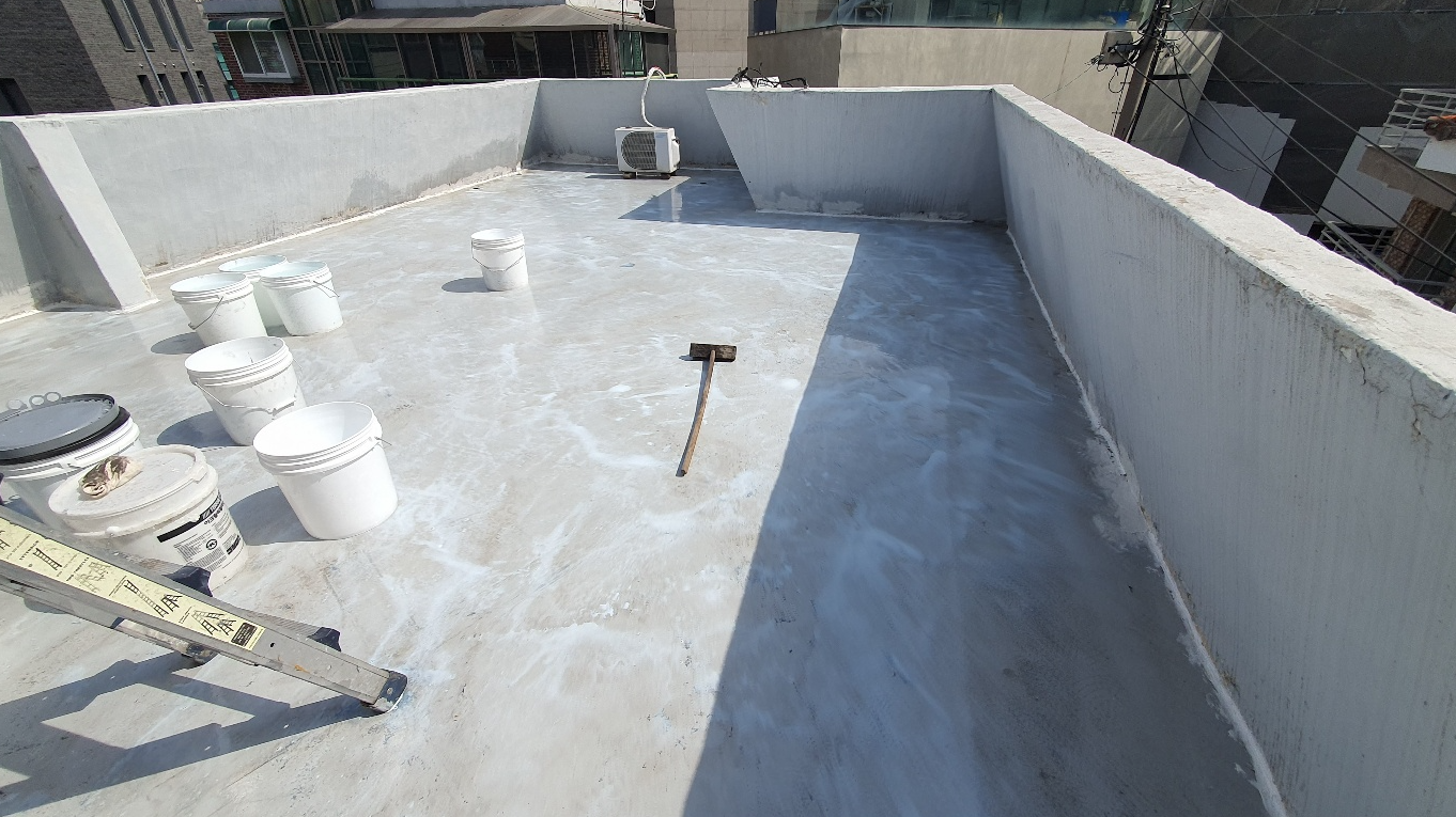 바탕 정리 작업 다음으로 물청소 작업을 진행합니다. 옥상 바닥의 먼지와 이물질을 제거하기 위한 작업입니다. 바탕 정리 작업과 물청소 작업을 마치면 기초적인 밑 작업이 마무리됩니다.