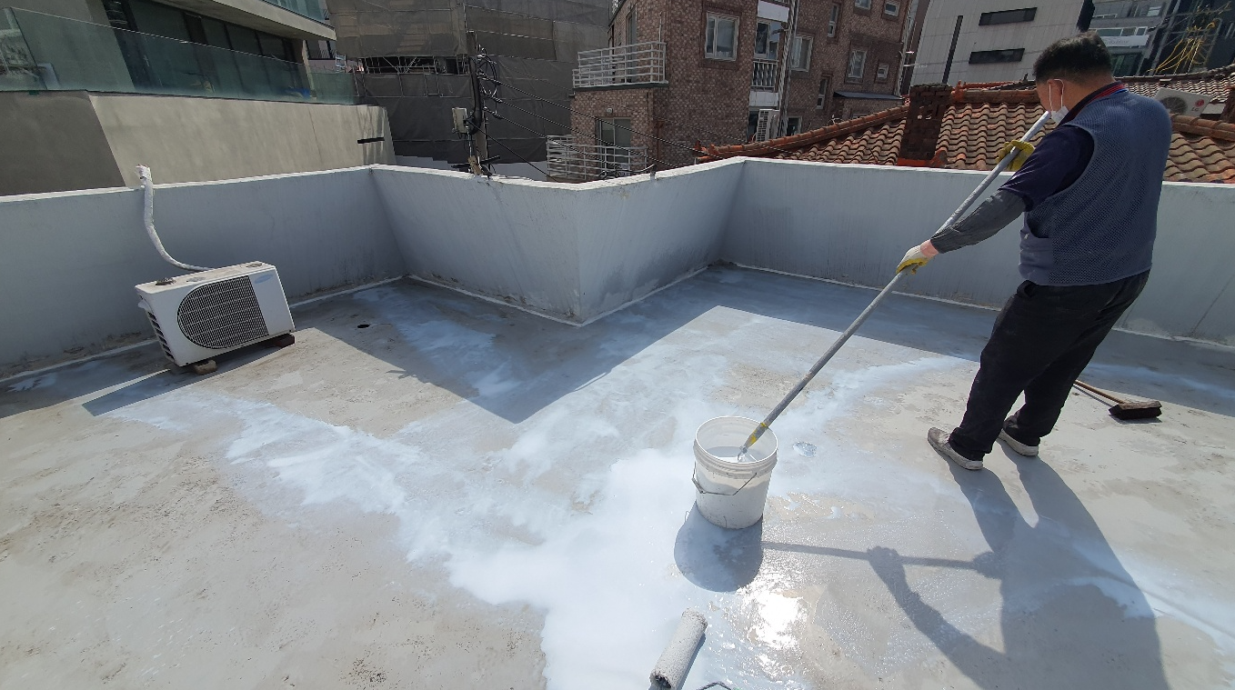 다음은 프라이머 작업입니다. 침투 방수액을 옥상 바닥 전체에 도포하는 작업으로 기초적인 방수 효과를 주고 미세하게 남은 먼지와 이물질을 제거하기 위한 과정입니다.
