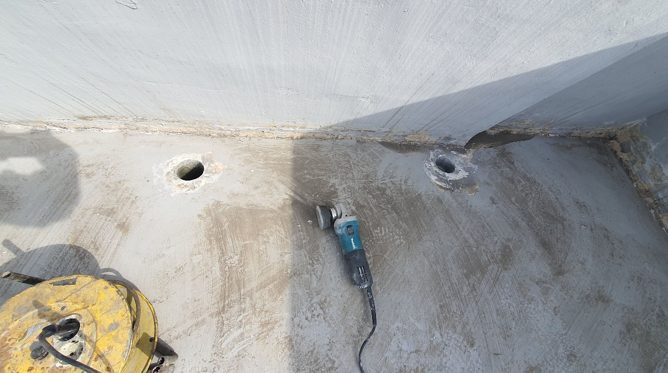 옥상 바닥에 방수 시트를 부착하기 위해서는 먼저 바닥을 깨끗하게 정리하는 것이 좋습니다. 원활한 시공을 위해 바탕 정리 작업을 진행합니다. 시공에 방해가 되는 부분은 칼과 그라인더 등의 도구를 사용하여 깔끔하게 제거합니다.