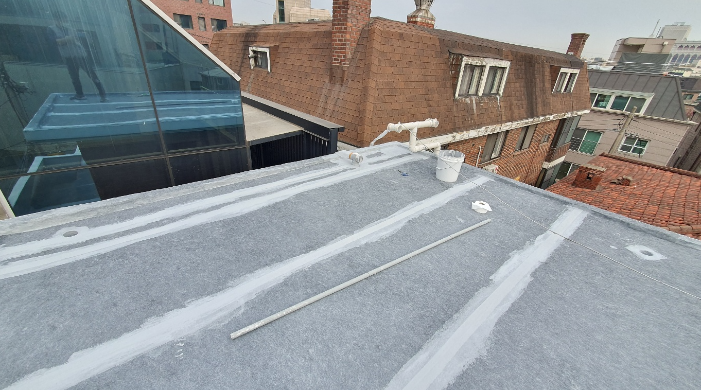 누수에 취약한 우수관과 조인트 부분에는 하자가 자주 발생합니다. 이렇게 누수에 취약한 부분에는 방수액과 방수 시트로 보강 작업을 해주는 것이 좋습니다. 방수액을 먼저 칠한 후 방수 시트를 알맞게 부착합니다.