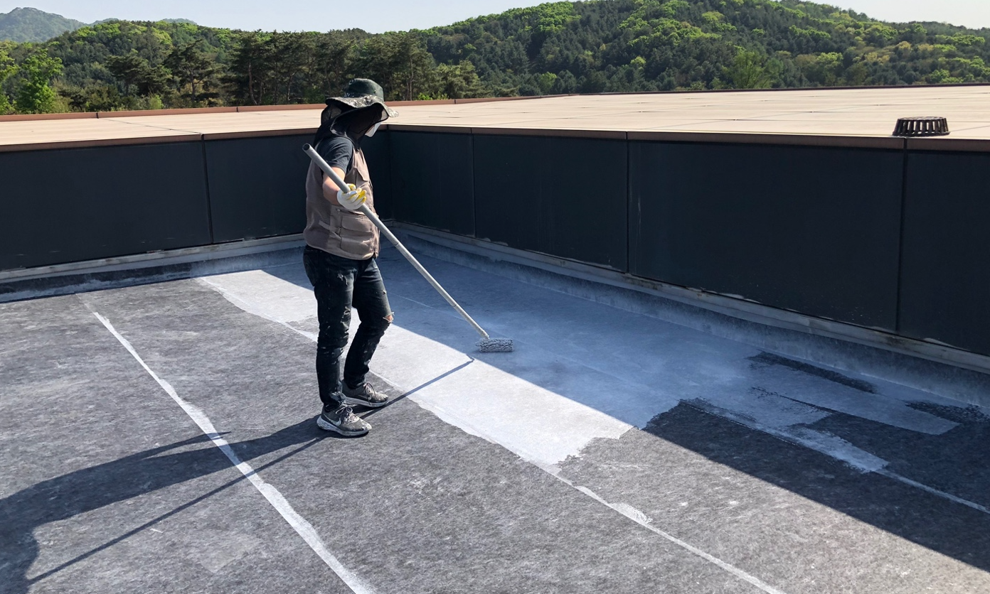 이어서 프라이머 작업을 진행합니다. 프라이머 작업은 침투 방수액을 옥상 바닥에 도포하여 기초적인 침투 방수 효과를 주고 미세하게 남은 먼지와 이물질을 흡착하여 제거하기 위한 작업입니다.