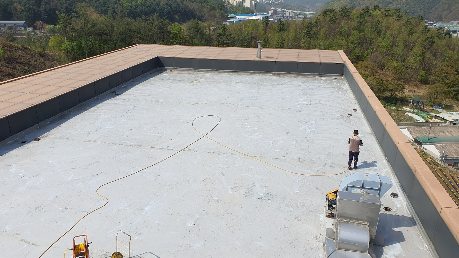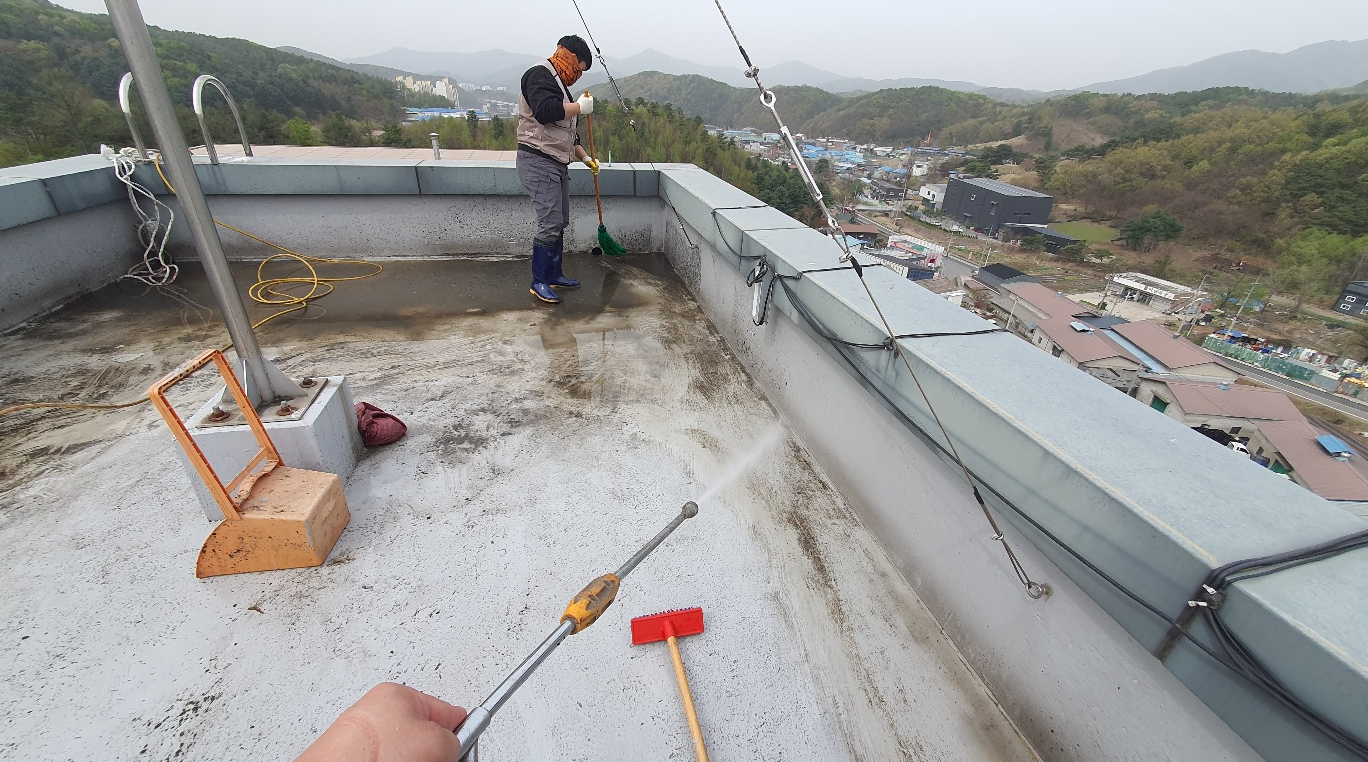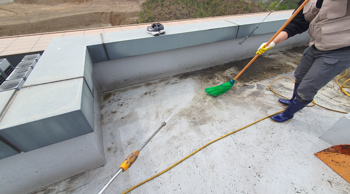다음으로 물청소 작업을 진행합니다. 마찬가지로 옥상 바닥을 깨끗하게 청소하기 위한 작업입니다. 물청소 작업에는 고압 세척기를 사용하기 때문에 먼지와 이물질을 효과적으로 청소할 수 있습니다.