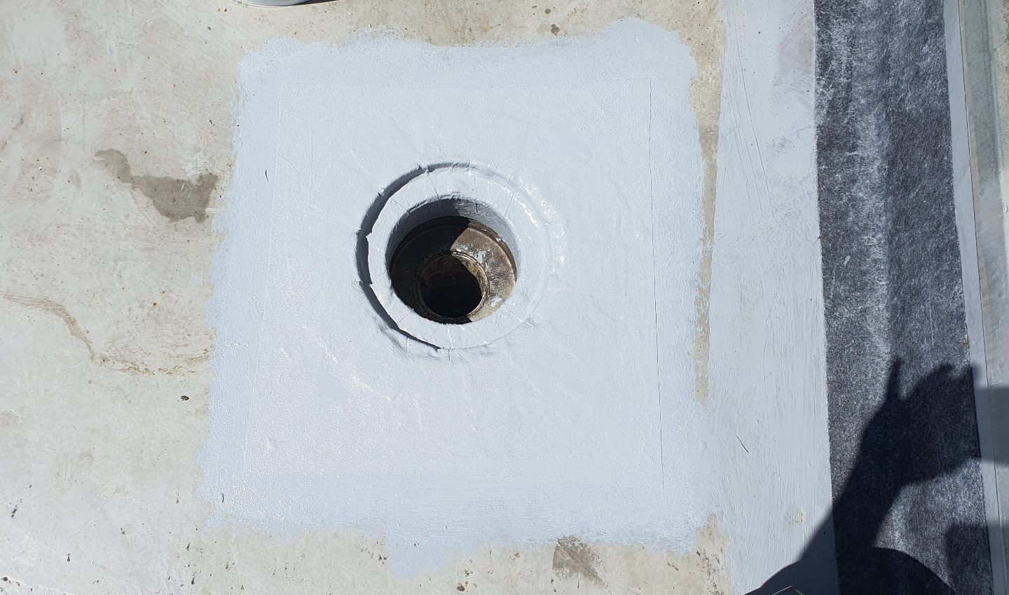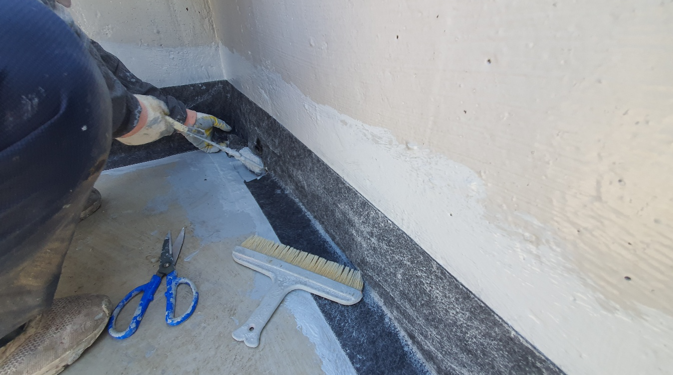 옥상 방수를 할 때에는 누수에 취약한 부분을 보강하는 작업도 중요합니다. 옥상에서 누수에 가장 취약한 우수관과 조인트 부분을 방수액과 방수 시트로 보강합니다. 이 작업을 기초 시트 작업이라고 합니다.