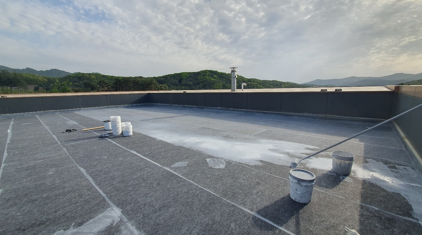 다음으로 함침 작업을 진행합니다. 옥상 바닥에 부착한 방수 시트가 떨어져 들뜨지 않도록 고정하기 위한 작업입니다. 함침 작업은 침투 방수액을 바닥의 방수 시트에 전체적으로 도포하여 작업을 진행합니다.