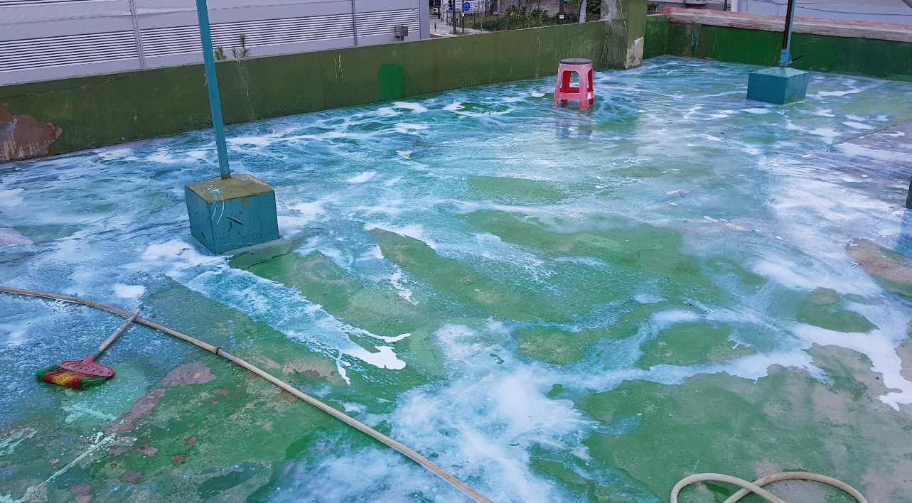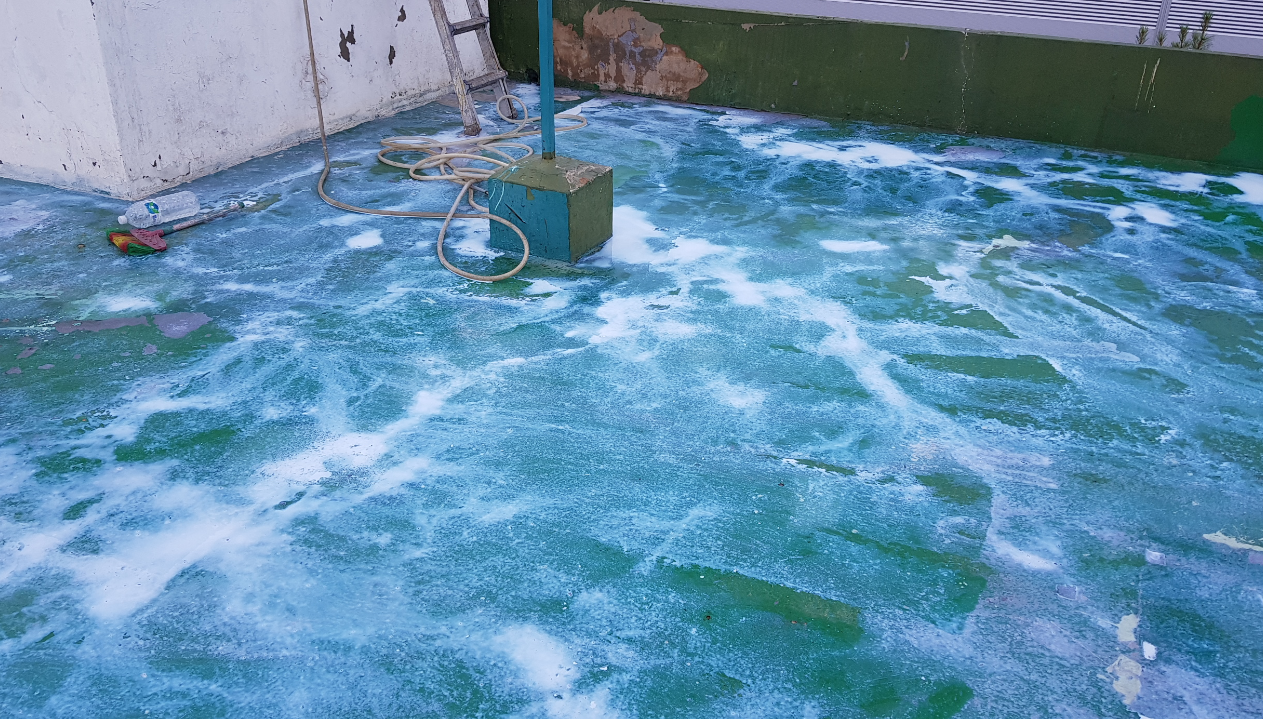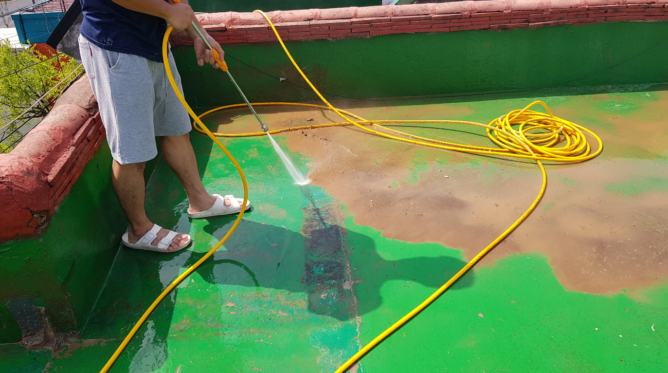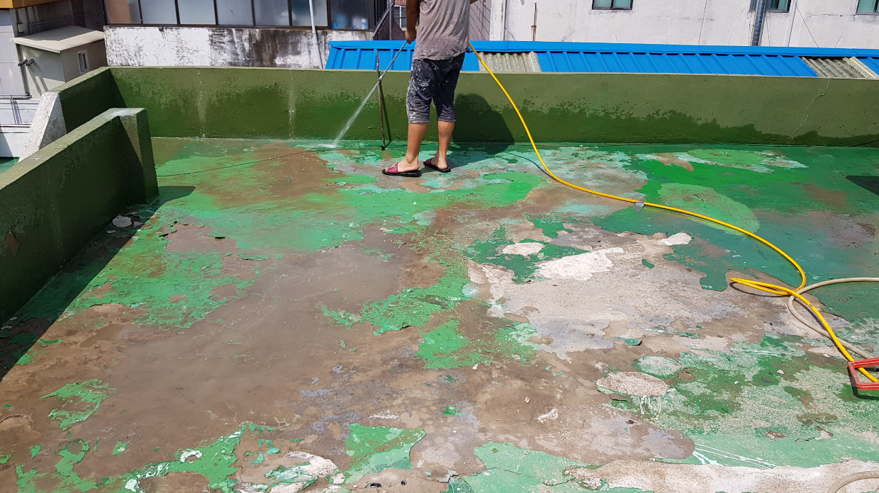 옥상에 장시간 쌓인 먼지를 깨끗하게 씻어내는
