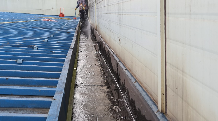 고압 호스를 이용한 물청소로 씻어냅니다.