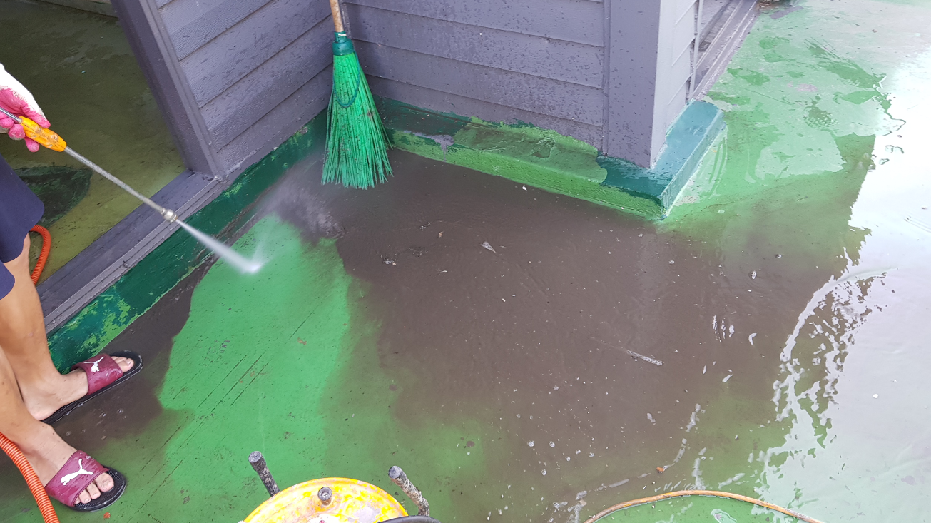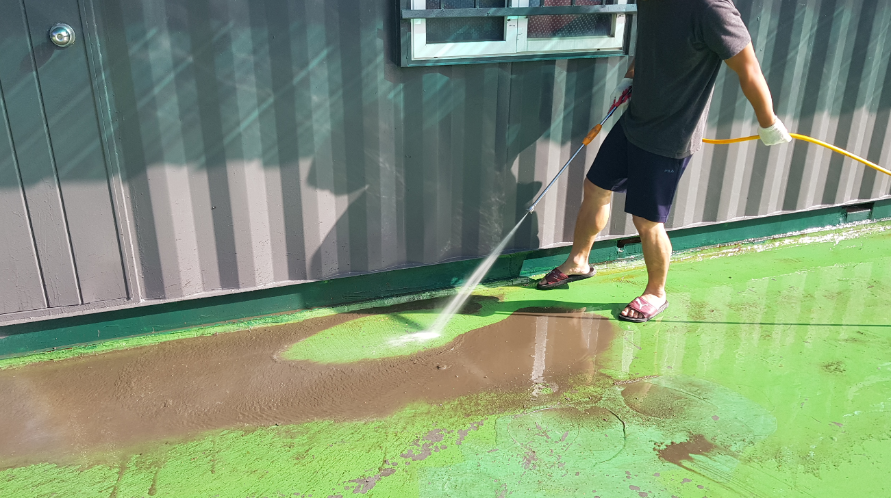 시공에 앞서 옥상을 물청소합니다. 고압 호스를
