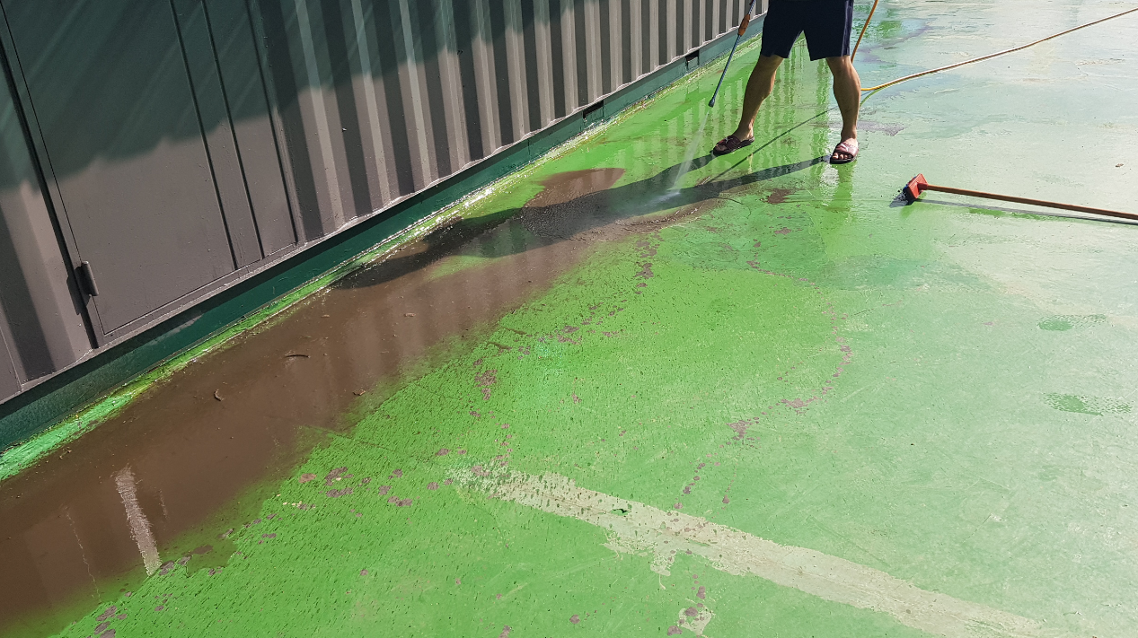 본격적인 옥상방수 시공 전에 고압 호스로 물청소