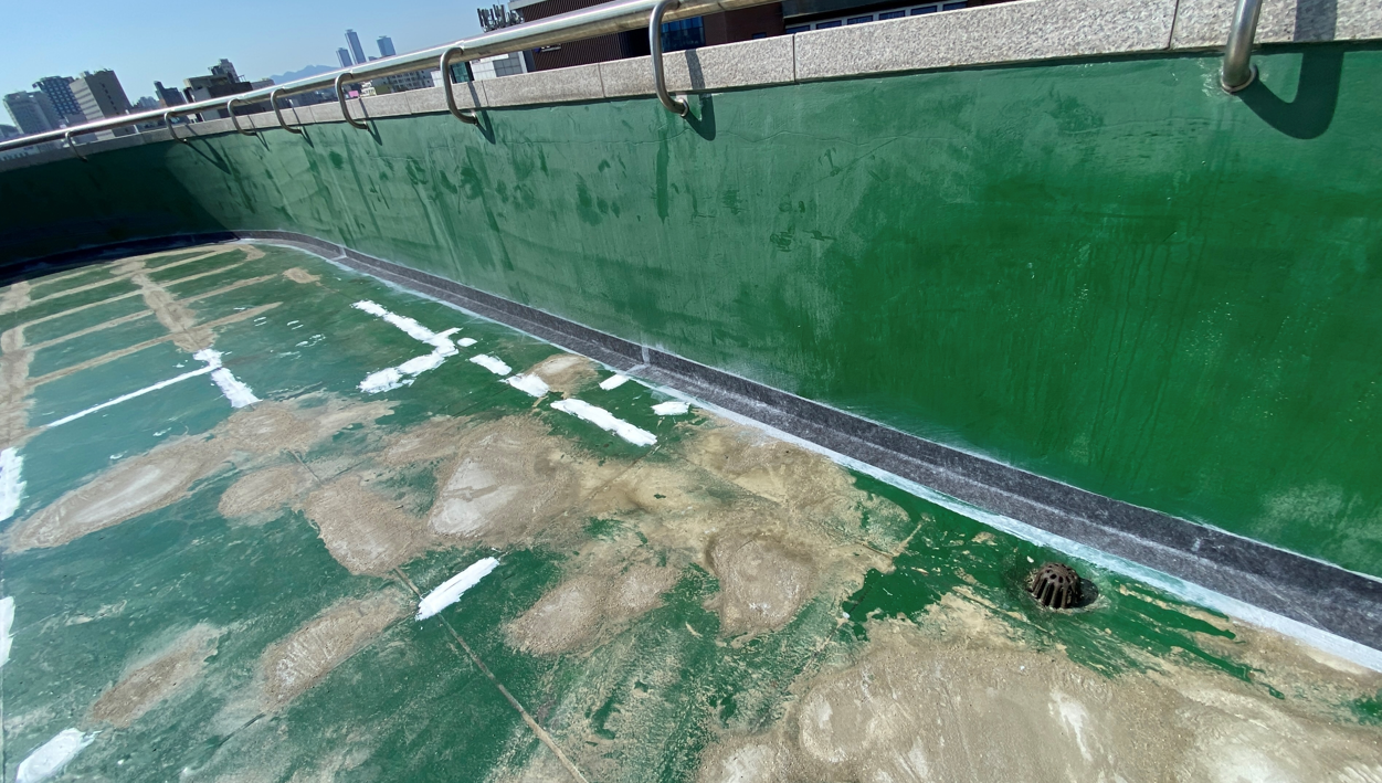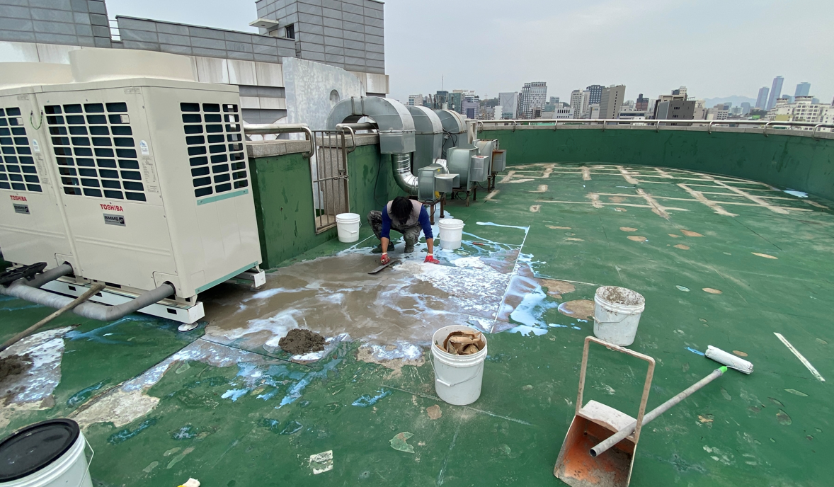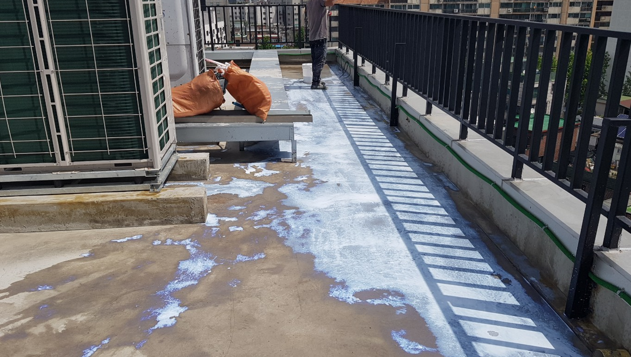앞서 말씀드렸듯이 본 시공 전에 침투 방수제를 바닥에 도포하는 작업을 진행합니다. 이 작업은 프라이머 작업으로 침투 방수제를 바닥 전체에 도포하여 먼지나 이물질 등을 제거하고, 옥상 전체에 침투 방수 효과를 부여하는 과정입니다.