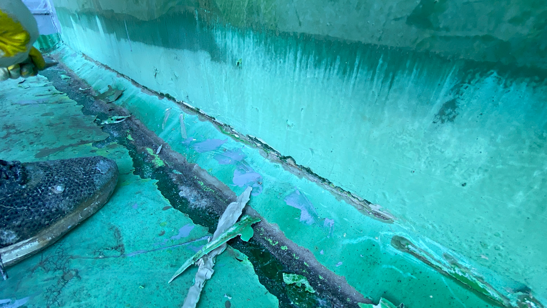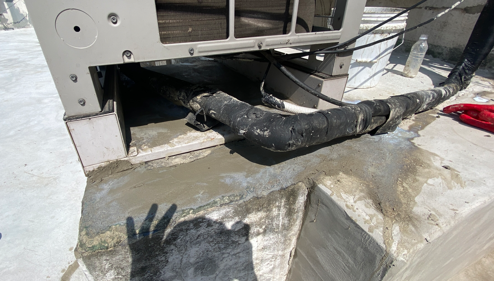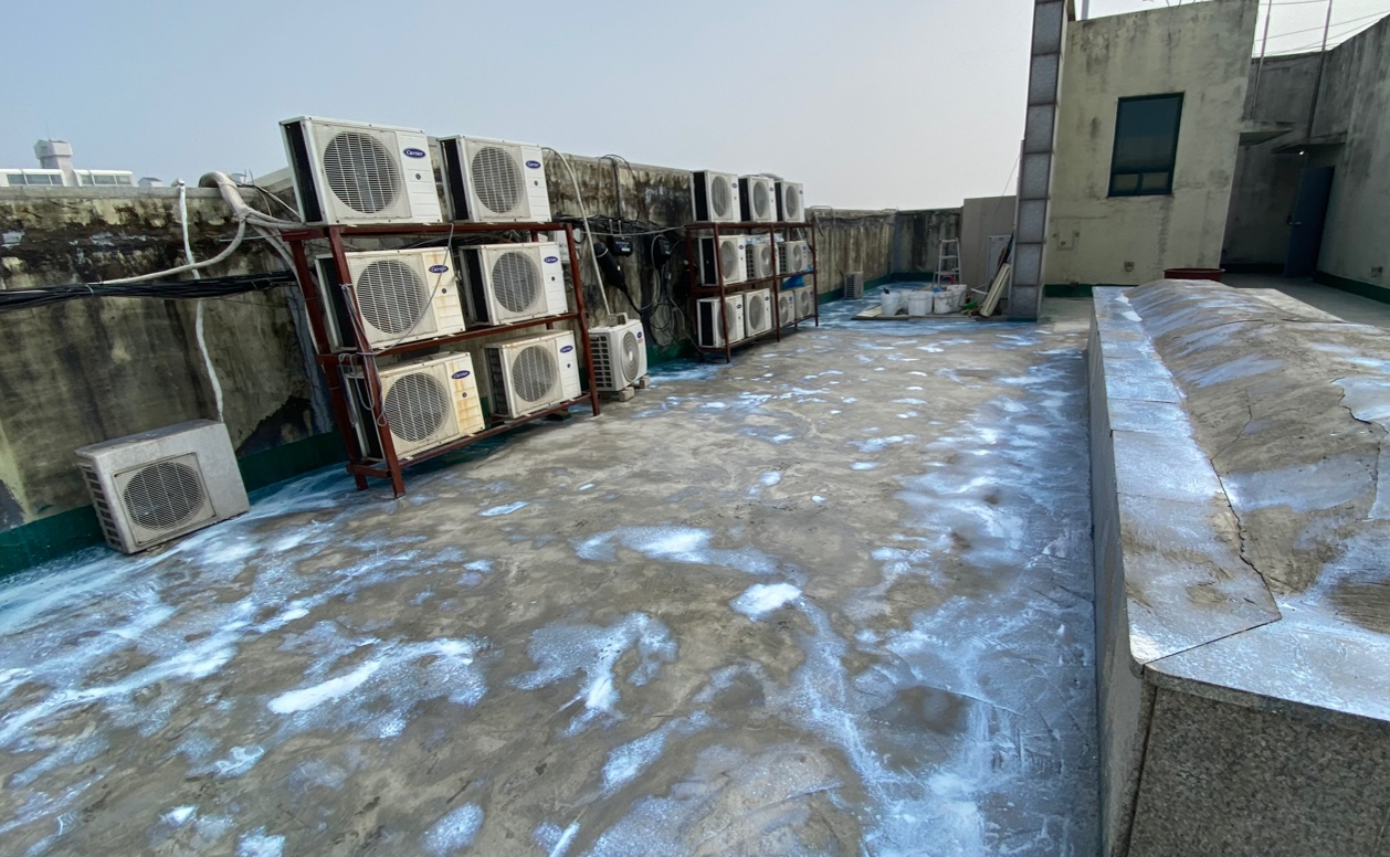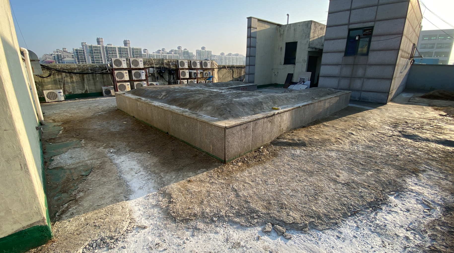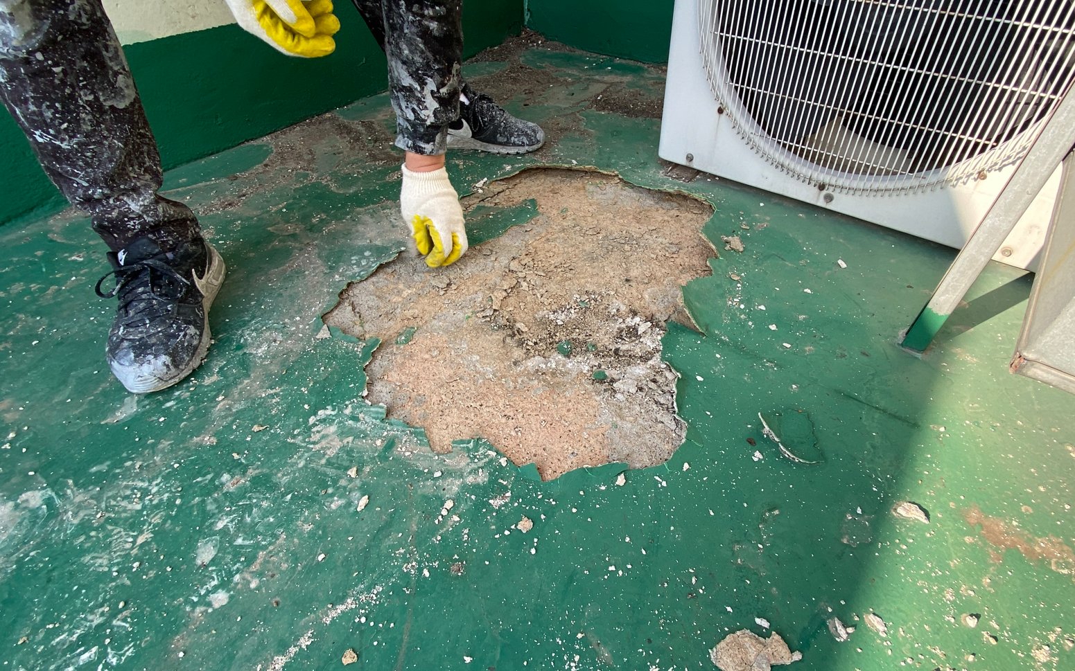 하자가 발생한 현장의 모습입니다. 옥상에서 발생하는 하자의 대부분은 옥상의 크랙이 원인입니다. 그렇기 때문에 이 크랙을 잡는 것이 무엇보다 중요합니다. 본격적으로 방수공사에 들어가기에 앞서 옥상을 정리하고 청소하는 작업이 필요합니다.