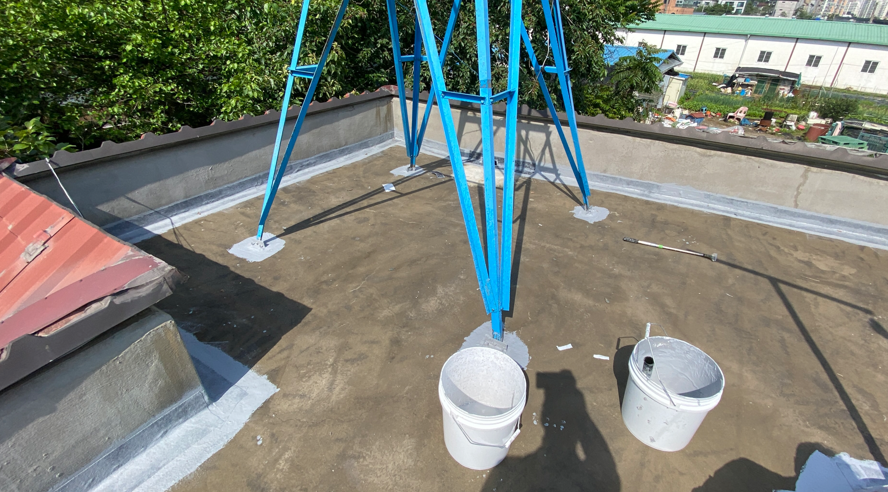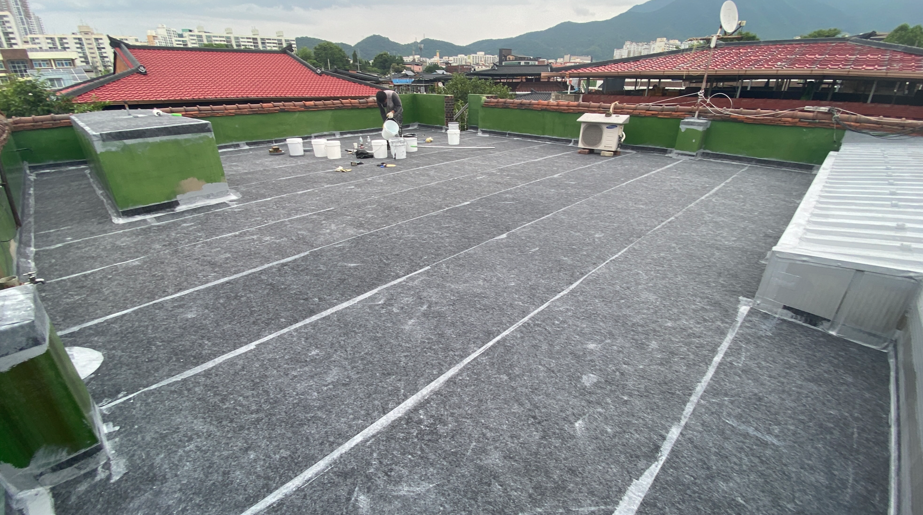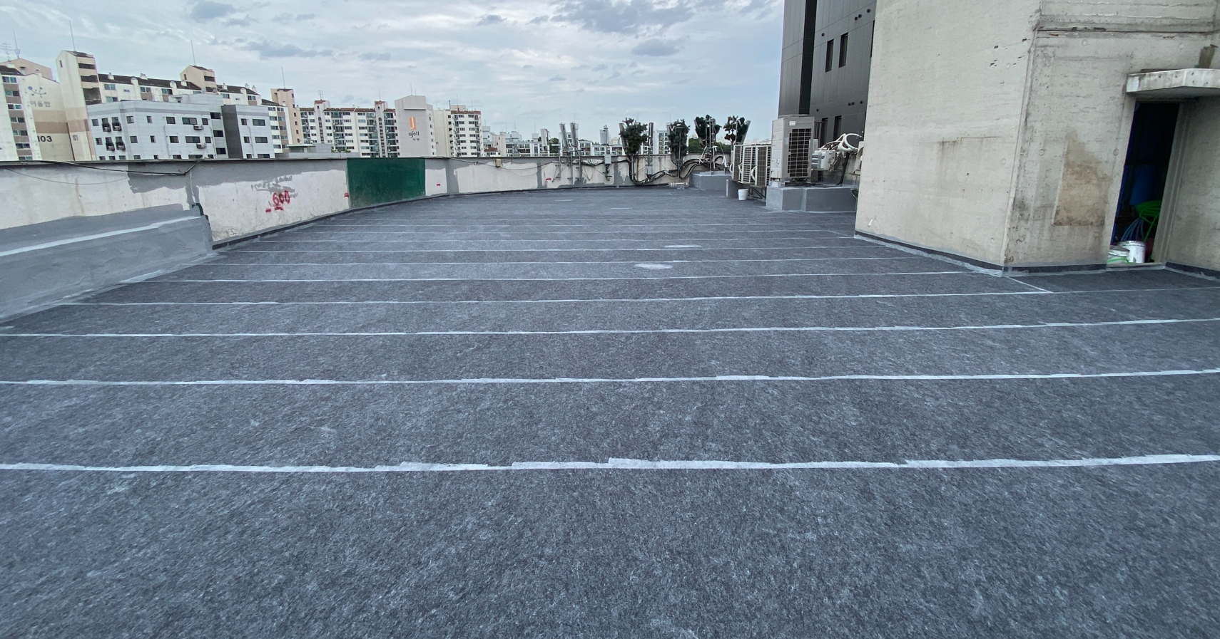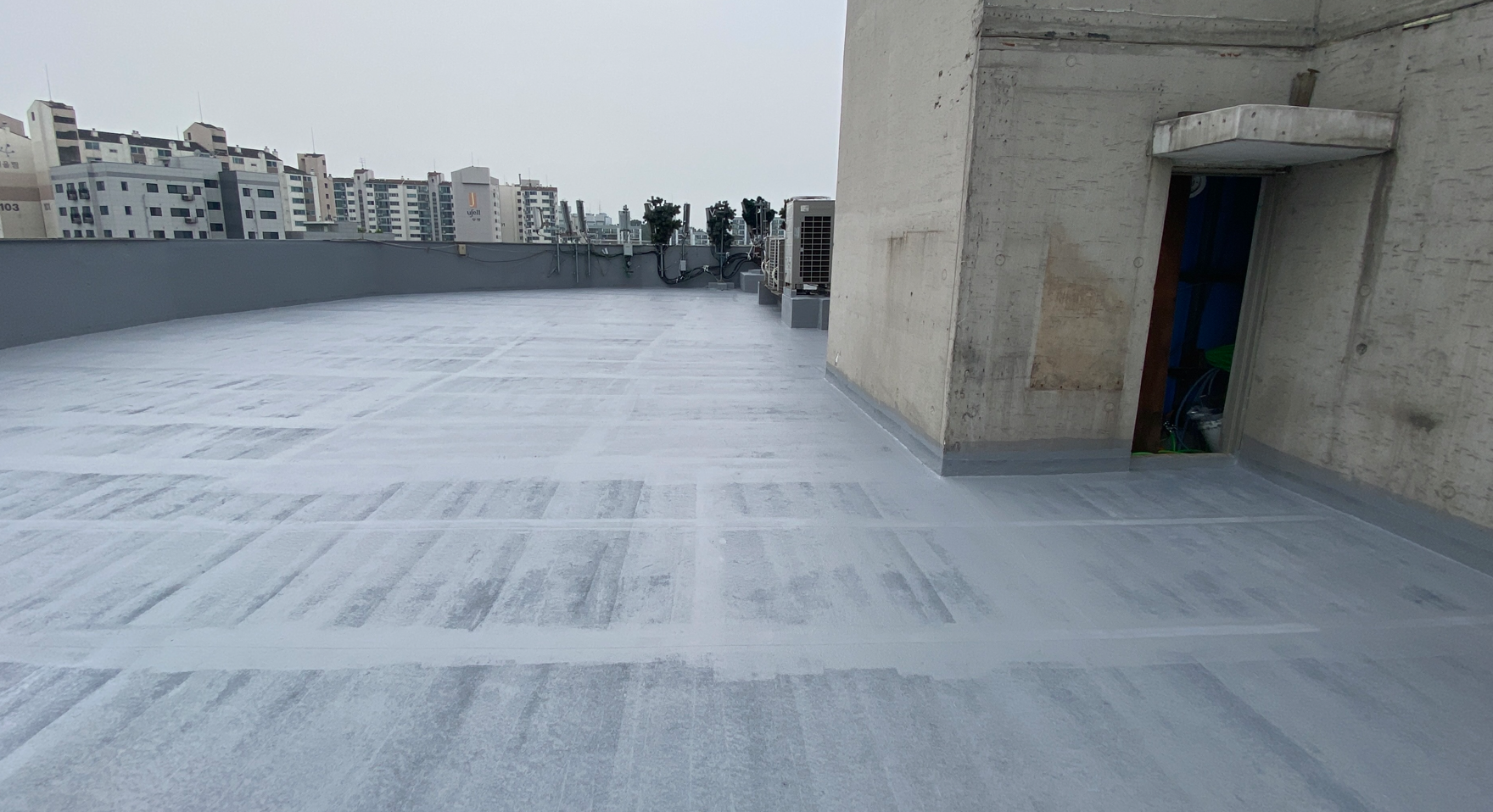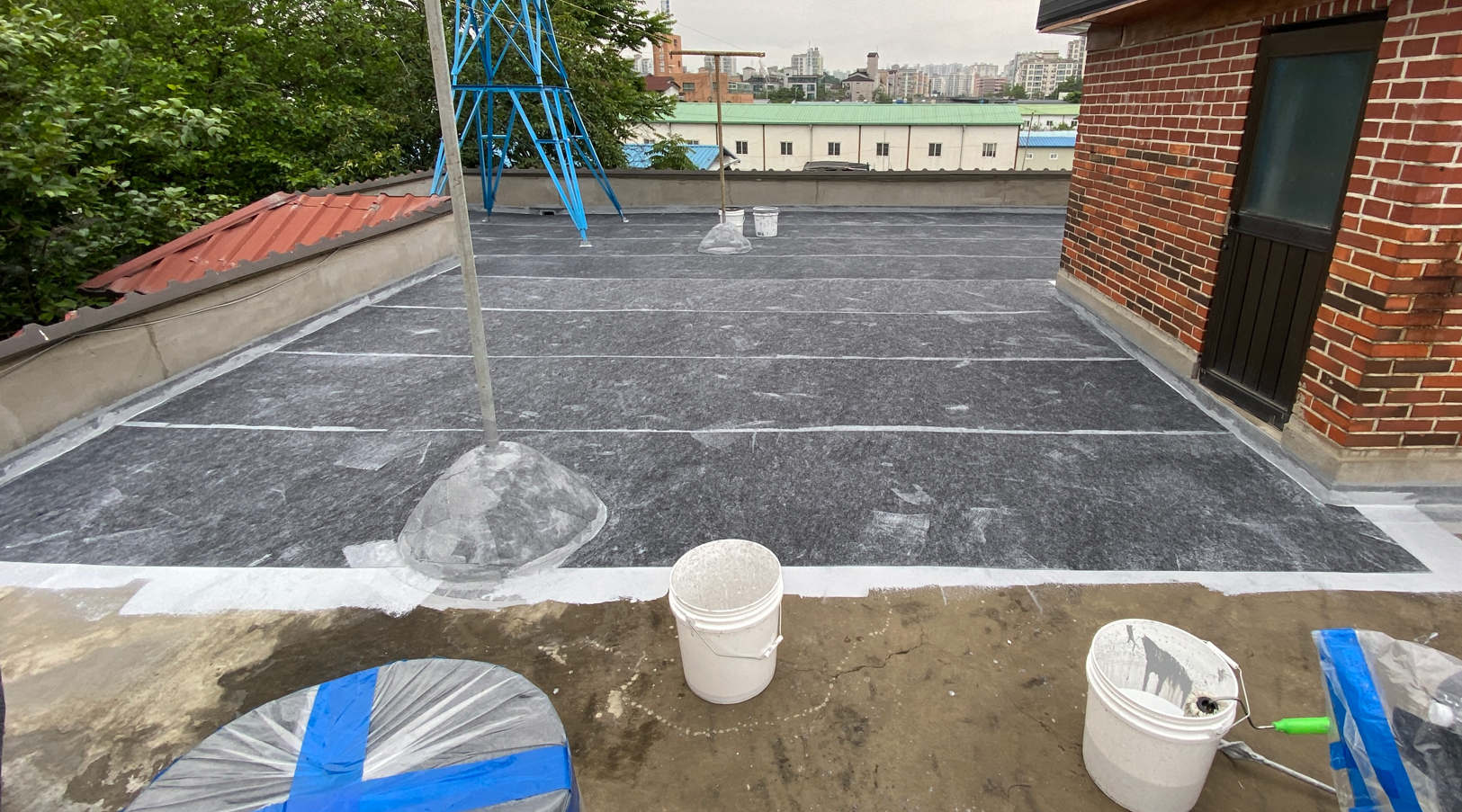 방수공사의 마지막 작업으로는 상도를 진행합니다. 상도는 자외선을 차단하여 방수층을 보호하는 역할을 합니다. 이렇게 방수공사를 철저하게 해 두면 여름에 비가 많이 오더라도 누수 걱정 없는 옥상을 만들 수 있습니다. 이렇게 완성된 옥상은 반영구적인 방수 수명을 갖게 됩니다.