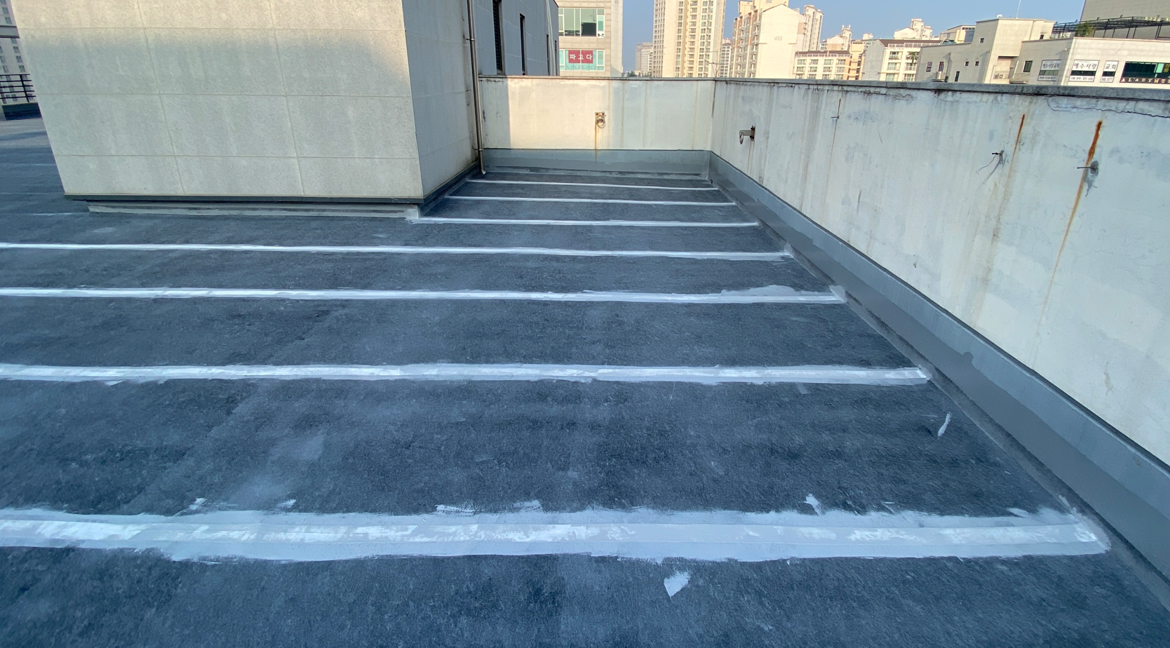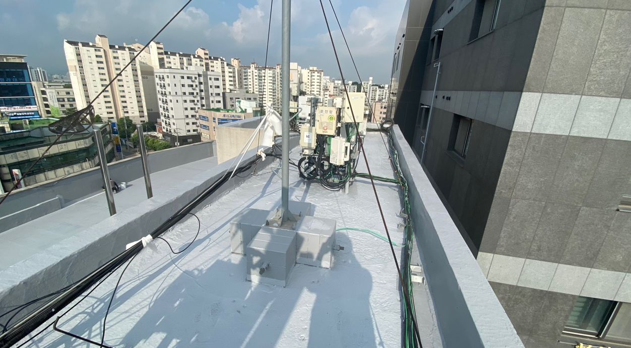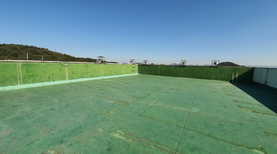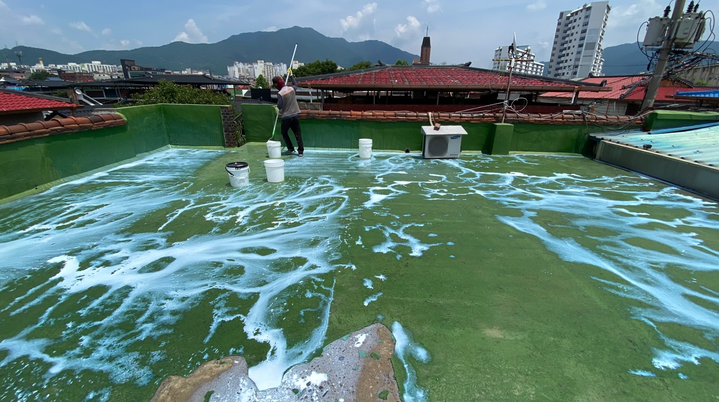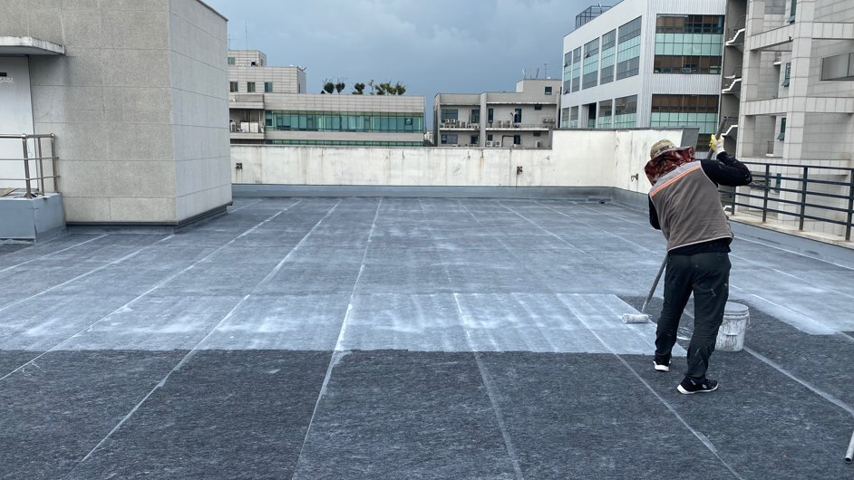 보강 시트 작업까지 모든 시트 작업을 마친 후에는 방수액을 도포합니다. 돌가루를 원료로 만든 친환경 무기질 방수액을 옥상 전체에 도포하는 작업으로 방수액을 총 3차례에 걸쳐 칠해줍니다. 화학 제품이 아니기 때문에 자극적인 냄새가 없어 시공 후에도 쾌적합니다.