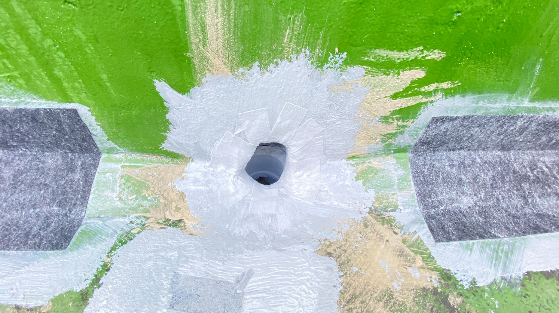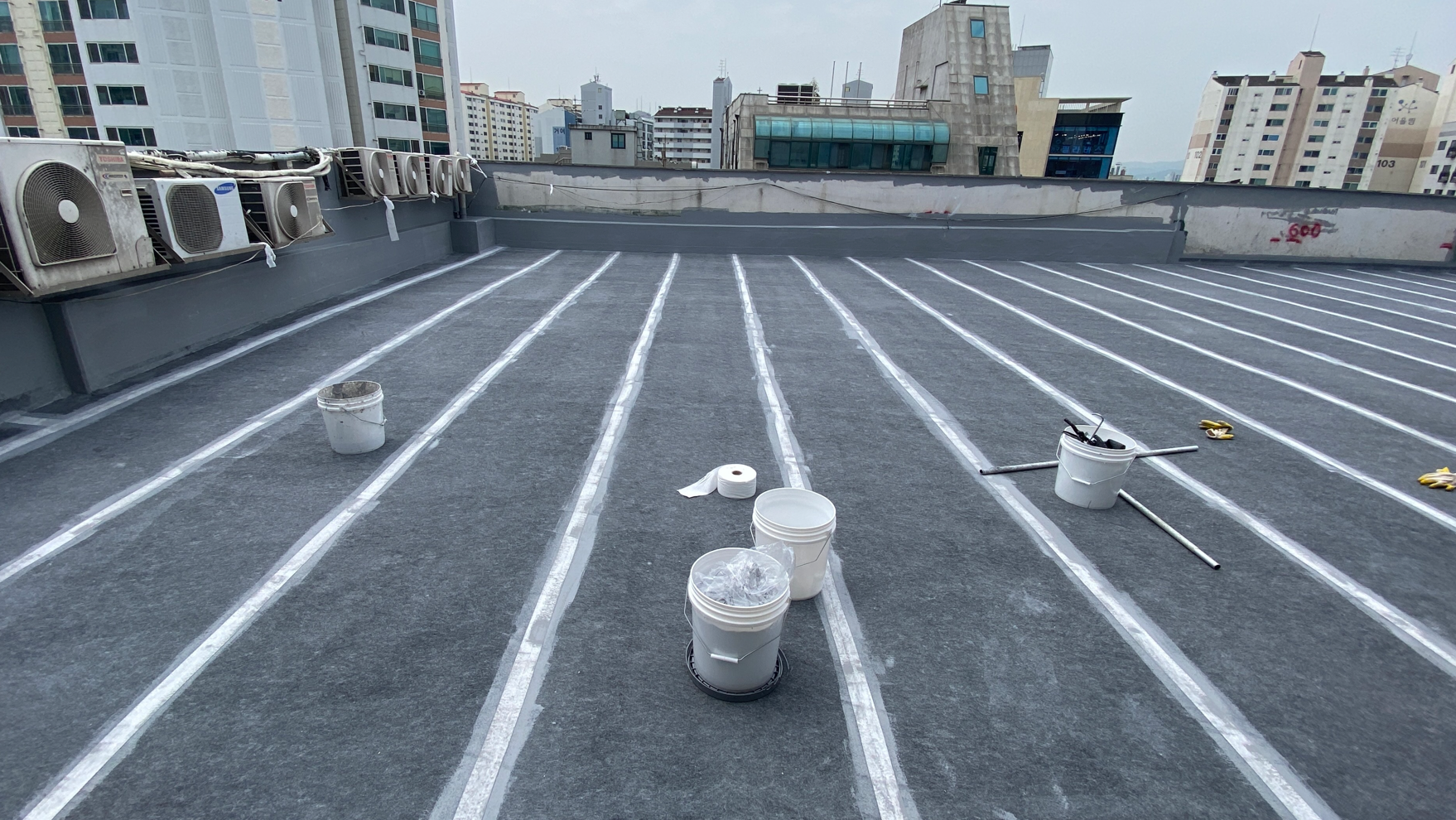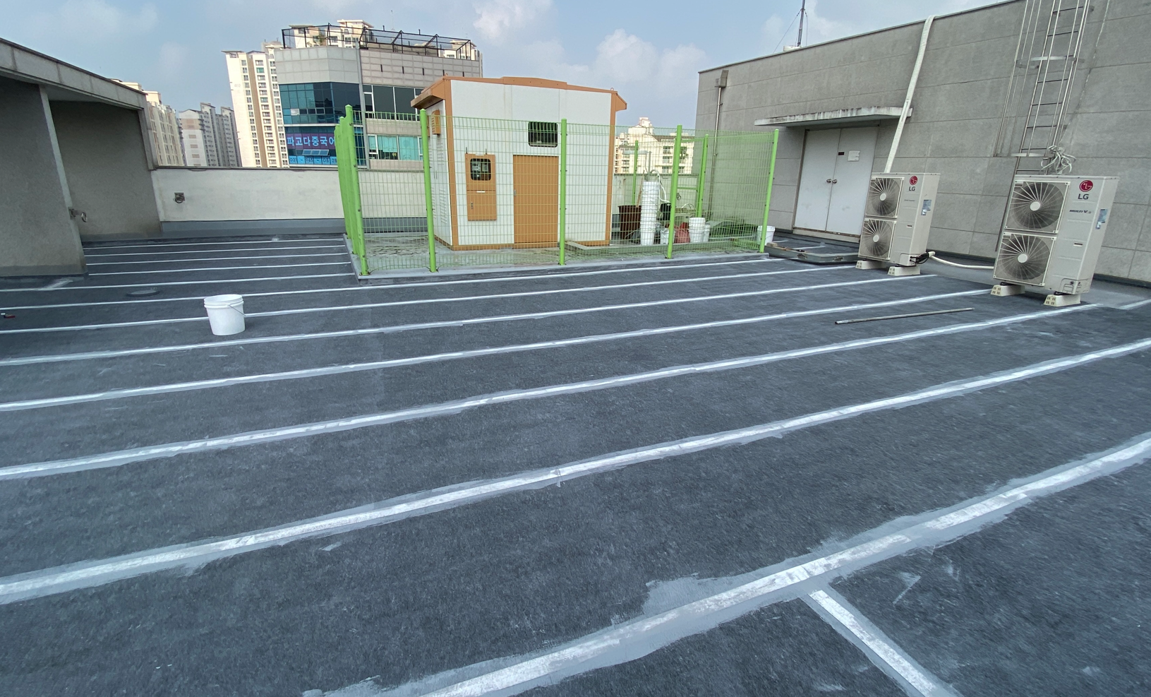 보강 시트 작업까지 모든 시트 작업을 마친 후에는 방수액을 도포합니다. 돌가루를 원료로 만든 친환경 무기질 방수액을 옥상 전체에 도포하는 작업으로 방수액을 총 3차례에 걸쳐 칠해줍니다. 화학 제품이 아니기 때문에 자극적인 냄새가 없어 시공 후에도 쾌적합니다.
