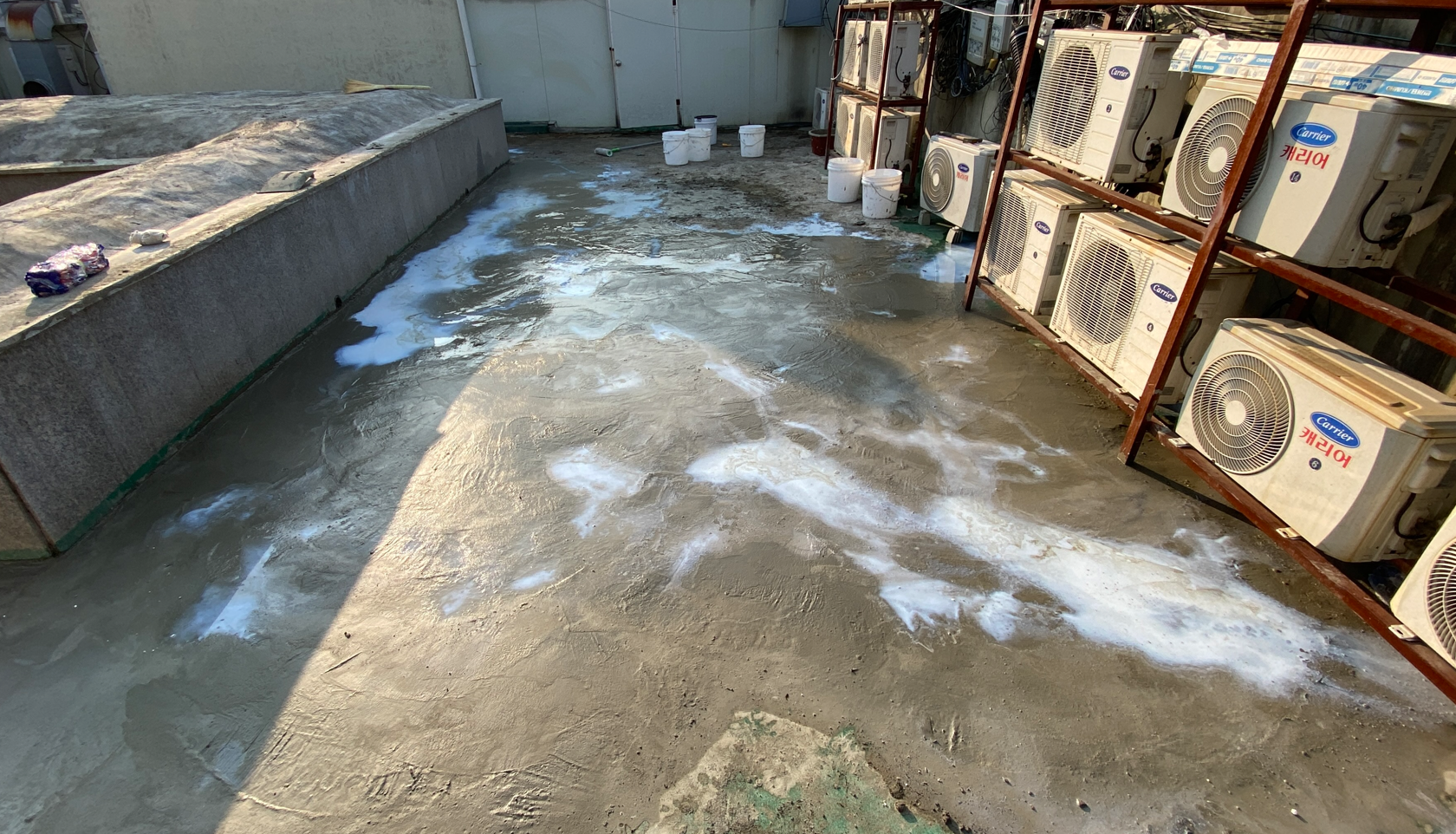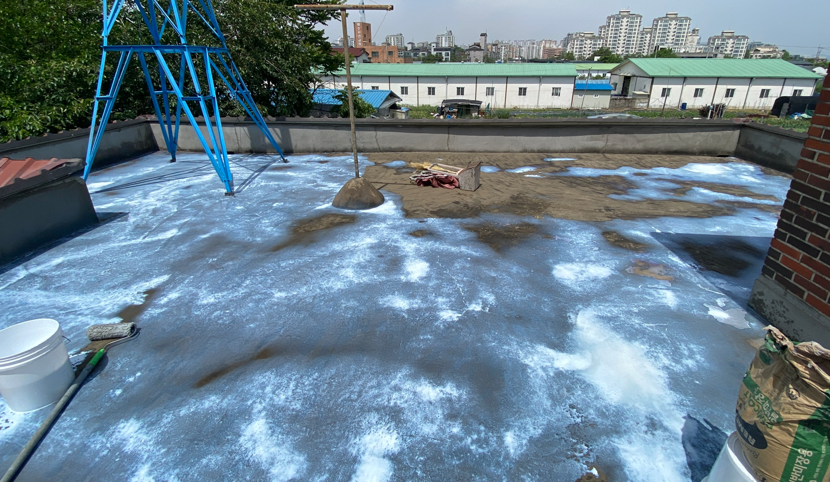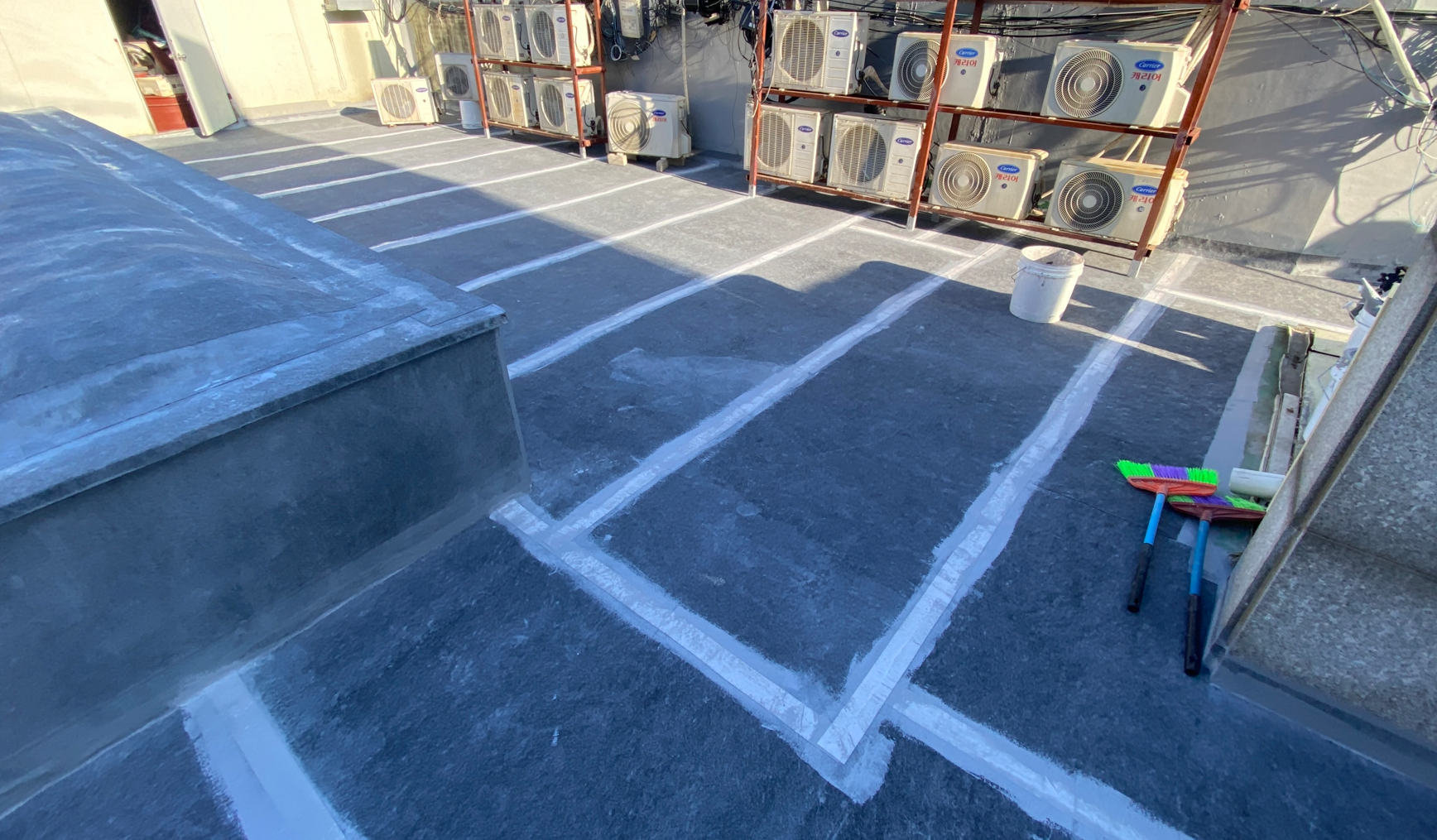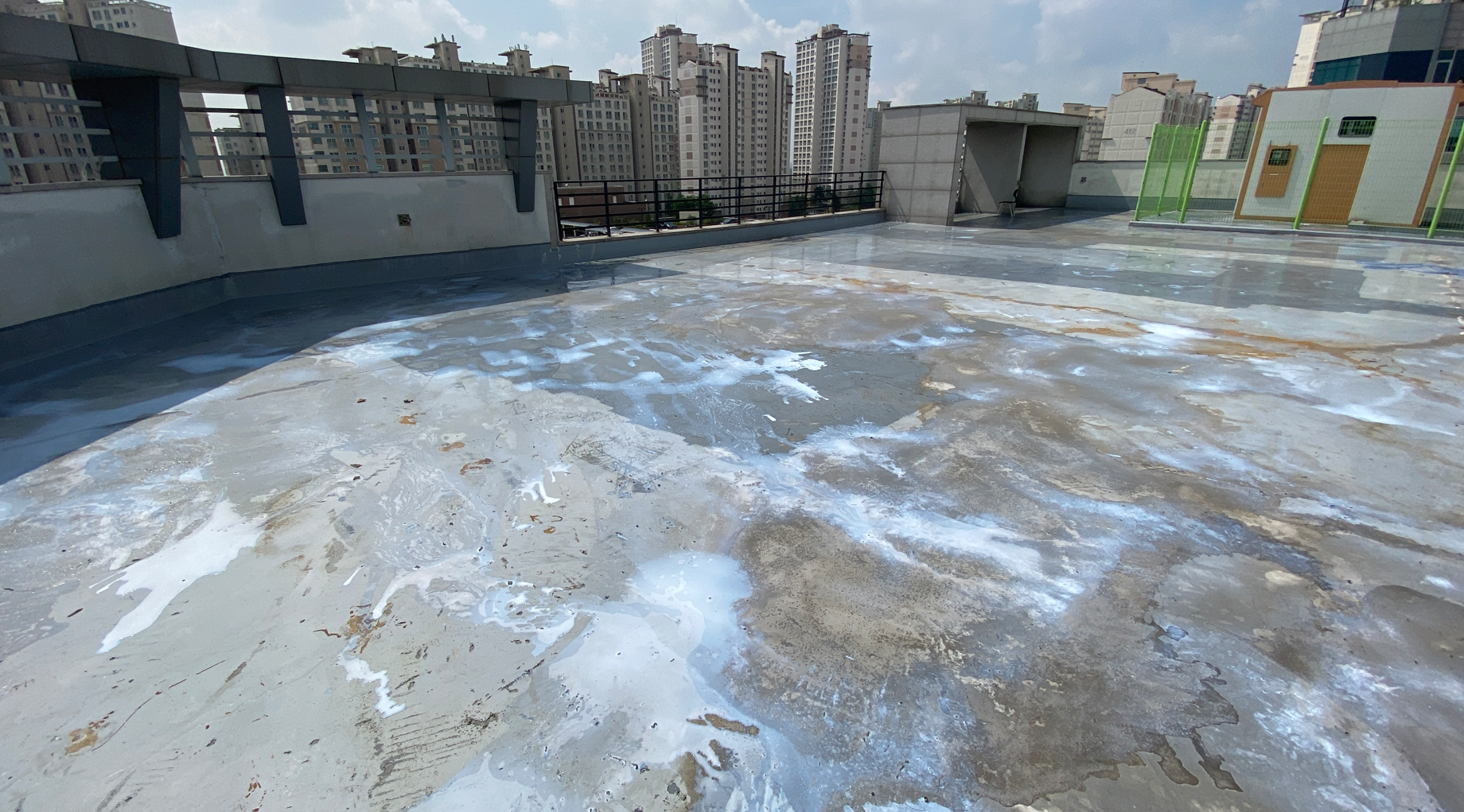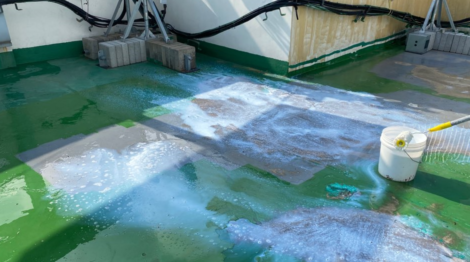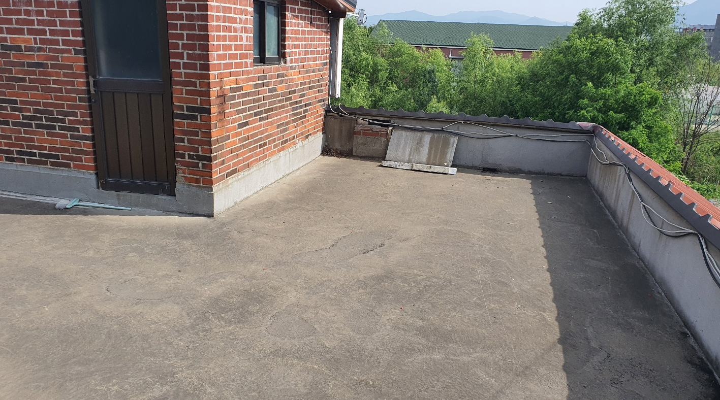 현재 옥상에는 별 다른 방수처리가 돼있지 않은 상태입니다. 이때 침투 방수액을 옥상 바닥에 도포해 주면 기초적인 방수 효과를 줄 수 있습니다. 이 작업을 프라이머 작업이라고 하는데요. 프라이머 작업은 옥상의 미세한 먼지와 이물질을 흡착시켜 제거하는 역할도 합니다.