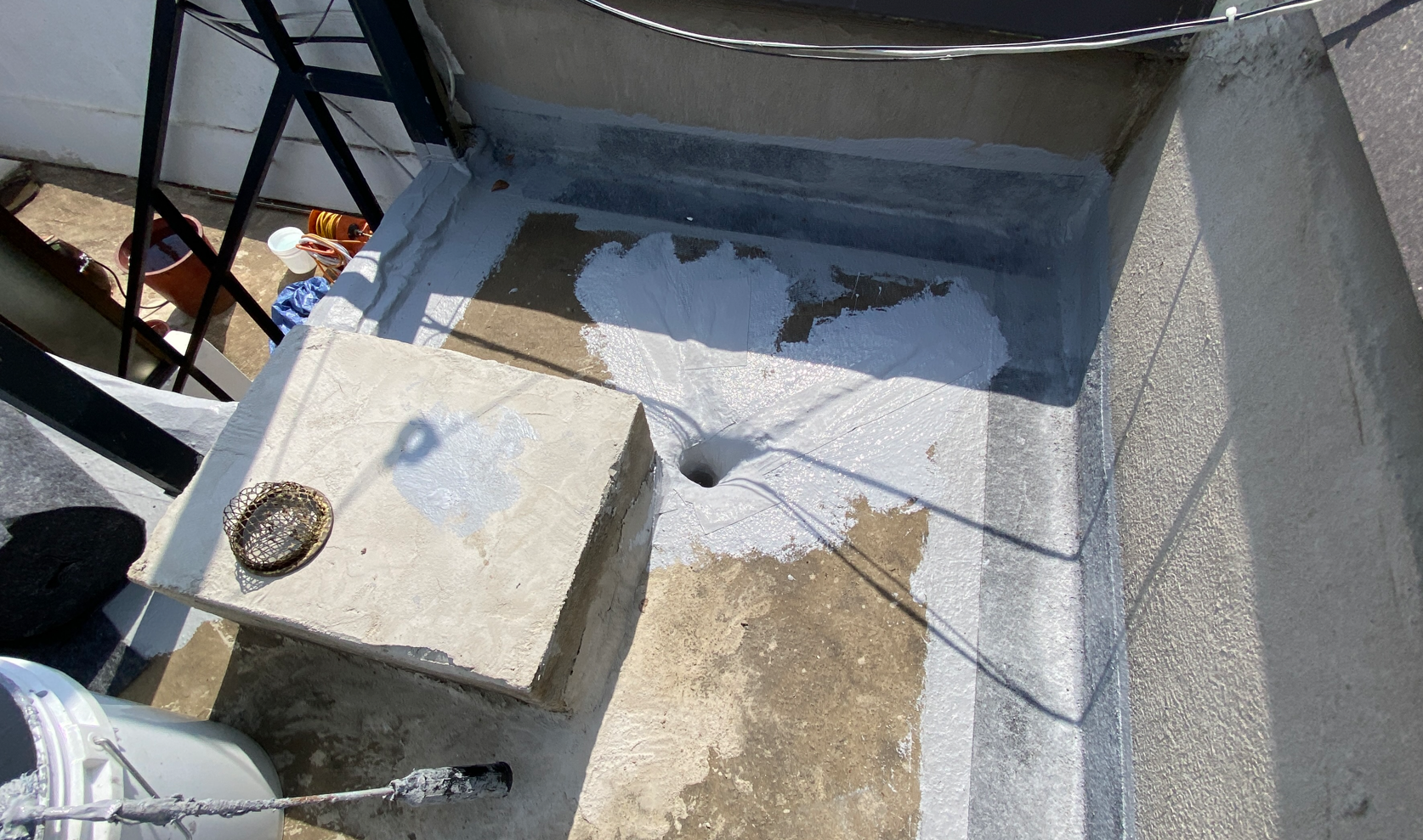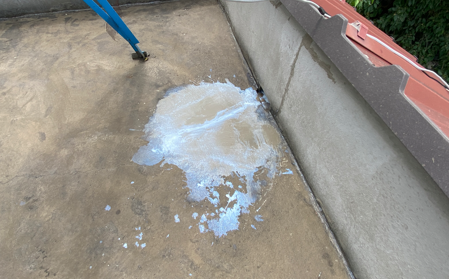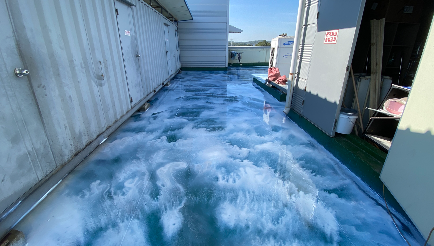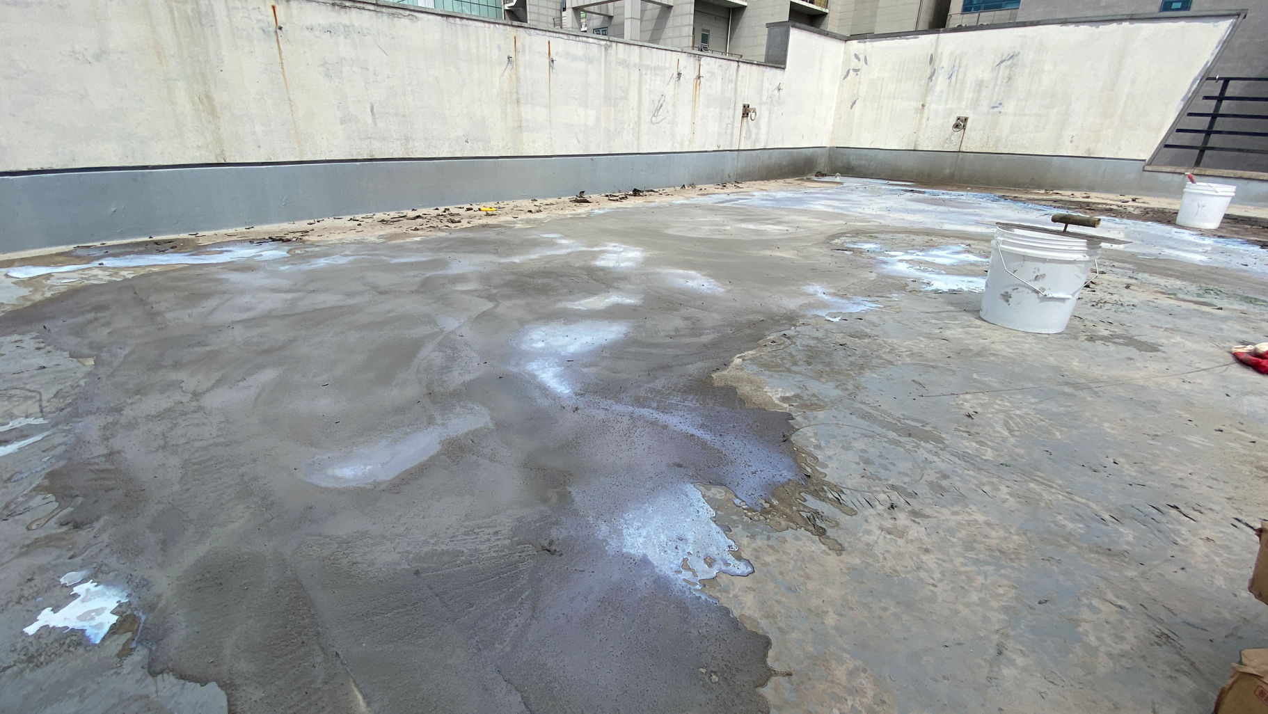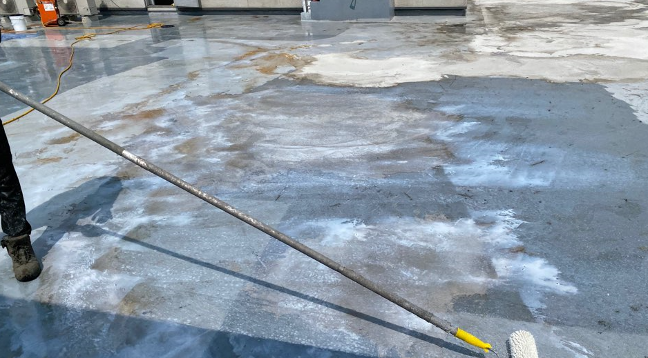 현재 옥상에는 별 다른 방수처리가 돼있지 않은 상태입니다. 이때 침투 방수액을 옥상 바닥에 도포해 주면 기초적인 방수 효과를 줄 수 있습니다. 이 작업을 프라이머 작업이라고 하는데요. 프라이머 작업은 옥상의 미세한 먼지와 이물질을 흡착시켜 제거하는 역할도 합니다.