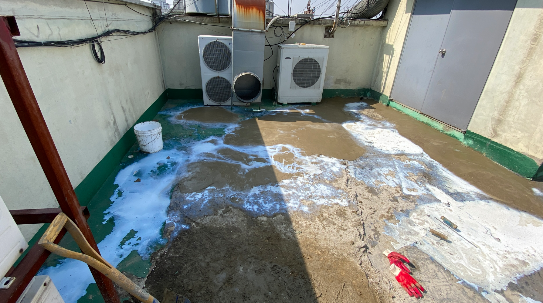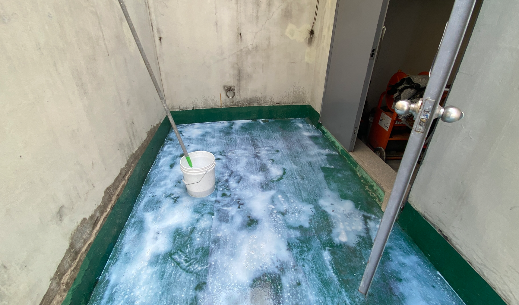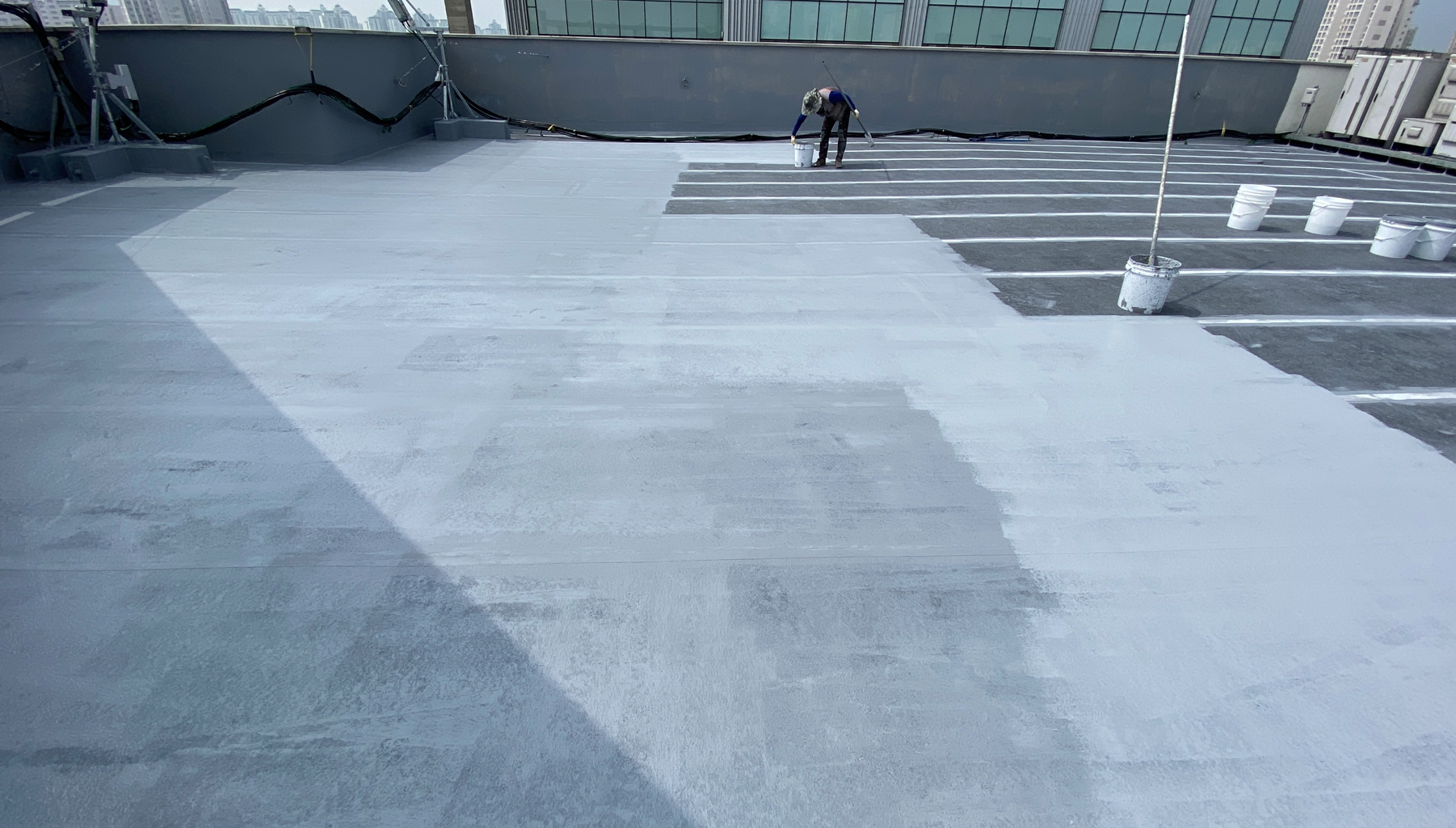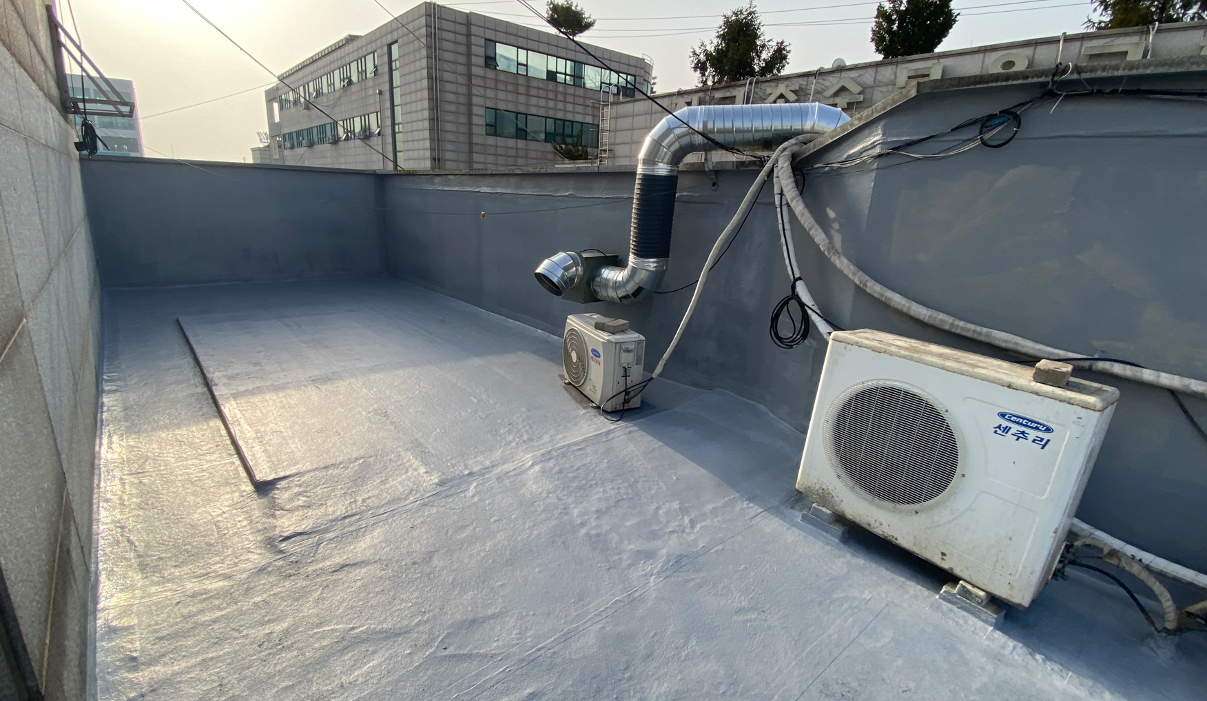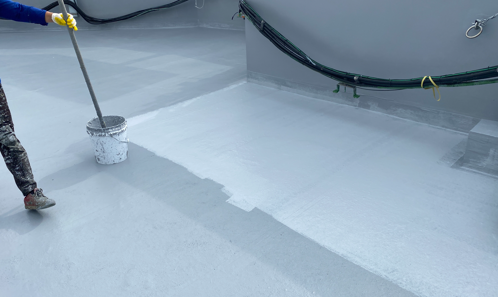 현재 옥상에는 별 다른 방수처리가 돼있지 않은 상태입니다. 이때 침투 방수액을 옥상 바닥에 도포해 주면 기초적인 방수 효과를 줄 수 있습니다. 이 작업을 프라이머 작업이라고 하는데요. 프라이머 작업은 옥상의 미세한 먼지와 이물질을 흡착시켜 제거하는 역할도 합니다.