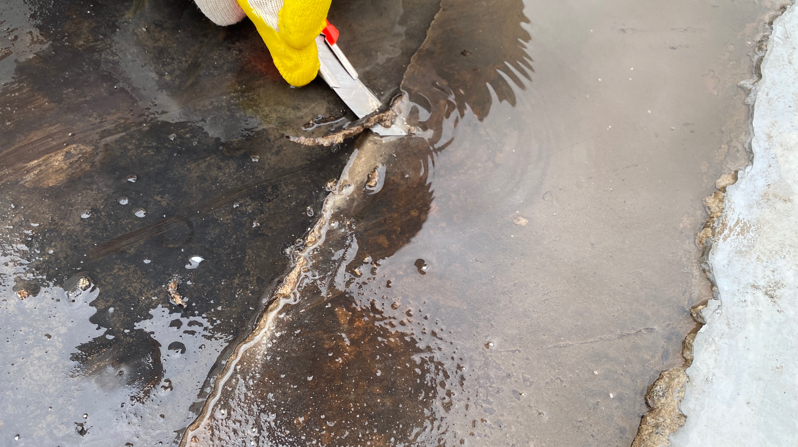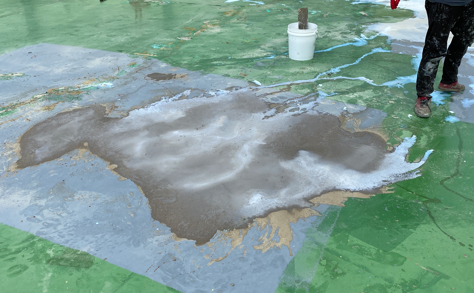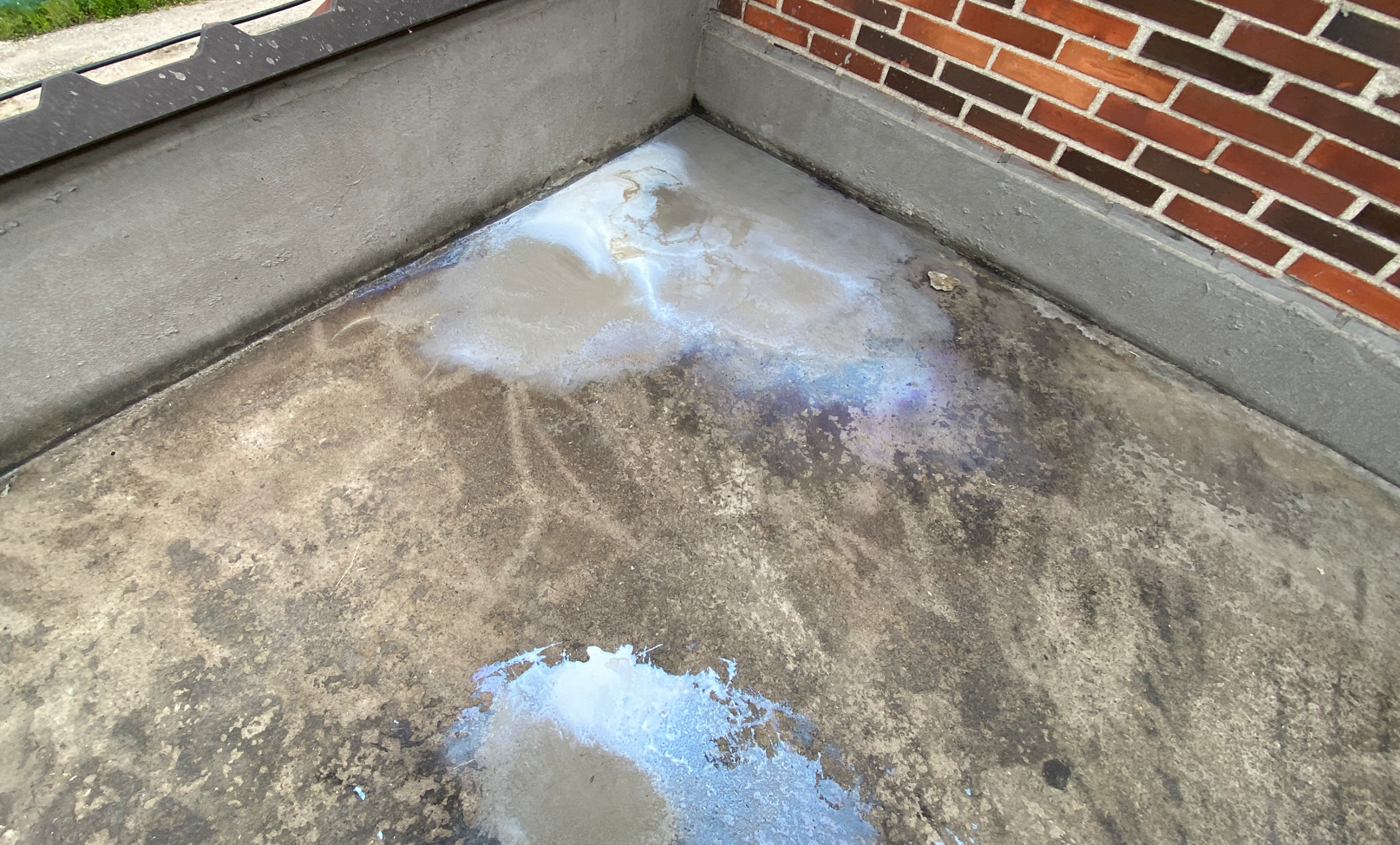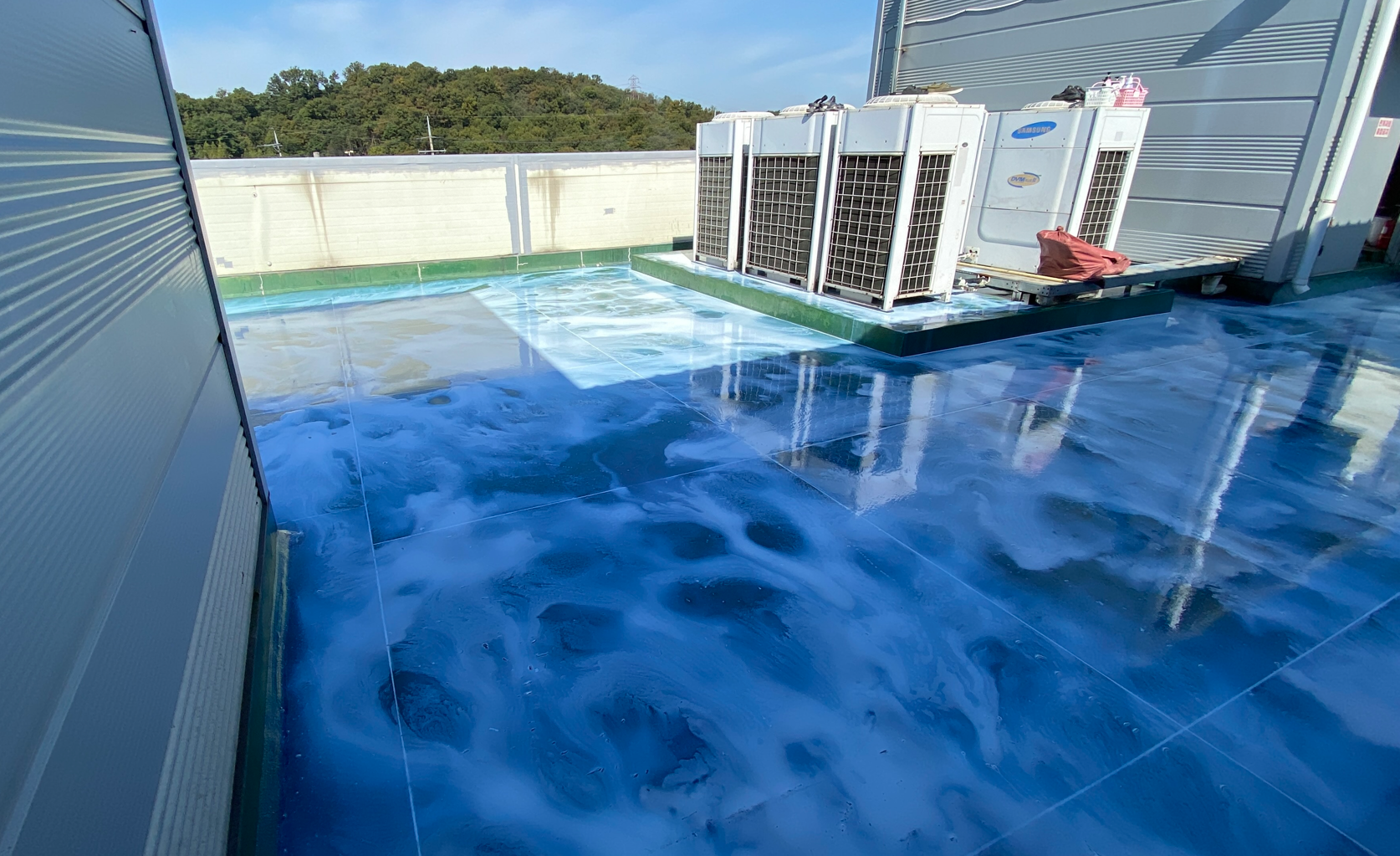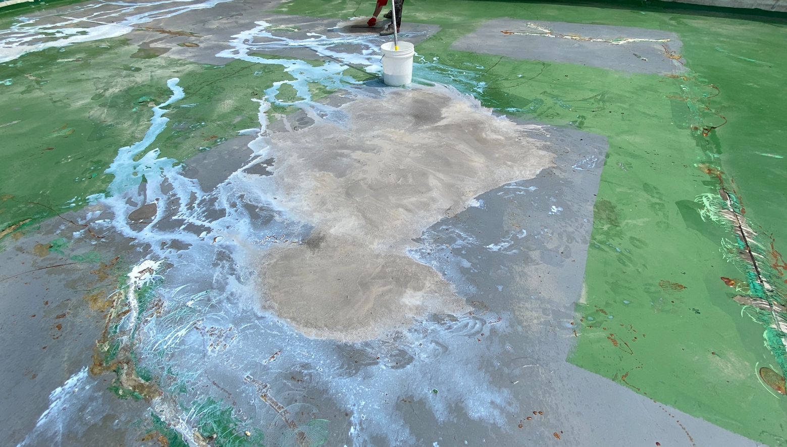 현재 옥상에는 별 다른 방수처리가 돼있지 않은 상태입니다. 이때 침투 방수액을 옥상 바닥에 도포해 주면 기초적인 방수 효과를 줄 수 있습니다. 이 작업을 프라이머 작업이라고 하는데요. 프라이머 작업은 옥상의 미세한 먼지와 이물질을 흡착시켜 제거하는 역할도 합니다.