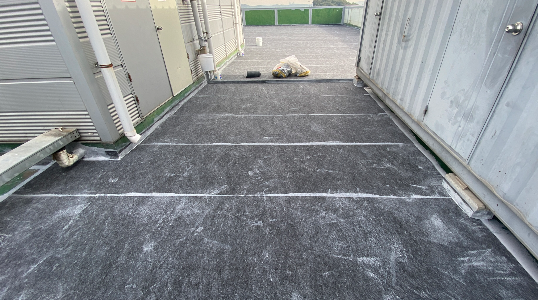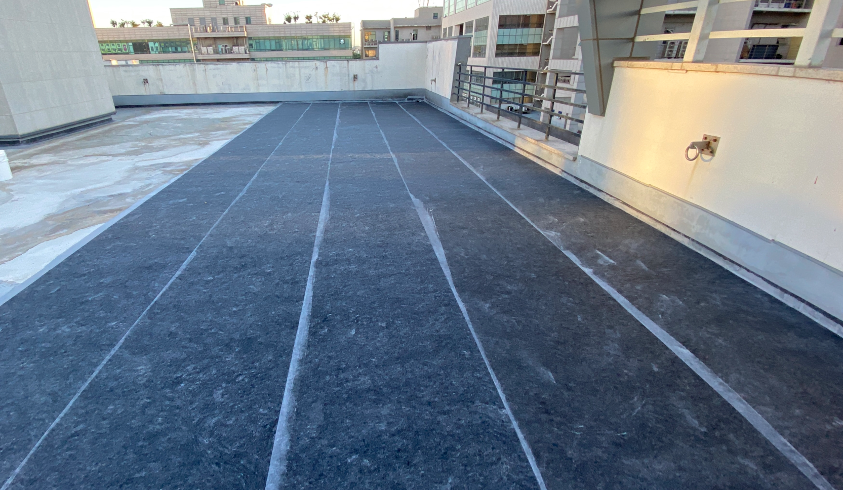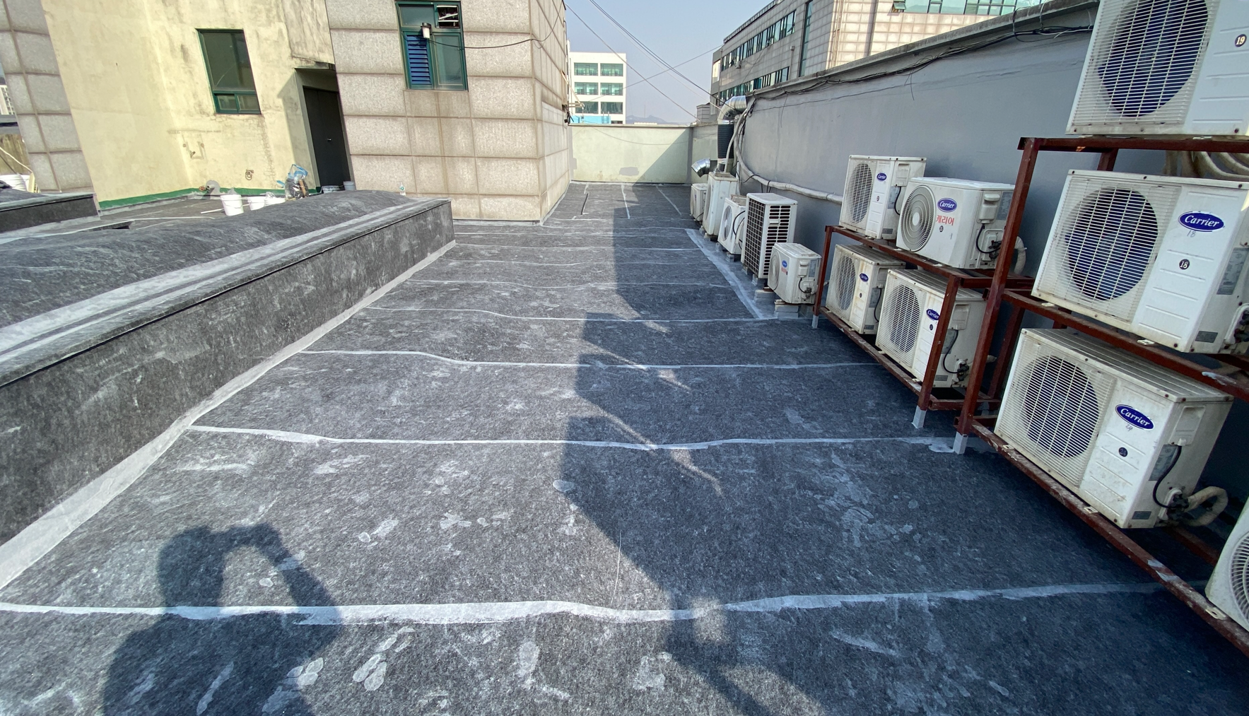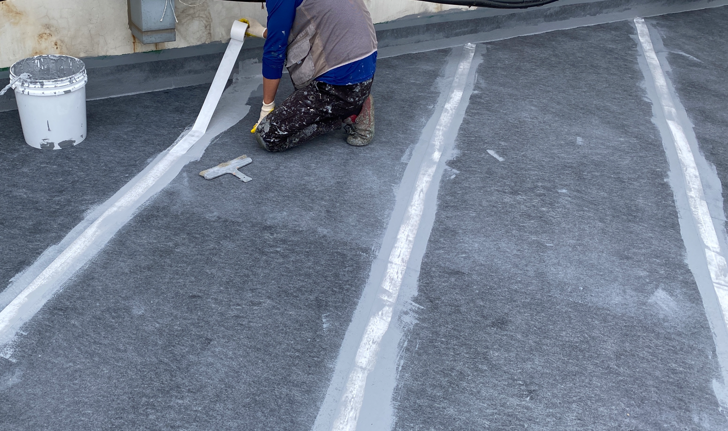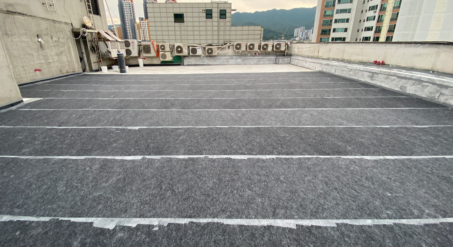 다음은 바닥 전체에 방수시트를 부착합니다. 옥상의 크랙을 잡기 위한 가장 중요한 작업으로 방수시트가 큰 역할을 하게 됩니다. 작업에 사용하는 방수시트는 질긴 섬유 재질로 만들어 옥상의 크랙을 확실하게 잡아줄 수 있습니다. 방수액을 칠한 후 시트를 옥상 바닥 전체에 부착합니다.
