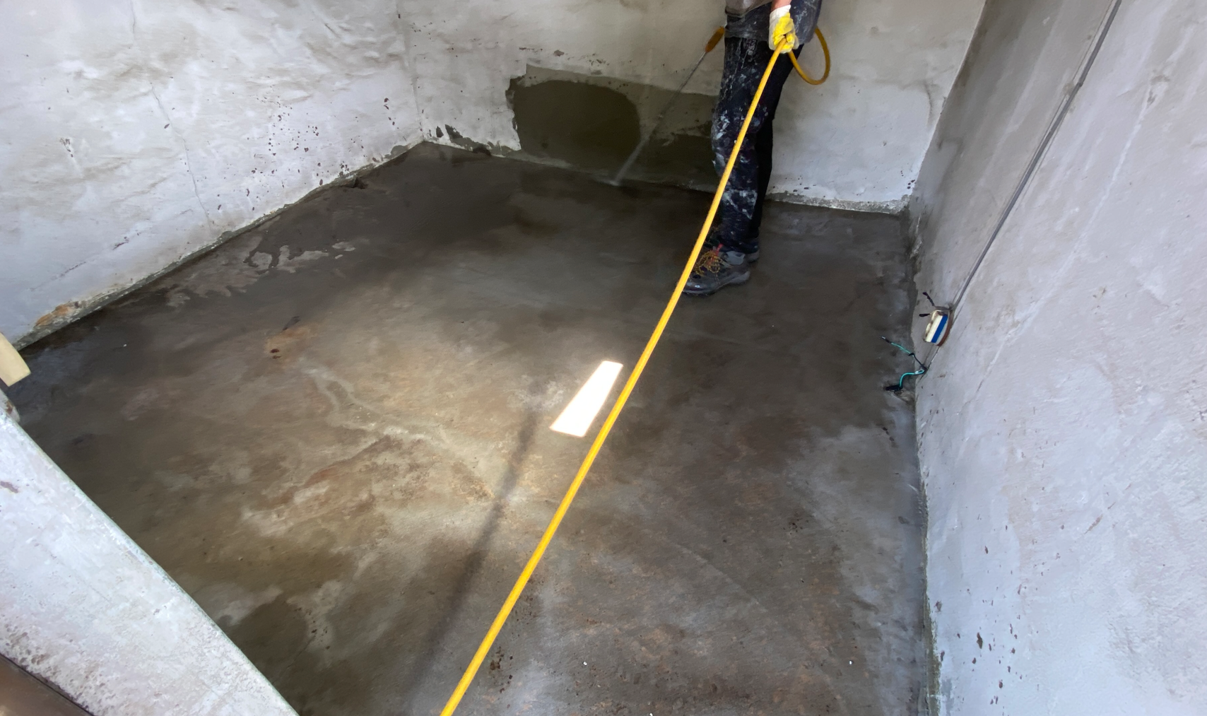 바닥에 부착한 방수시트는 아직 완벽하게 바닥과 일체화되지 않은 상태입니다. 시트가 바닥에서 들떠 빈 공간이 생기게 되면 그 틈으로 누수가 발생할 수 있기 때문에 일체화시켜 주는 것이 좋은데요. 이를 위해 바닥 시트 위에 침투 방수액을 전체적으로 도포해 줍니다. 이 작업을 함침 작업이라고 부릅니다.