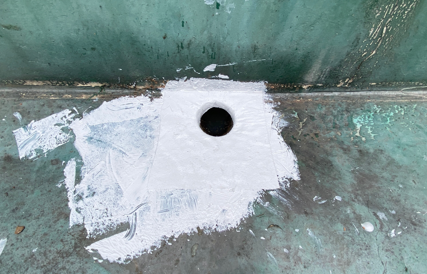 하자에 취약하여 누수가 잘 발생하는 우수관과 조인트 부분에는 기초 시트 작업을 해주는 것이 좋습니다. 기초 시트 작업은 방수액과 방수시트를 함께 사용하여 누수에 취약한 부분을 보강하기 위한 작업입니다. 방수액을 칠한 후 시트를 부착하고 다시 방수액을 도포하여 마무리합니다.