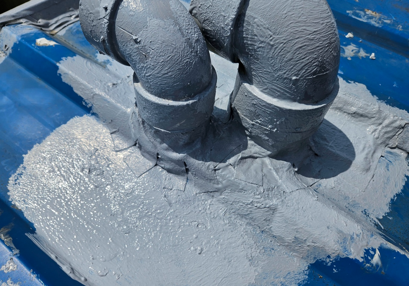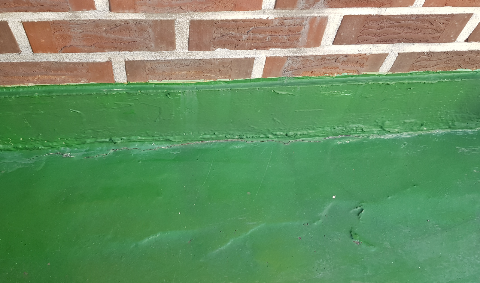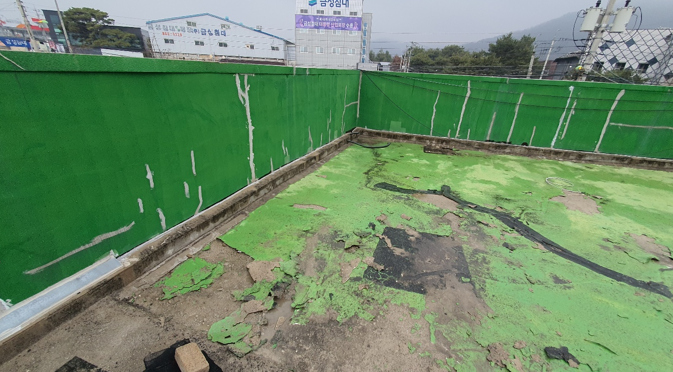 대표적은 방수 페인트인 우레탄으로 시공한 옥상에 하자가 발생한 모습입니다. 벽체와 바닥에 크랙이 생겨 버티지 못하고 터져 버린 것을 볼 수 있습니다. 옥상에 크랙이 생기면 이렇게 방수 페인트가 터져버리기 때문에 크랙을 확실하게 잡을 수 있는 방수시트를 부착한 후 그 위에 방수 페인트를 칠하는 것이 좋습니다.