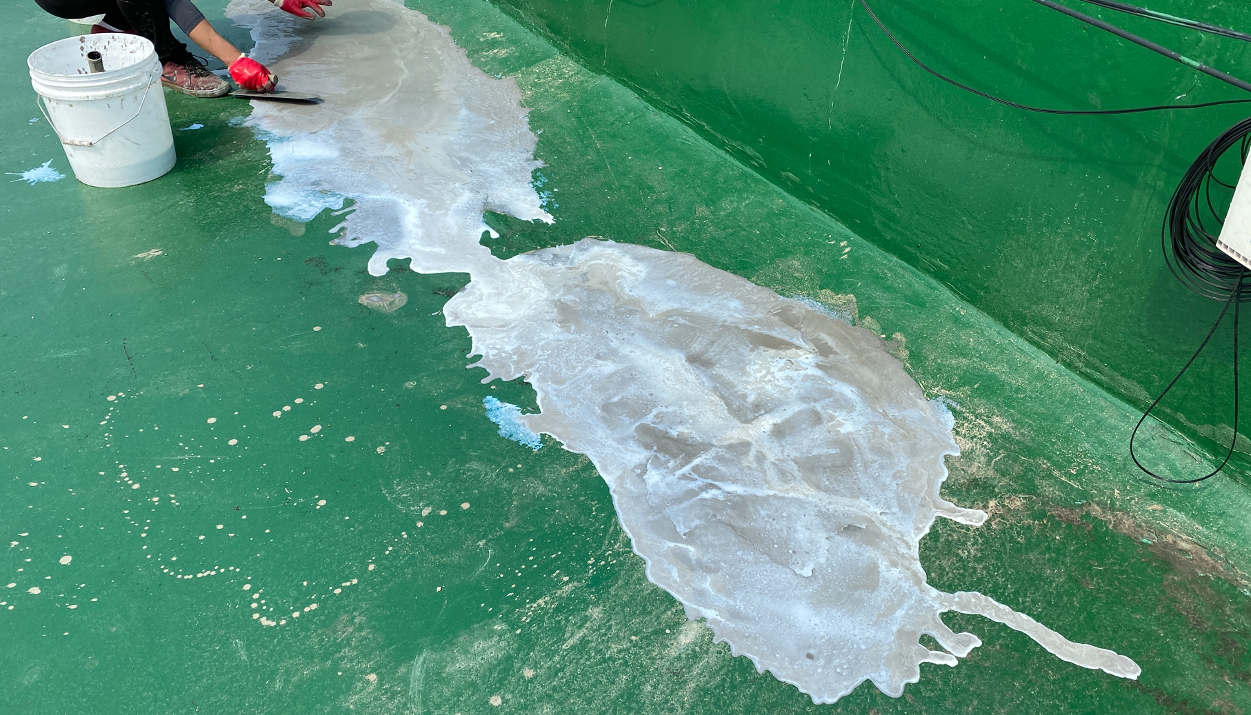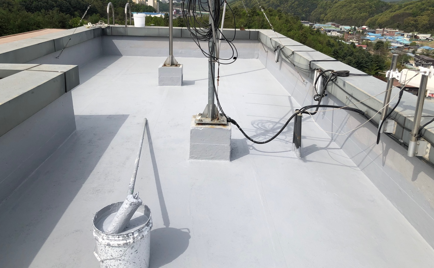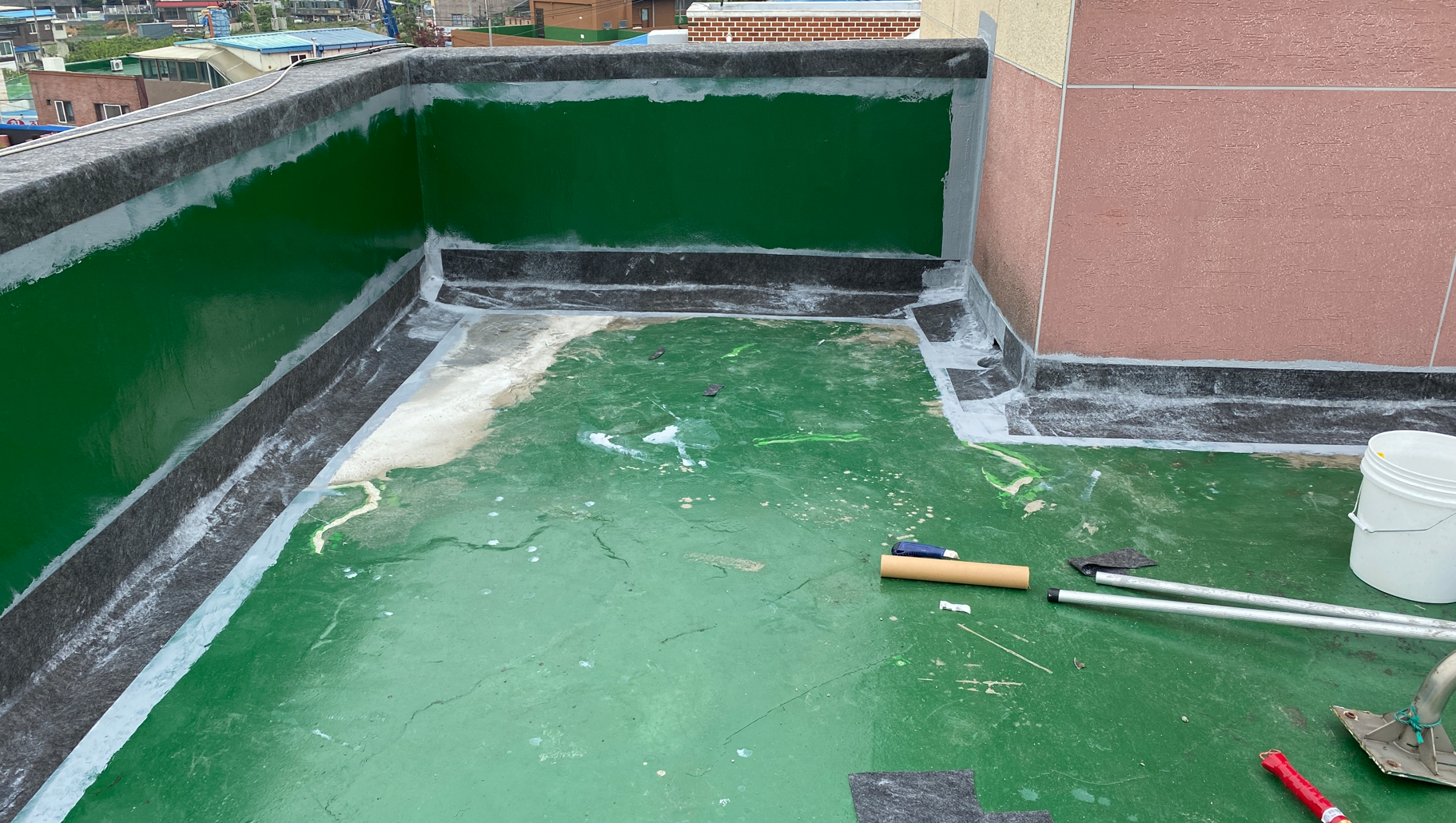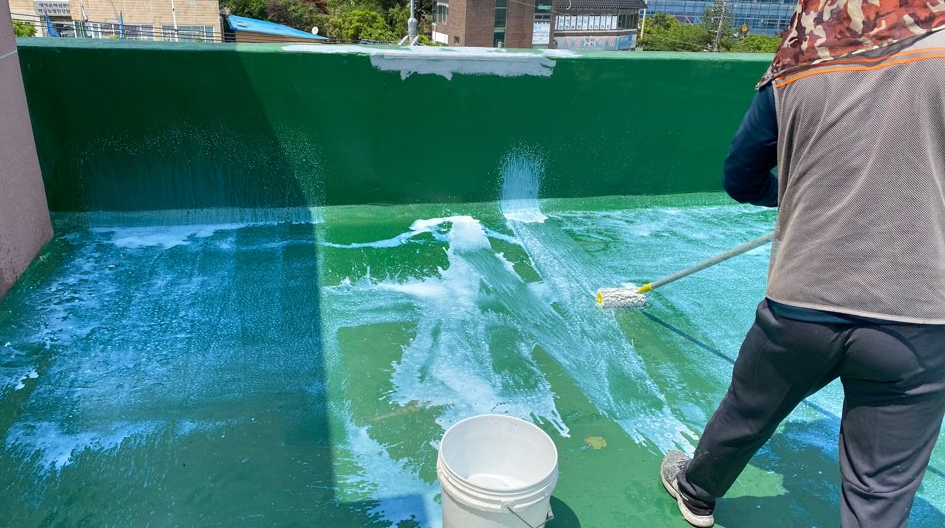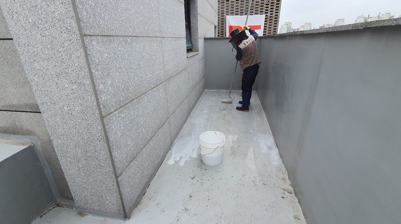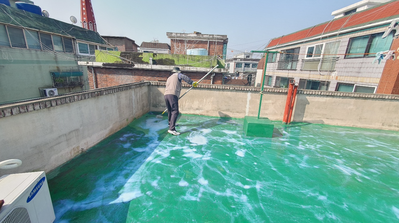 이제 방수시트 작업을 모두 마무리했으니 방수액 도포 작업을 진행합니다. 작업에 사용하는 방수액은 돌가루를 원료로 만든 친환경 방수액입니다. 천연 재료를 사용했기 때문에 인체에 무해하고 시공 후에도 자극적인 기름 냄새가 없어 메스꺼움이나 두통 등의 문제가 없는 것이 장점입니다.