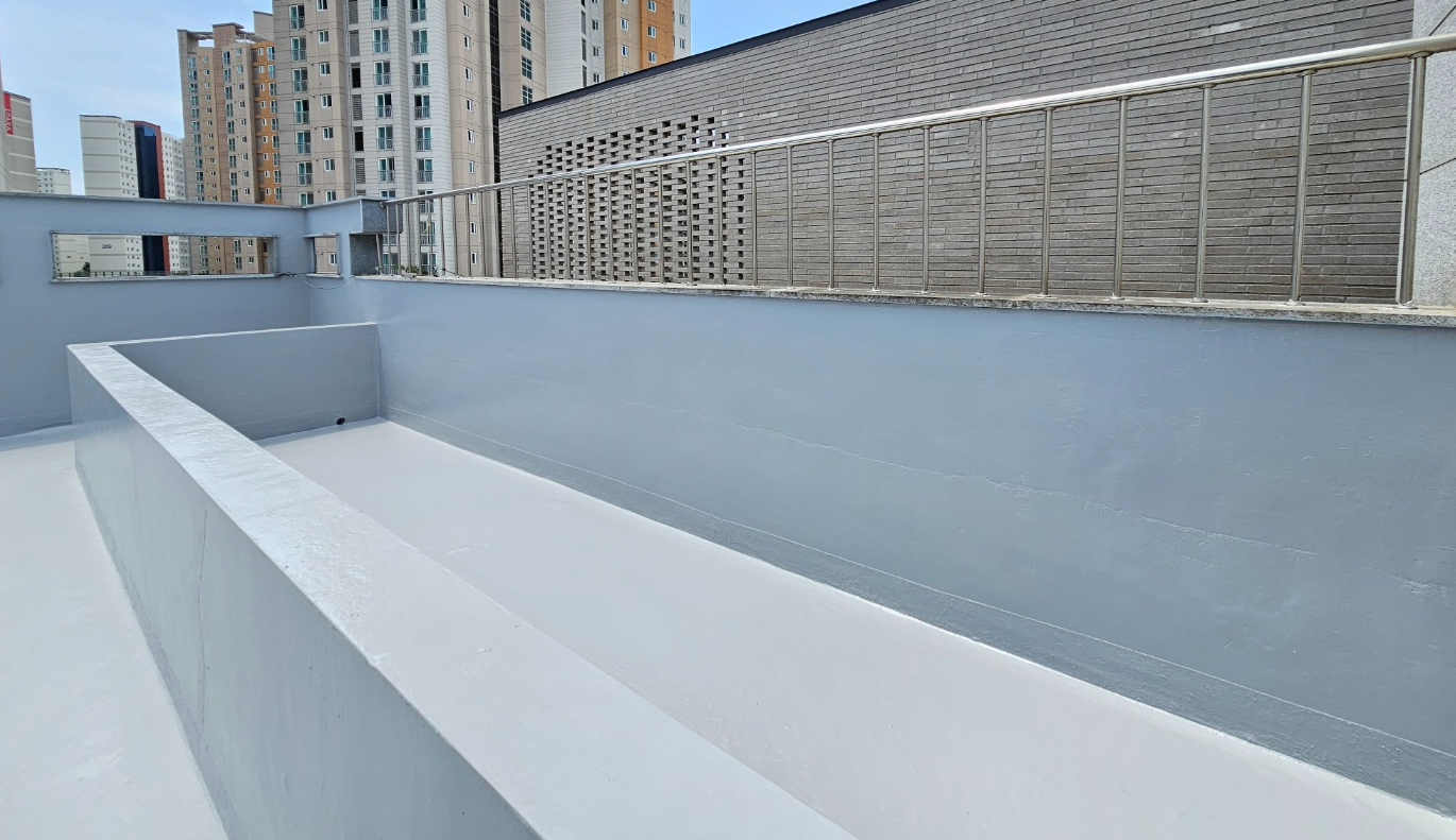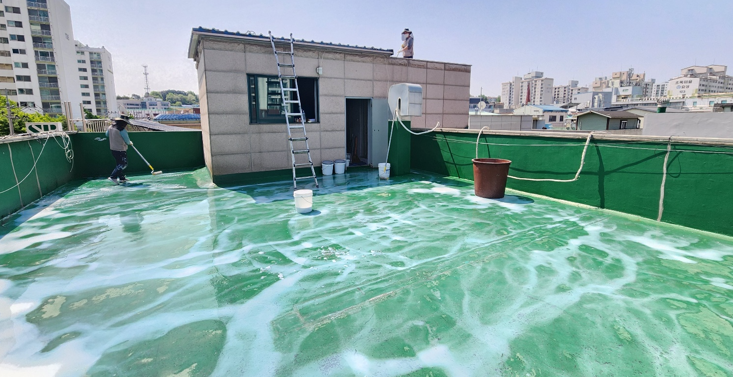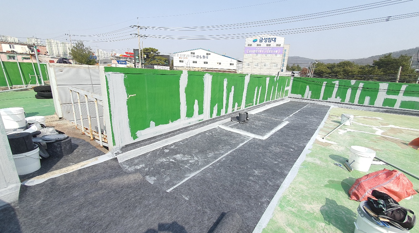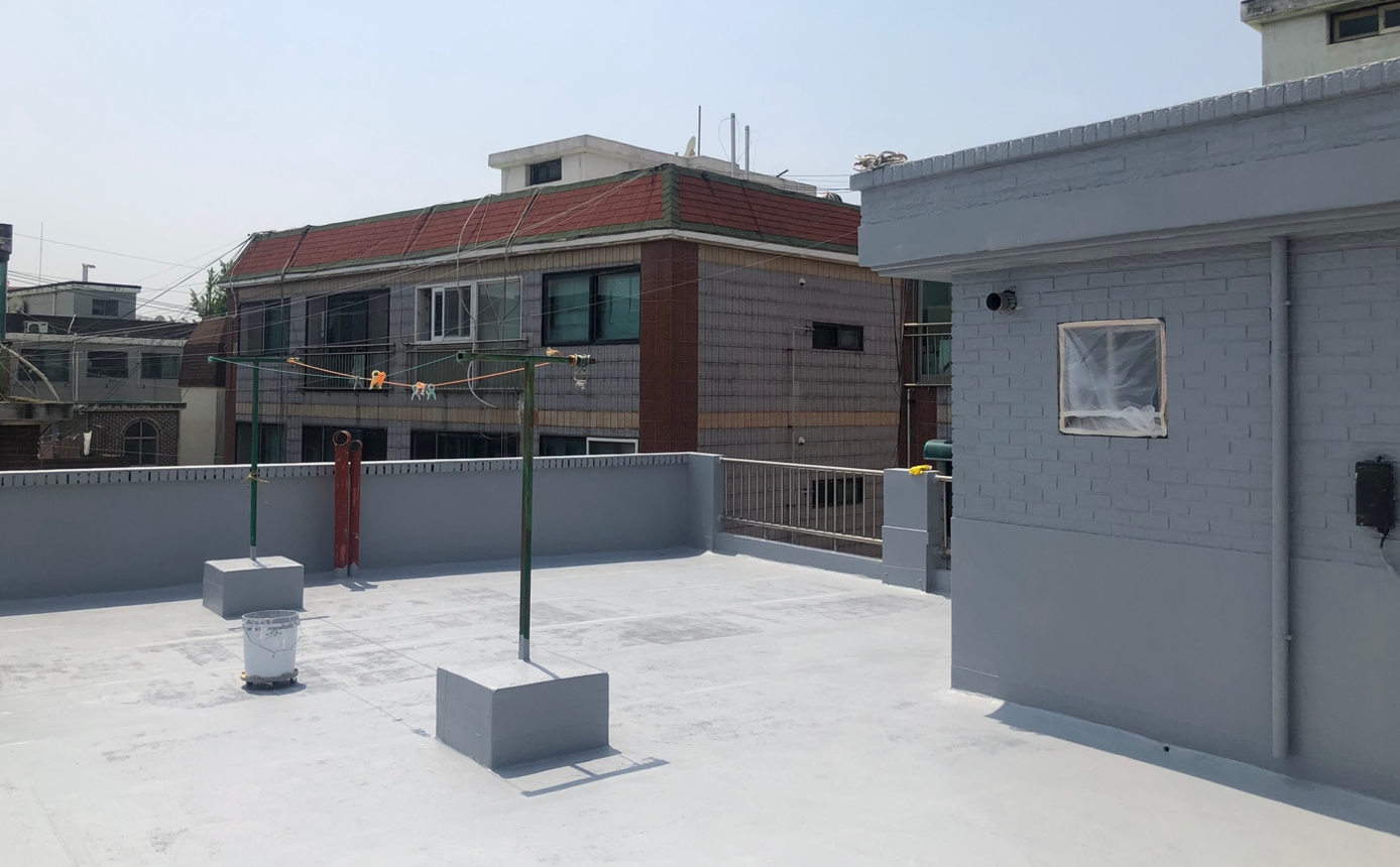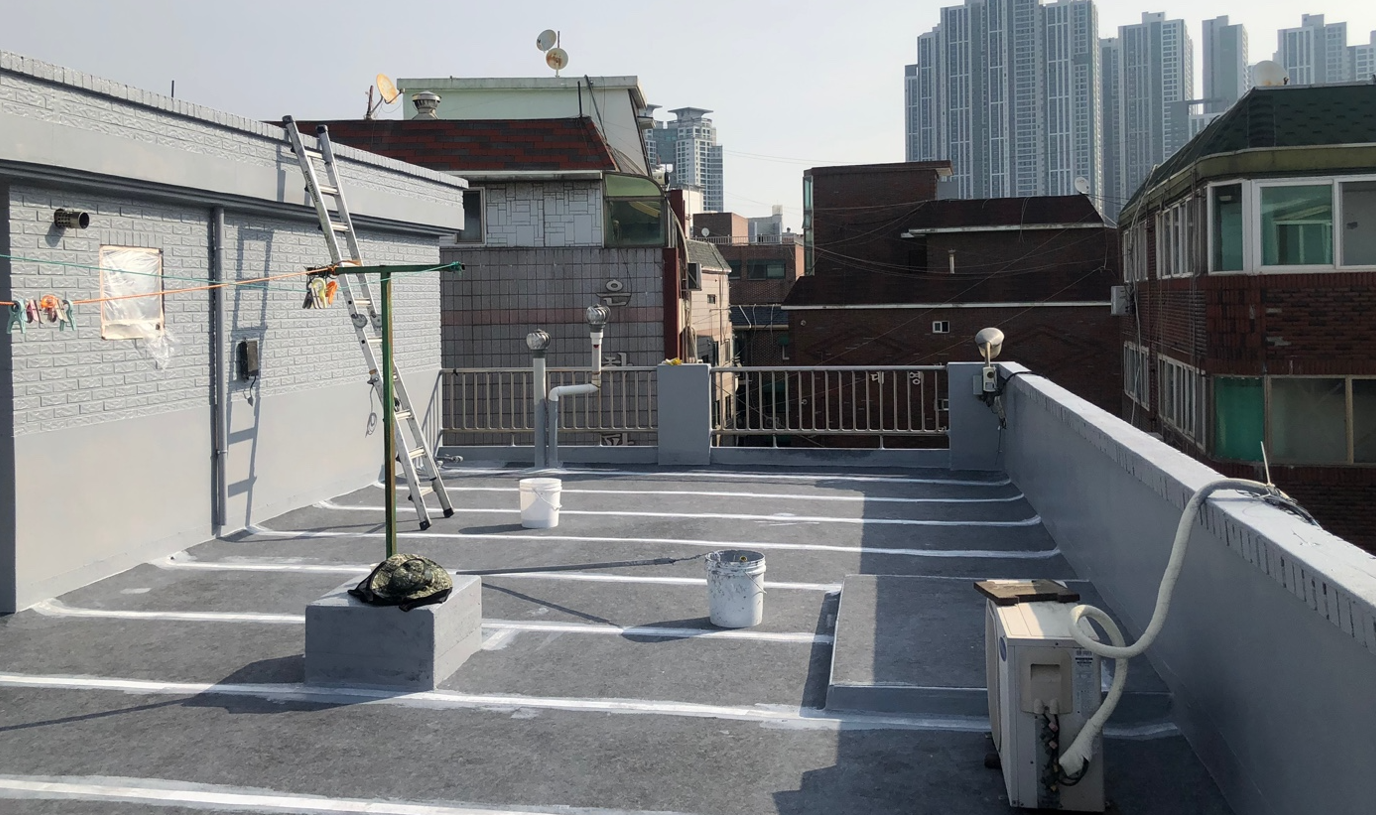 상도 작업을 마지막으로 모든 작업이 마무리됩니다. 상도는 물이 고이는 곳에는 필수적으로 해주는 것이 좋습니다. 이처럼 방수시트로 옥상의 크랙을 잡아주고 방수액을 두텁게 칠해 시공을 한다면 방수 페인트의 하자를 해결할 수 있습니다. 완성된 옥상은 이후 상처가 나더라도 그 부분만 고쳐서 계속 사용할 수 있습니다.