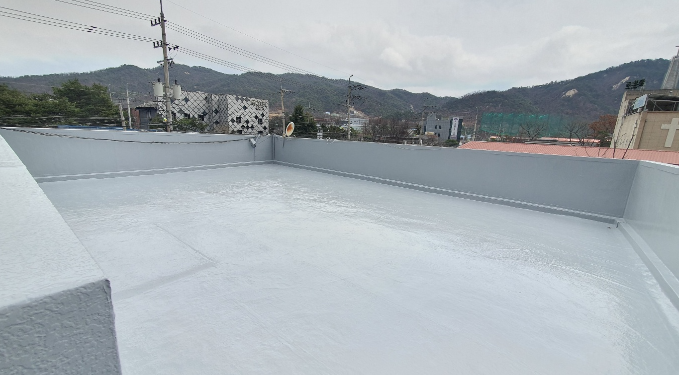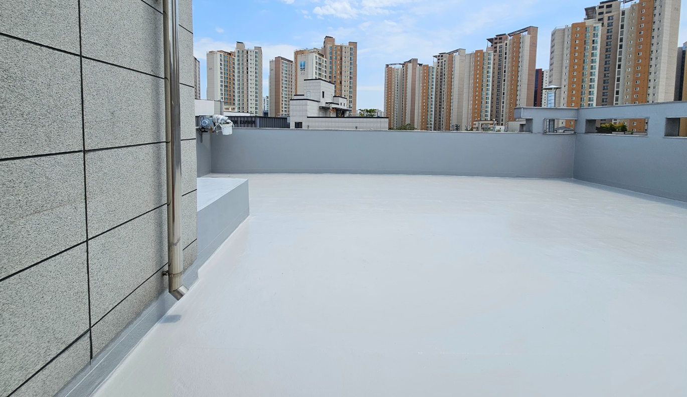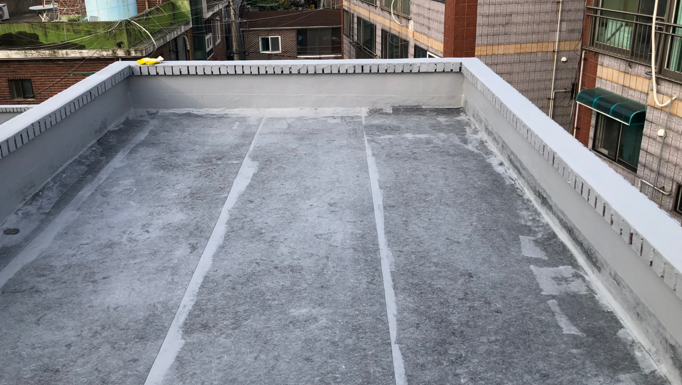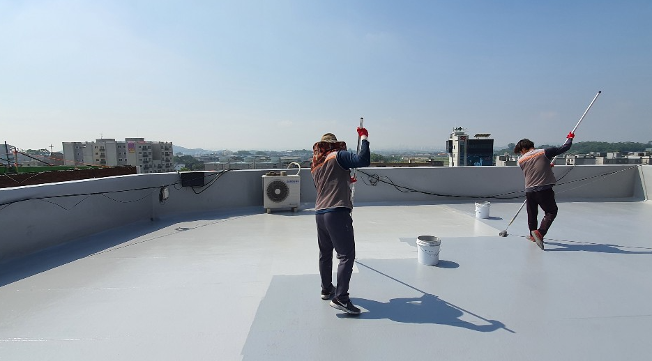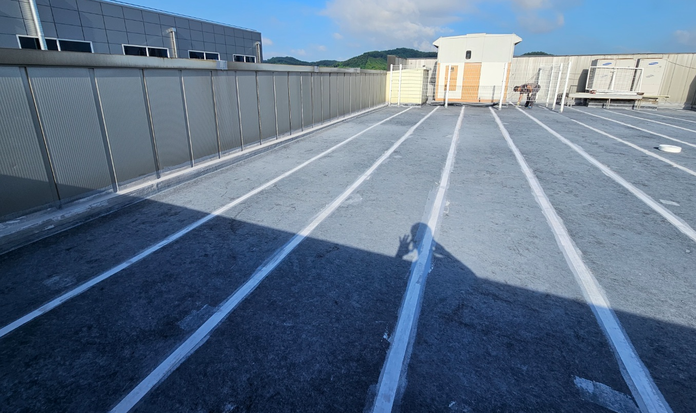 상도 작업을 마지막으로 모든 작업이 마무리됩니다. 상도는 물이 고이는 곳에는 필수적으로 해주는 것이 좋습니다. 이처럼 방수시트로 옥상의 크랙을 잡아주고 방수액을 두텁게 칠해 시공을 한다면 방수 페인트의 하자를 해결할 수 있습니다. 완성된 옥상은 이후 상처가 나더라도 그 부분만 고쳐서 계속 사용할 수 있습니다.