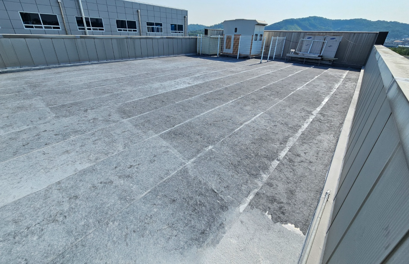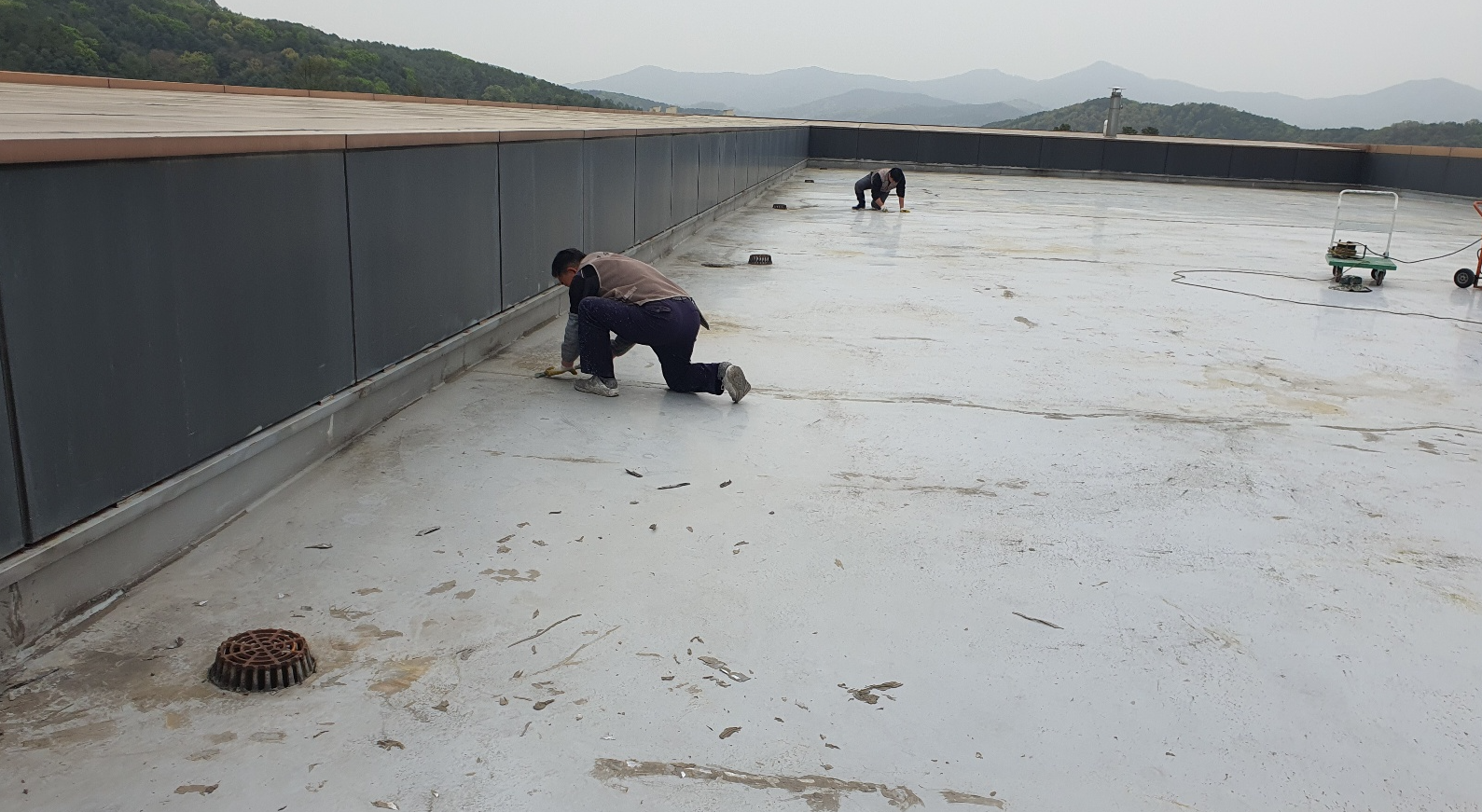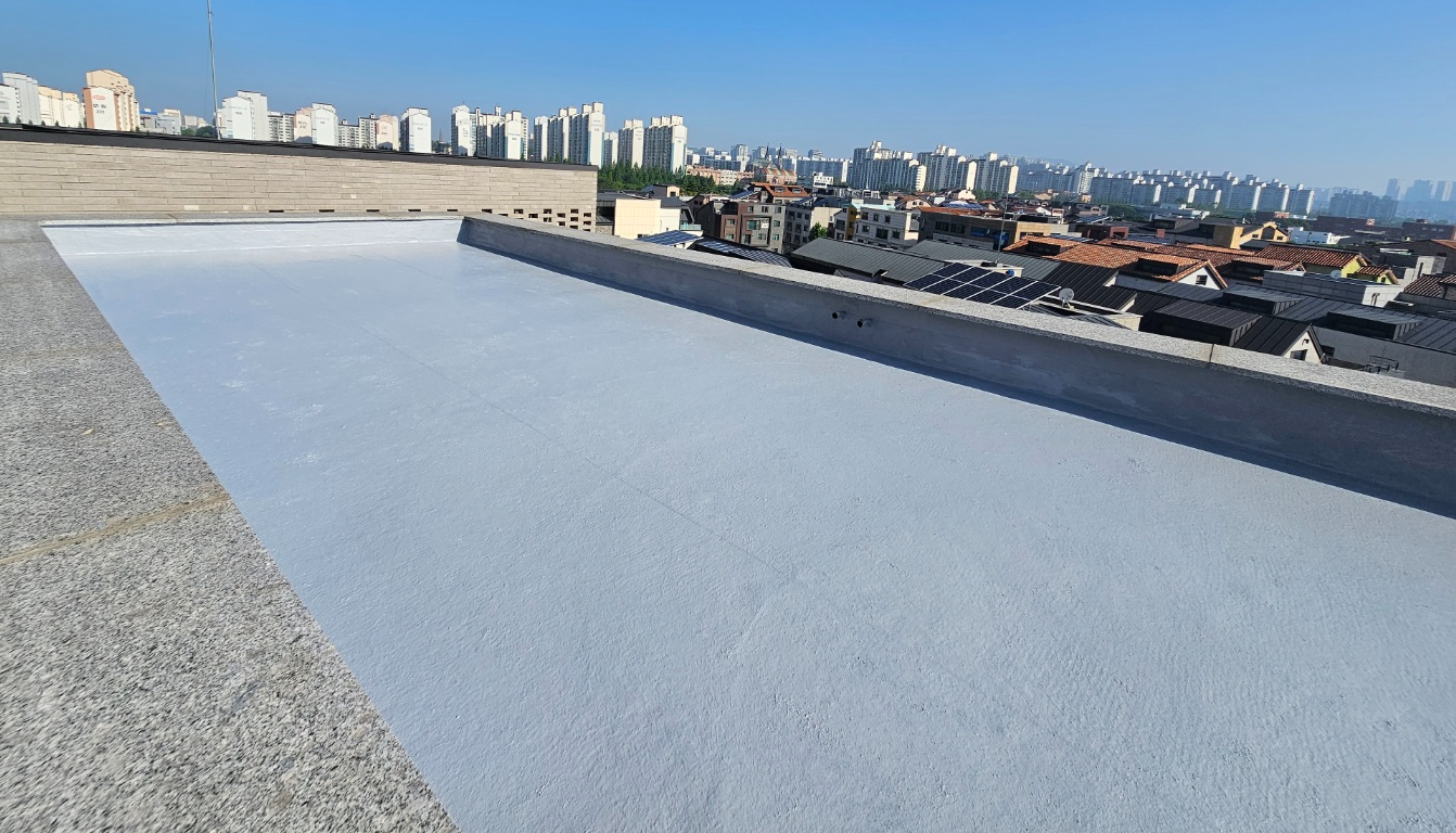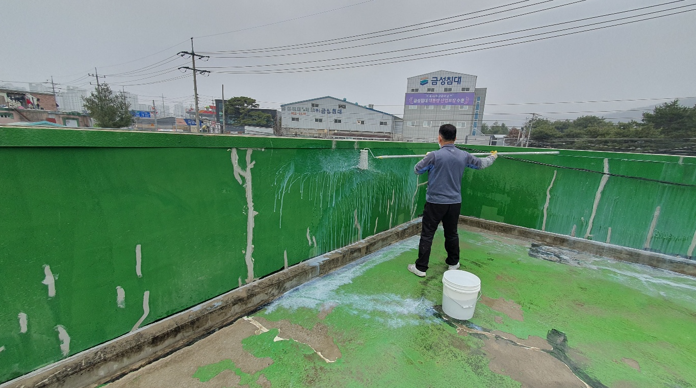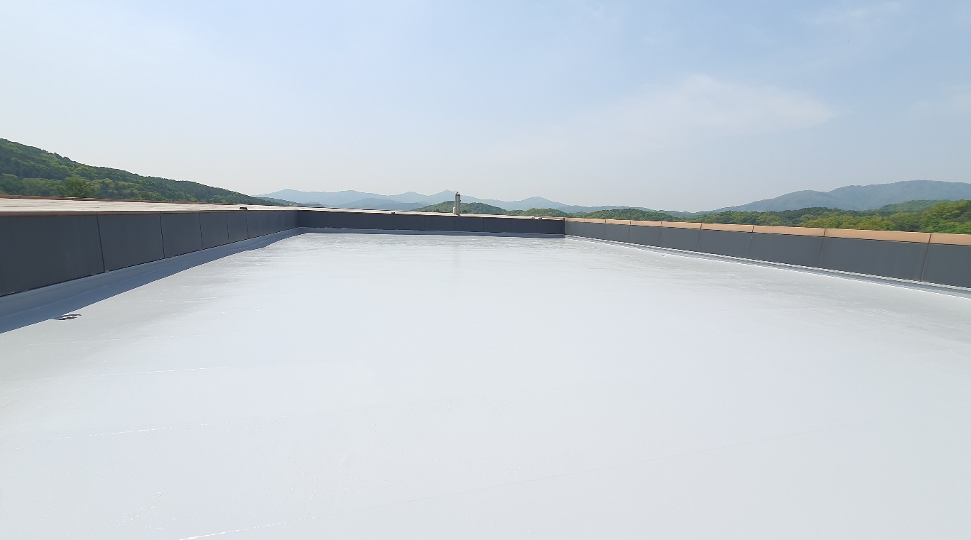 상도 작업을 마지막으로 모든 작업이 마무리됩니다. 상도는 물이 고이는 곳에는 필수적으로 해주는 것이 좋습니다. 이처럼 방수시트로 옥상의 크랙을 잡아주고 방수액을 두텁게 칠해 시공을 한다면 방수 페인트의 하자를 해결할 수 있습니다. 완성된 옥상은 이후 상처가 나더라도 그 부분만 고쳐서 계속 사용할 수 있습니다.