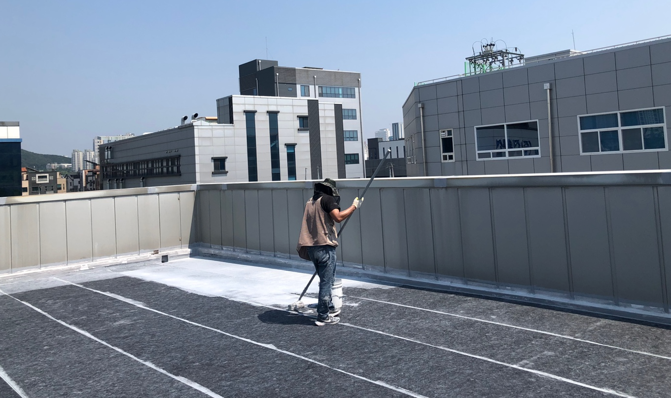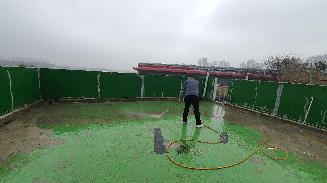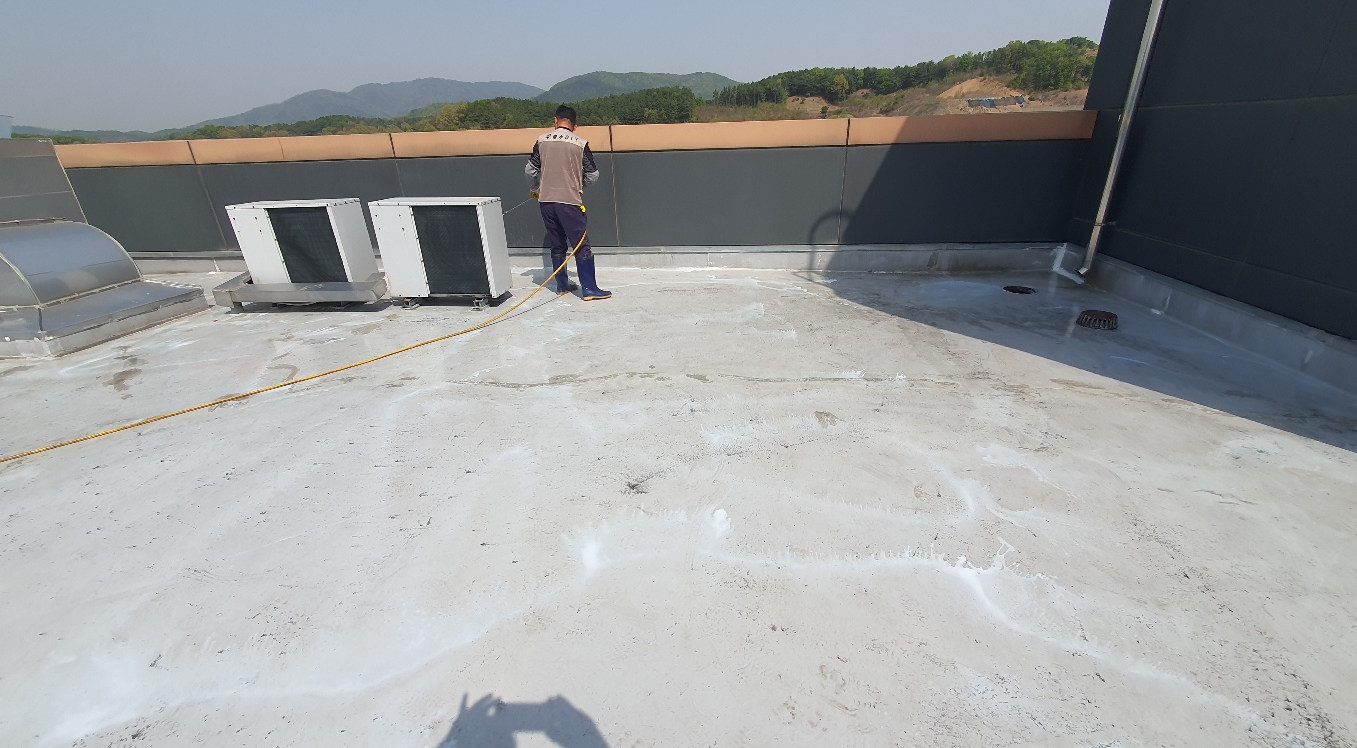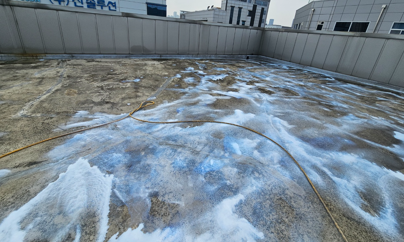 고압 세척기로 물청소까지 마친 후 프라이머 작업에 들어갑니다. 프라이머 작업은 옥상 전체에 침투 방수액을 도포하는 작업입니다. 침투 방수액이 옥상 전체에 스며들게 되면 모체를 강화시켜 기초적인 방수 효과를 줄 수 있고 미세하게 남은 먼지와 각종 이물질을 흡착하여 제거할 수 있습니다.