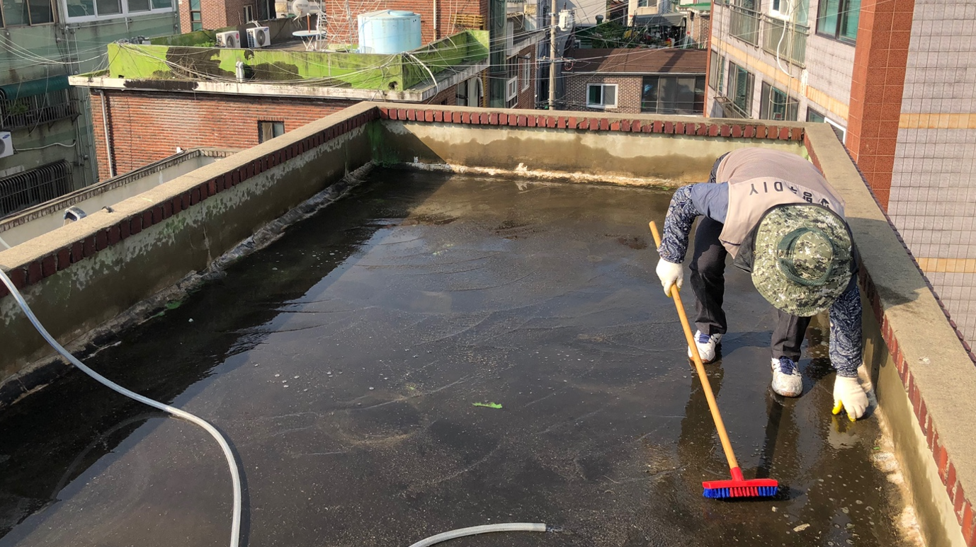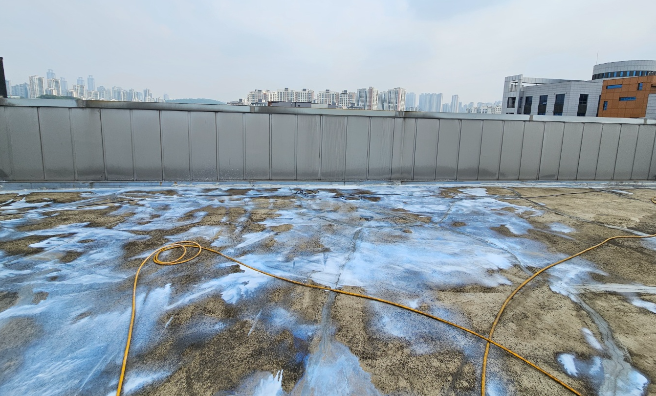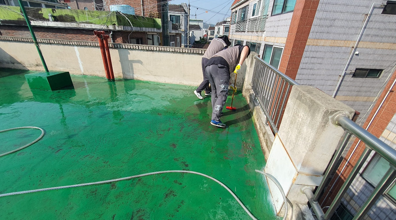 고압 세척기로 물청소까지 마친 후 프라이머 작업에 들어갑니다. 프라이머 작업은 옥상 전체에 침투 방수액을 도포하는 작업입니다. 침투 방수액이 옥상 전체에 스며들게 되면 모체를 강화시켜 기초적인 방수 효과를 줄 수 있고 미세하게 남은 먼지와 각종 이물질을 흡착하여 제거할 수 있습니다.