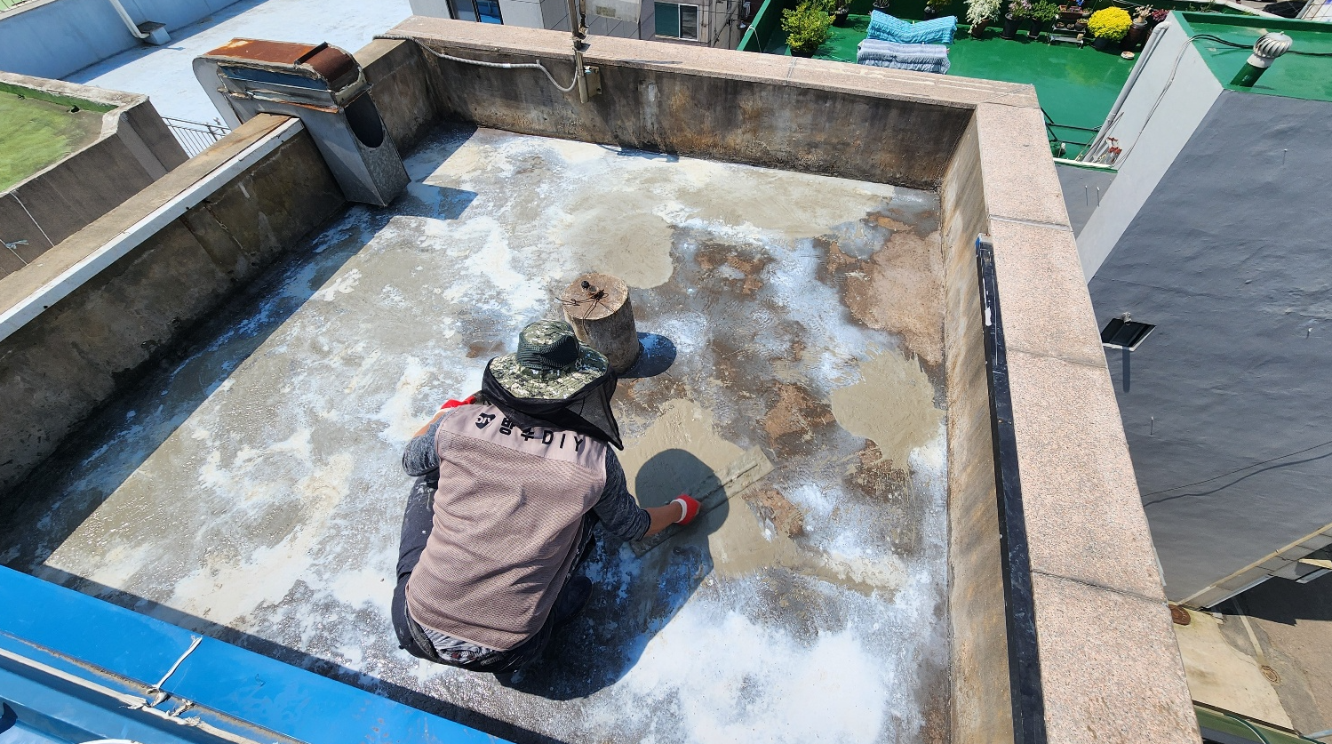 시공을 하기 전의 옥상에는 하자로 인한 단차가 있을 수 있습니다. 이렇게 바닥에 단차가 있으면 크랙을 잡기 위해 방수시트를 부착할 때 어려움이 있을 수 있기 때문에 미장 작업을 해서 평탄화해 주는 것이 좋습니다. 미장은 침투 방수액과 몰탈을 절절하게 섞어서 작업을 진행합니다.