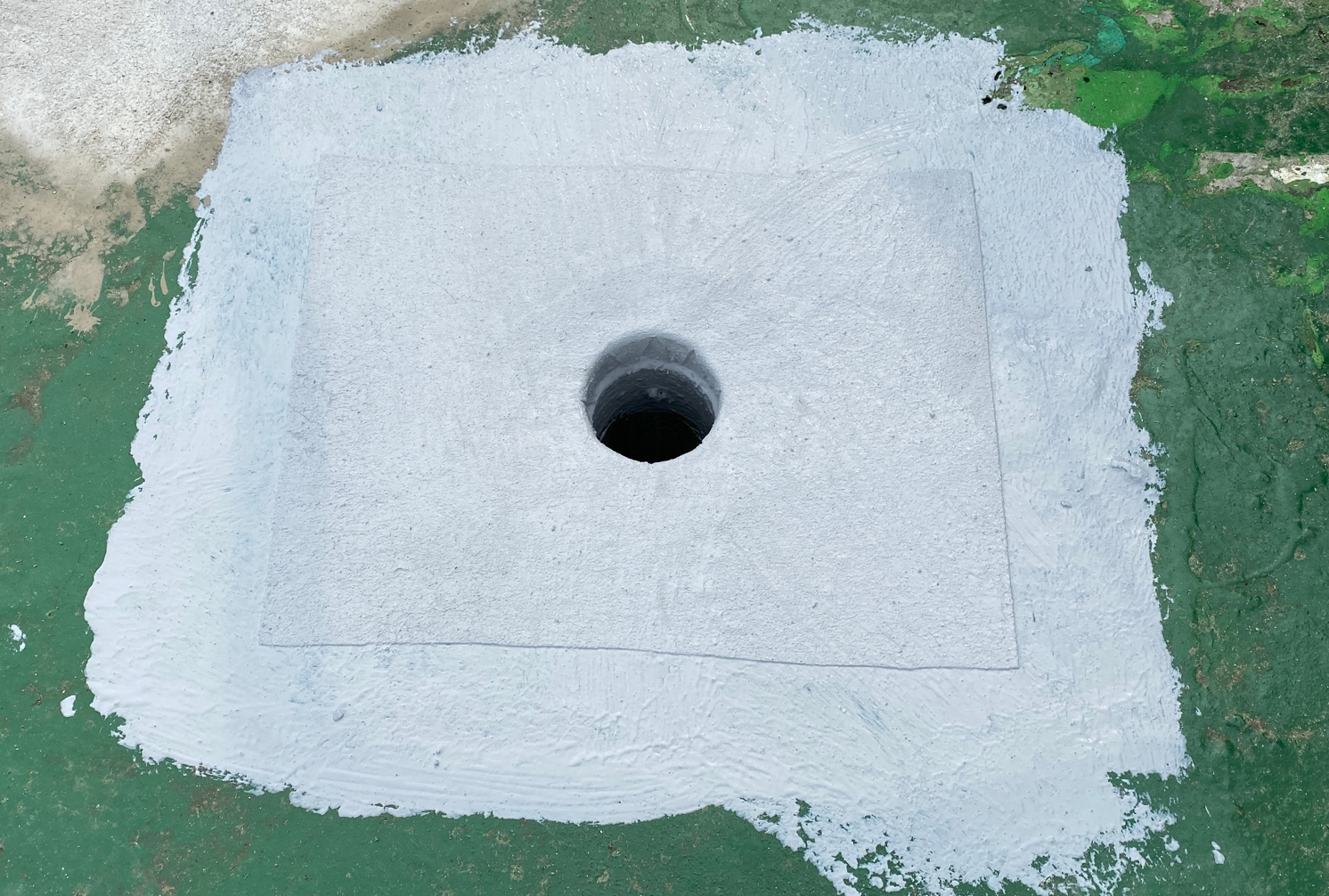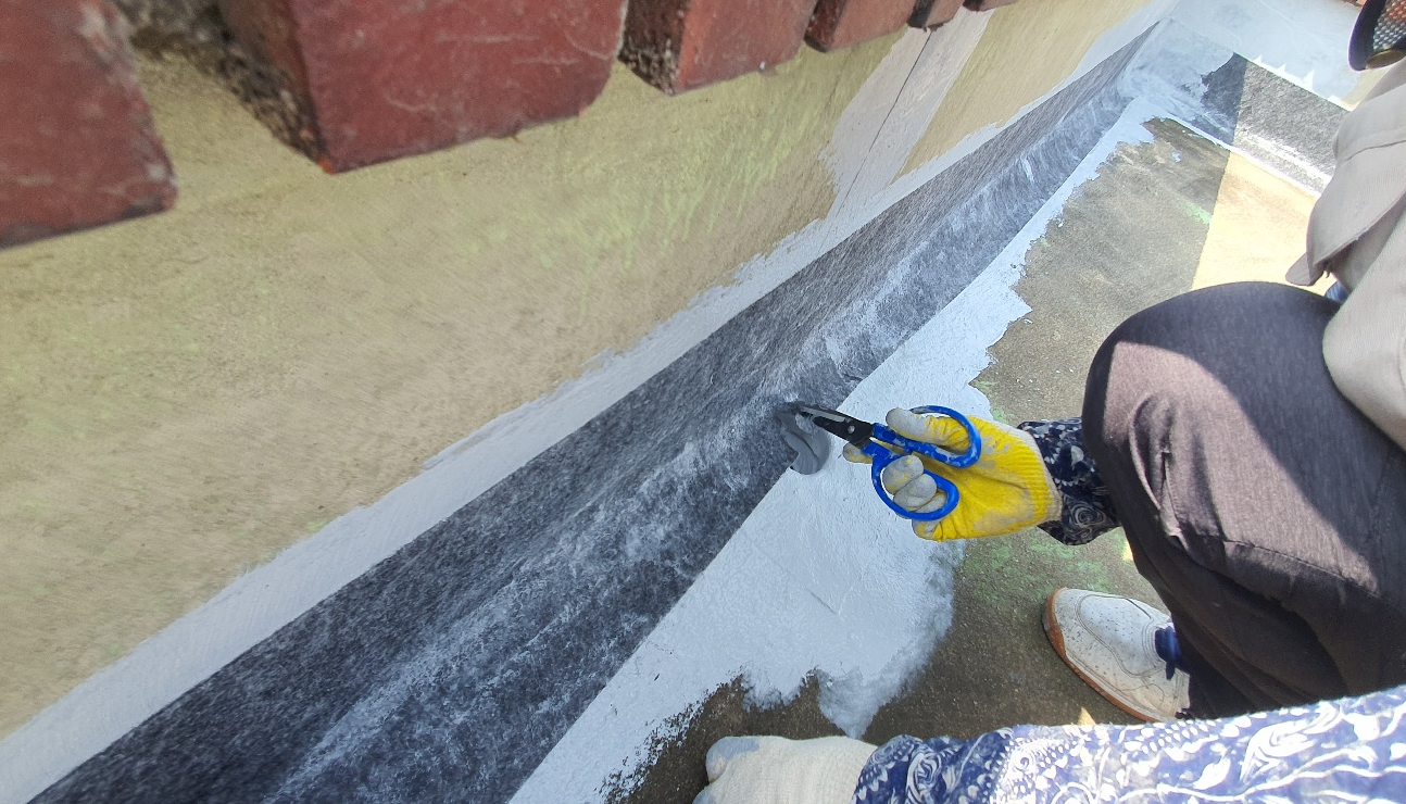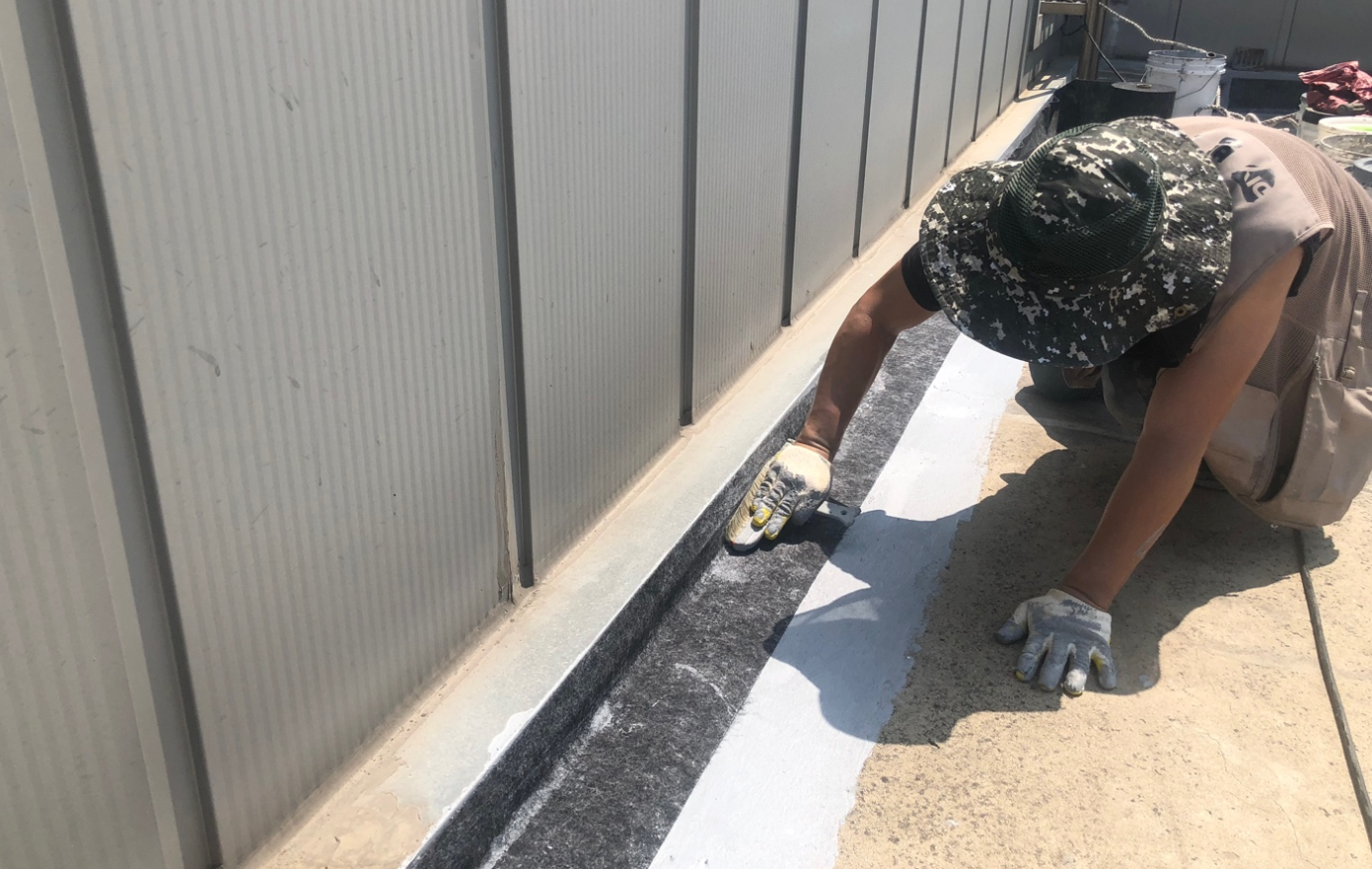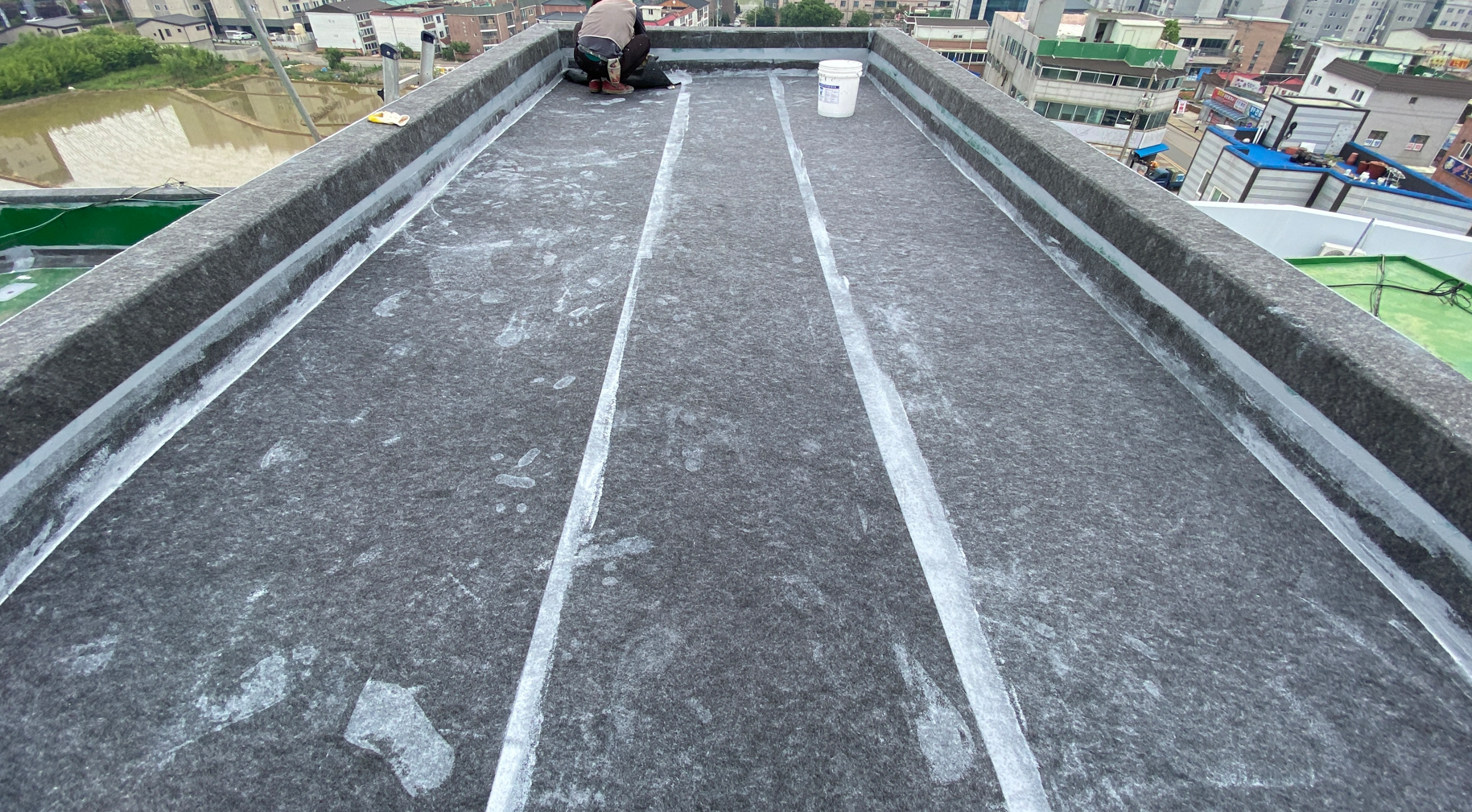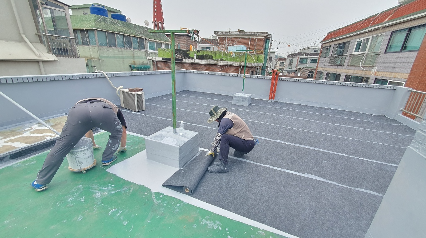 다음으로 옥상 바닥 전체에 방수시트를 부착합니다. 옥상의 크랙을 잡기 위해 방수액을 먼저 칠한 후 방수시트를 꼼곰하게 부착합니다. 방수시트를 부착한 후에는 바닥과 일체화시키기 위해 함침 작업을 진행합니다. 함침은 침투 방수액을 방수시트 위에 전체적으로 도포하는 작업입니다.